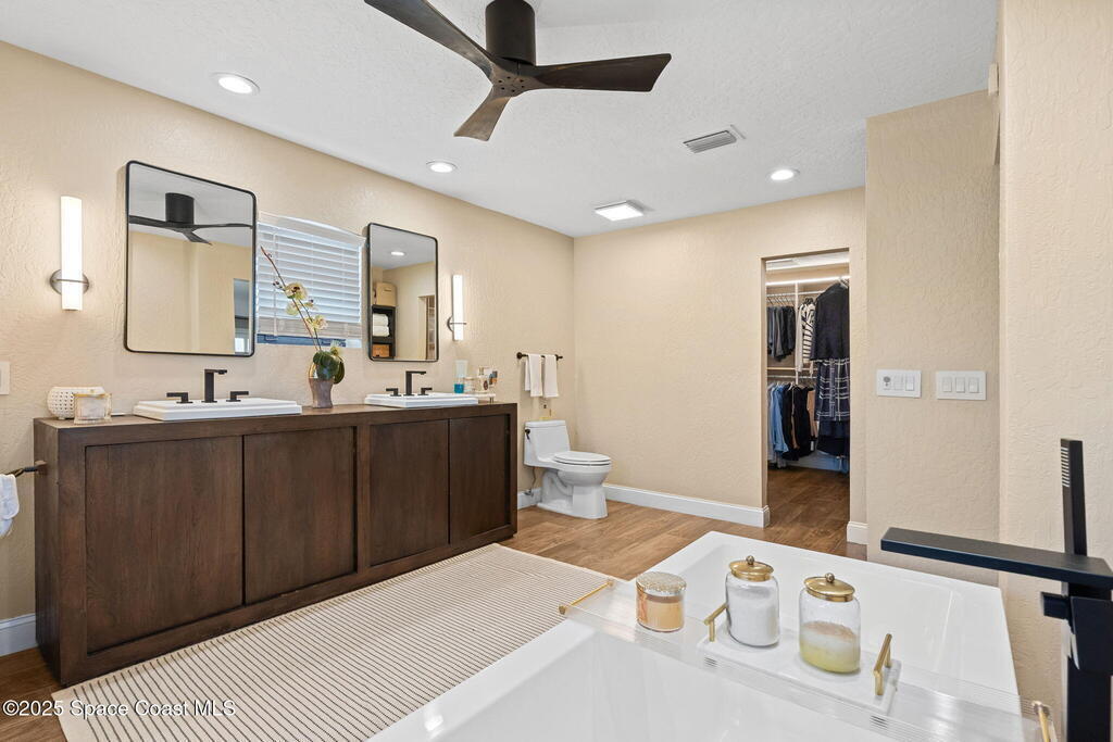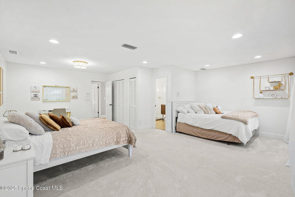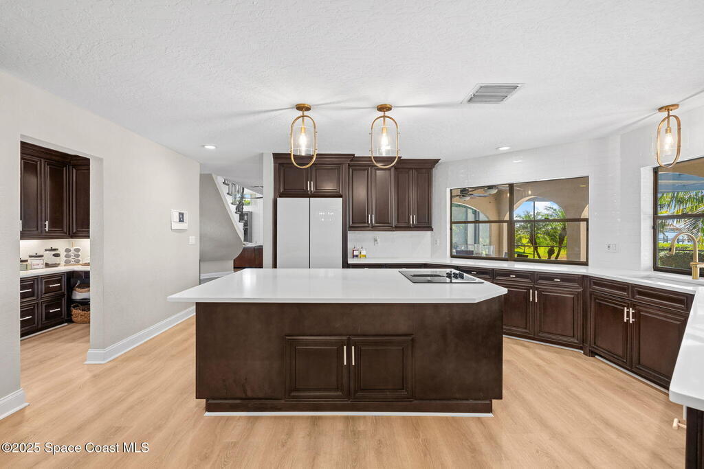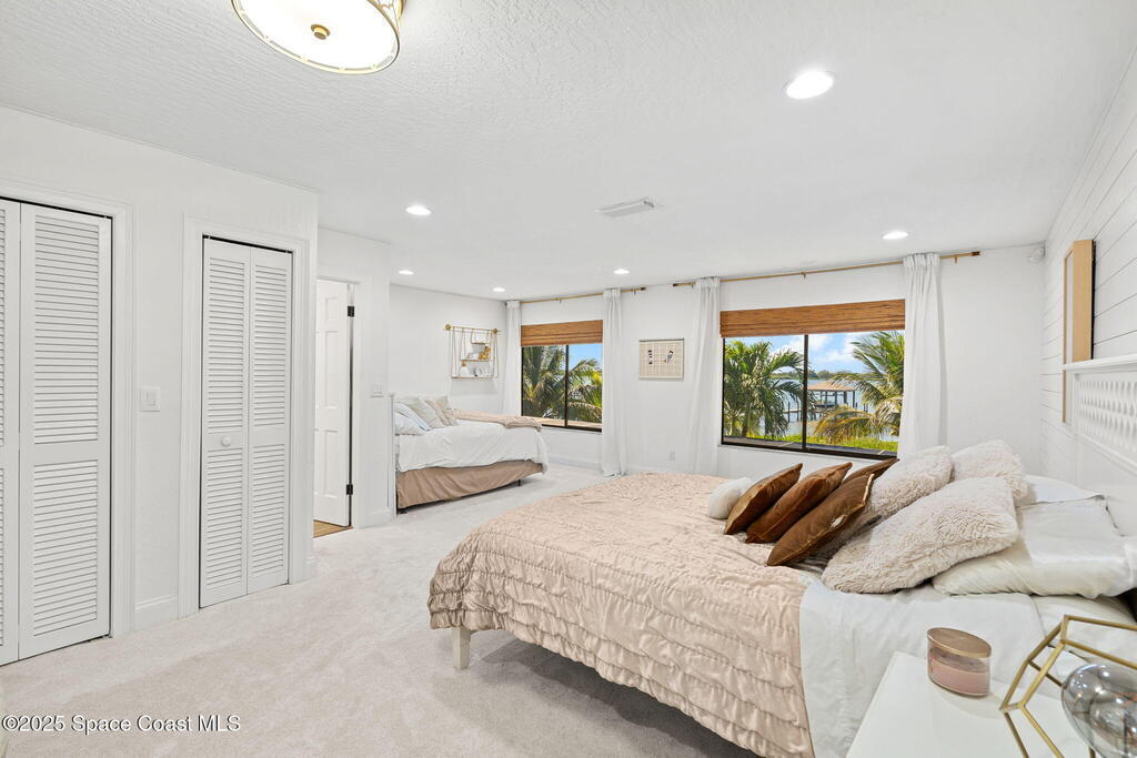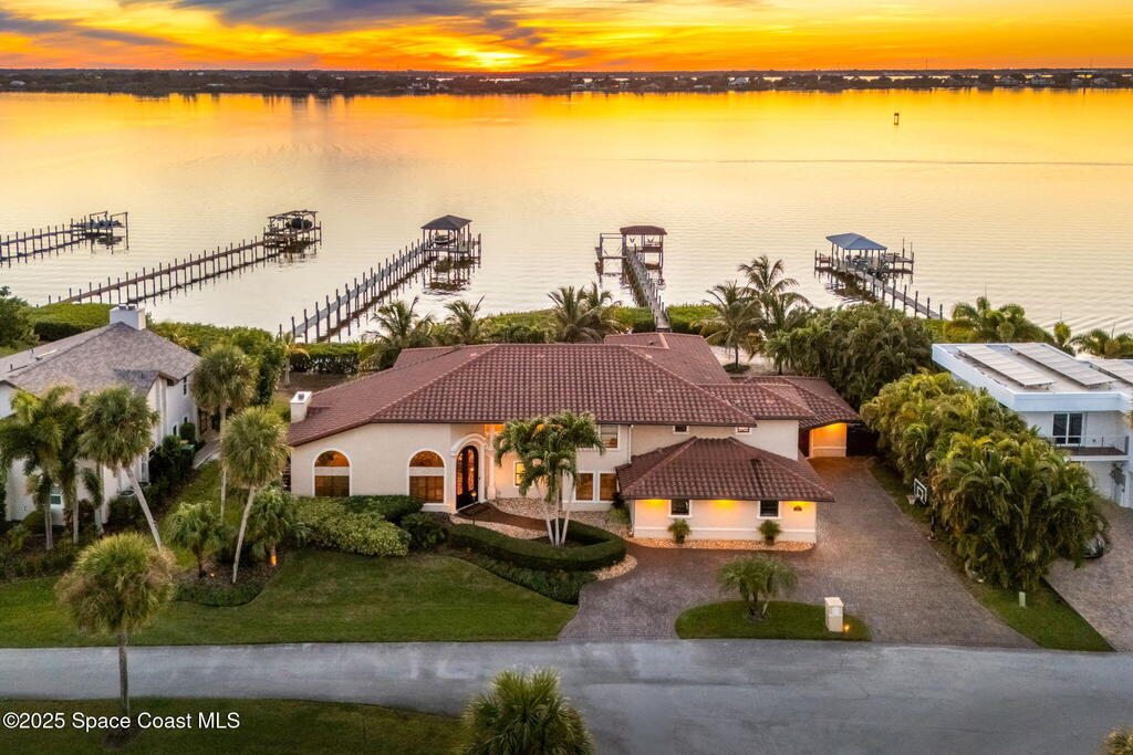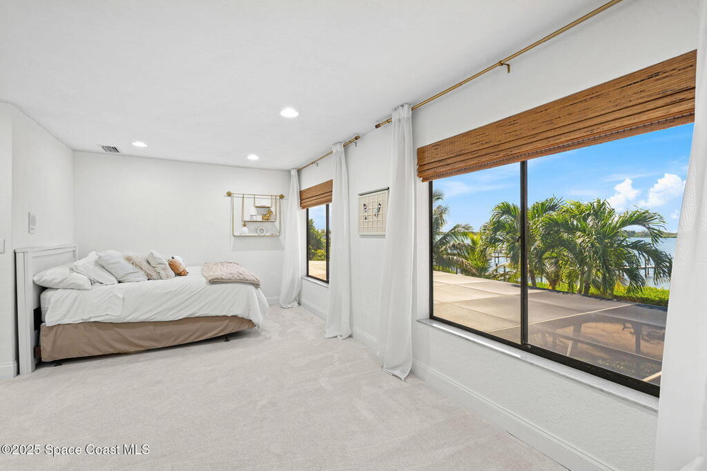 Welcome to a true waterfront retreat on the coveted Tortoise Island, offering 120 feet of direct Banana River frontage, stunning sunsets, and water views the moment you step inside. The home has been tastefully renovated throughout, and nearly every room overlooks the river through expansive windows that fill the interiors with natural light. The main living area features soaring vaulted ceilings and a wall of glass that frames the water from the kitchen, family room, dining area, and more. Upstairs, the primary suite feels like a private escape with its own screened-in balcony, a renovated spa-like bath, and a custom walk-in closet. All bedrooms throughout the home are exceptionally spacious with comfortable layouts and beautiful natural light.The kitchen blends style and function with a large quartz island, modern appliances, a separate butler's pantry and coffee bar, and a wet bar ideal for entertaining.