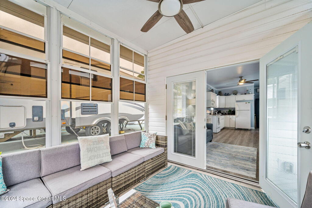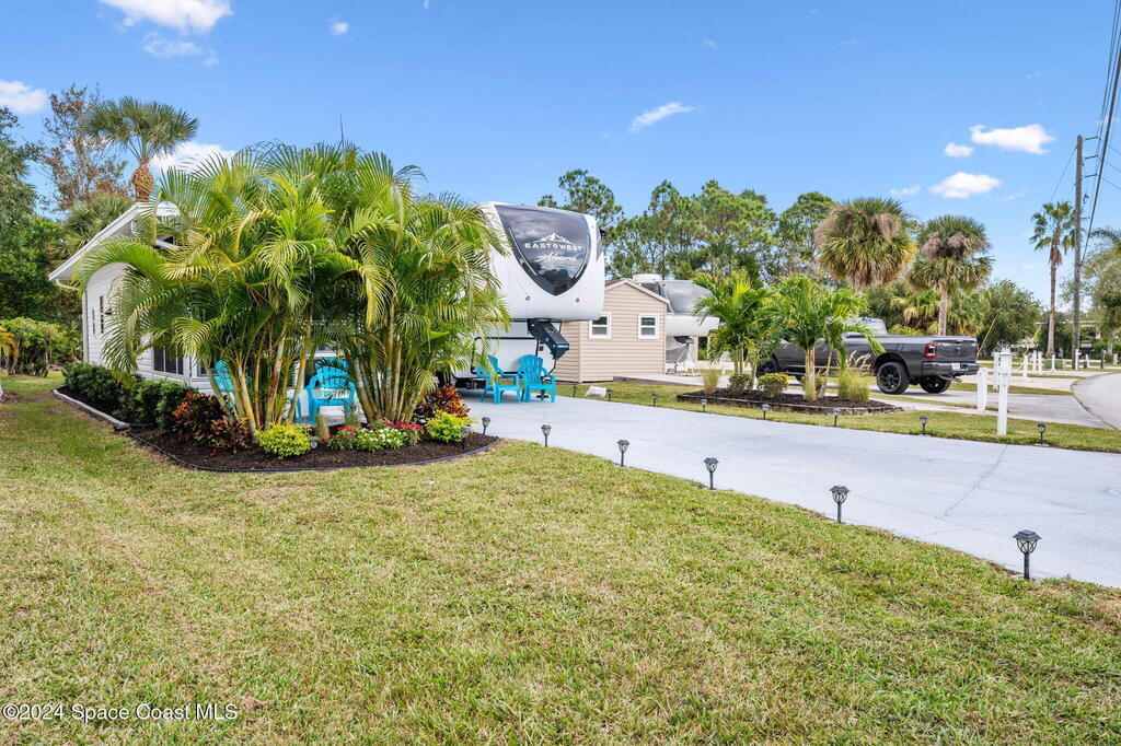 BEAUTIFUL MOVE IN READY ''GREAT OUTDOORS RESORT'' PROPERTY! UPDATED EXECUTIVE SUITE WITH RV PARKING WITH HOOKUPS! LARGE NEWLY LANDSCAPED BACK AND FRONT YARD! VINYL WOOD FLOORING THROUGHOUT! SPACIOUS SHED FOR STORAGE. WASHER AND DRYER IN HOME STAYS! WALKING DISTANCE TO ALL AMENITIES! LOT IS 78FT X 18 FT. FULL KITCHEN AND BATH WITH MITSUBISHI AC SPLIT SYSTEM. BONUS ROOM INCLUDED!! . LANDSCAPING IN FRONT AND BACK IS GORGEOUS! COMES WITH LARGE SCREENED IN PATIO. TONS OF AMENITIES OFFERED IN COMMUNITY INCLUDING RESTAURANT, CHURCH, POST OFFICE, 2 POOLS, 2 HOT TUBS,LIBRARY, GYM AND FREE CLASSES, TENNIS, PICKLEBALL, DOG PARK, SHUFFLEBOARD, BOCCE , RV REPAIR CENTER ONSITE, LARGE EVENTS CENTER, GOLF COURSE, LIBRARY,NATURE TRAILS, AND 31 STOCKED FISHING PONDS. LAWN CUTTING AND FERTILIZATION, WATER/SEWER AND INTERNET INCLUDED!! BEAUTIFUL VIEWS OF LAUNCHES! CLOSE TO SPACE CENTER, BEACHES AND ORLANDO AIRPORT!!