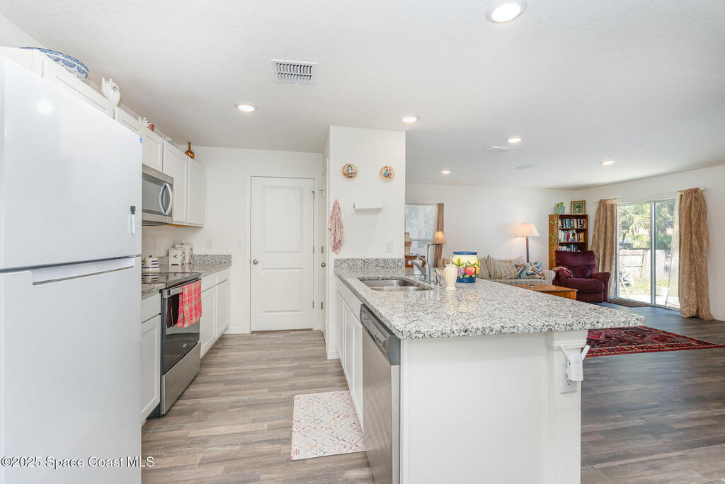 Nestled in the tree lined streets of Palm Bay, this 3 bed / 2 bath features an open floor plan, fruit trees and solar panels! The kitchen boasts granite countertops, white shaker cabinets, stainless steel appliances, and bar seating. The primary ensuite offers a double vanity with granite countertops and walk-in closet. Additional bedrooms offer maximum storage with walk-in closets. Vinyl plank in main living areas. Indoor laundry room. No water bill (well), no sewer bill (septic), and solar panels significantly reduce your electricity bill! Gardener's paradise with citrus, grape, cherry, pineapple, fig, bananas, mango, avocado, lettuce beds, elderberry, basil and so much more! Minutes away from major shopping centers, restaurants, parks, and quick access to I95.