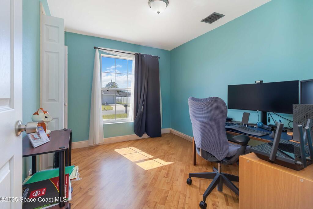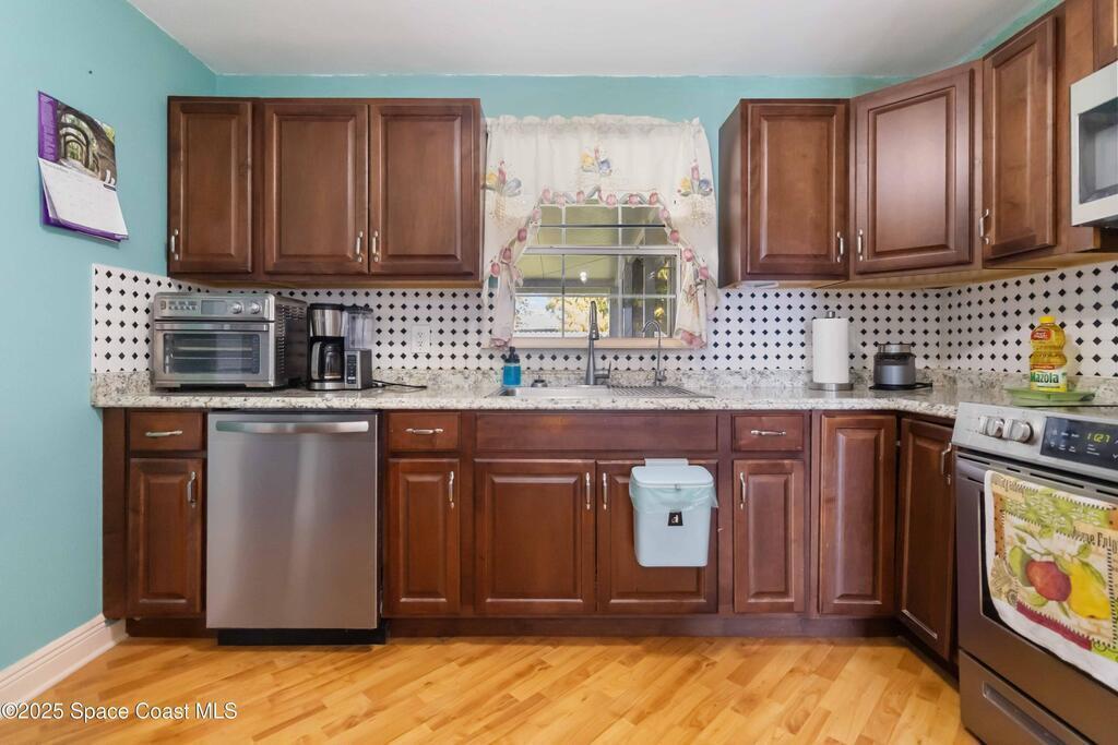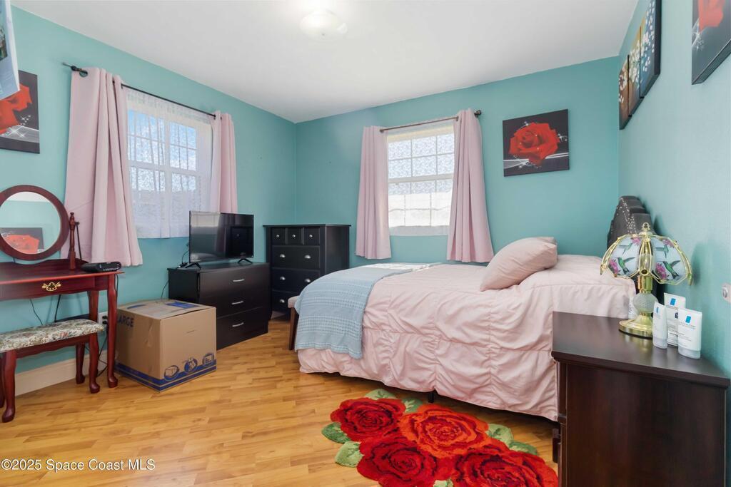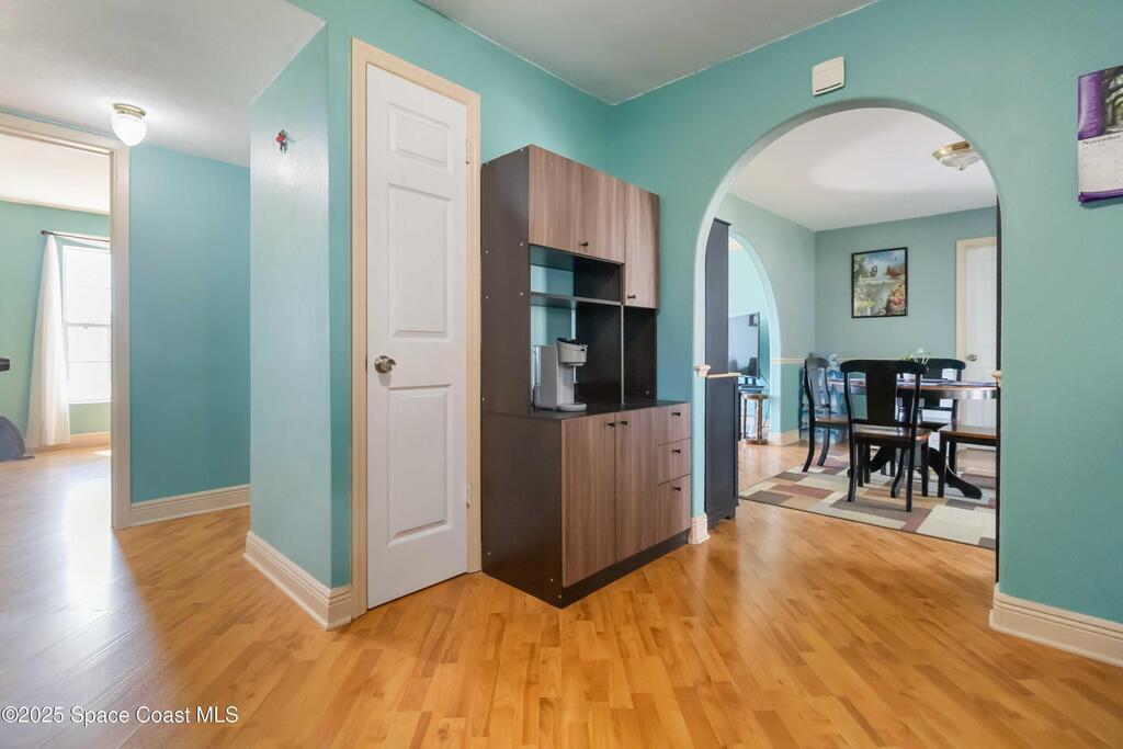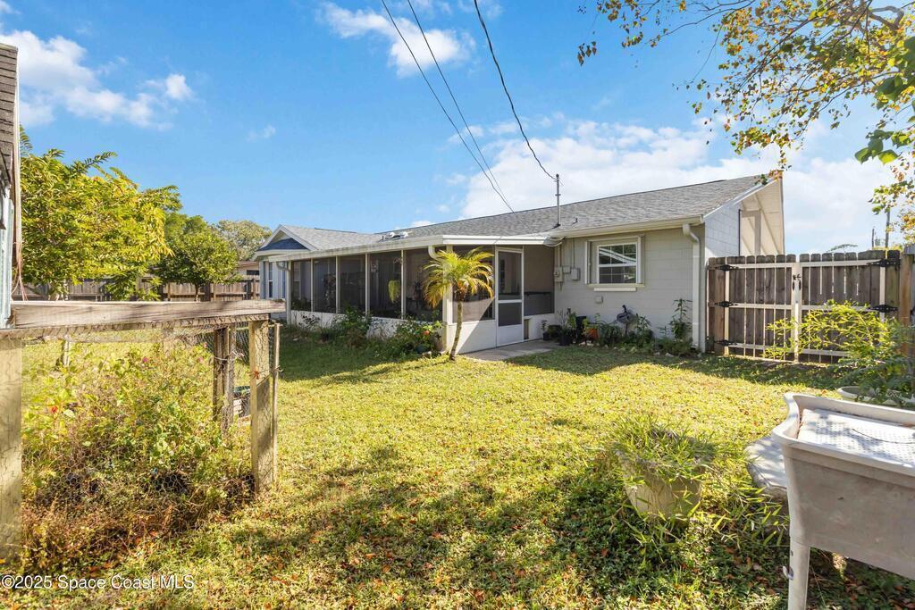 This move-in ready 4-bed, 2-bath Titusville home offers 1,379 square feet of comfortable living. Recent upgrades include a new A/C (2024), full re-pipe (2025), new water heater, accordion shutters on all windows and gutters around the entire roofline for added peace of mind. Built-in archways frame the main living areas, while the kitchen features solid wood cabinets, solid-surface counters, and stainless steel appliances. Laminate flooring runs throughout for a clean, cohesive look. The primary suite includes a large soaking tub and a beautiful remodeled walk-in shower. Step onto the large screened lanai, perfect for relaxing as you overlook the fenced backyard with fruit trees and a storage shed. The home sits near shopping, restaurants, major highways, the Indian River, Kennedy Space Center, and well-loved beaches, offering convenience and a great central location. Mortgage savings may be available for buyers of this listing.
