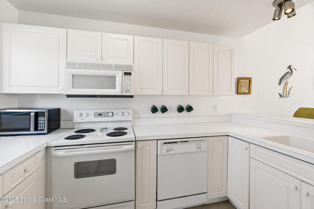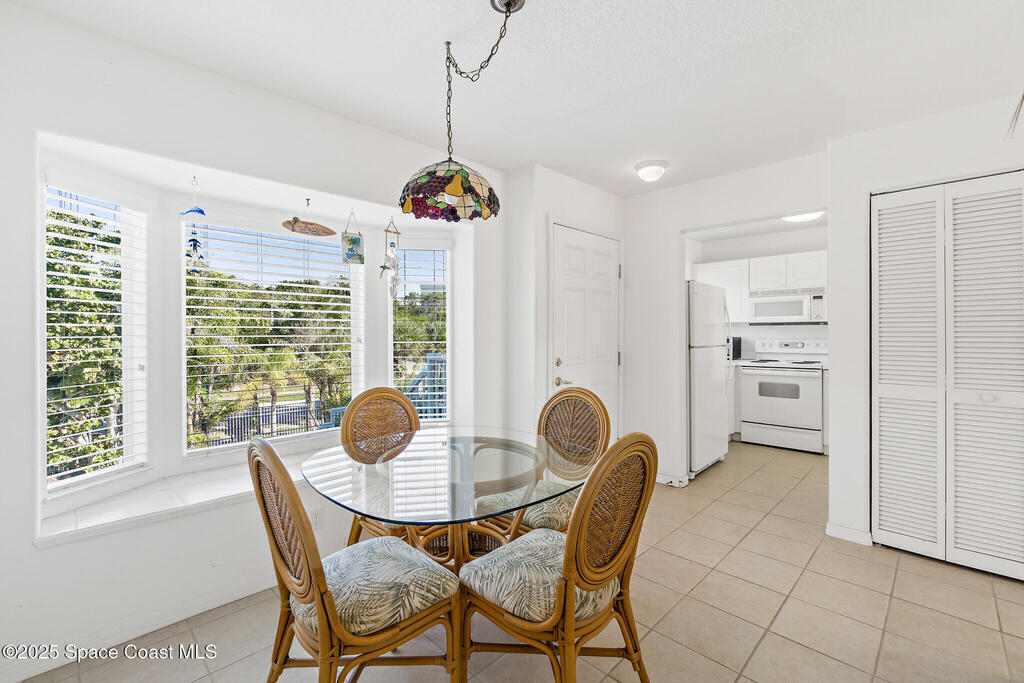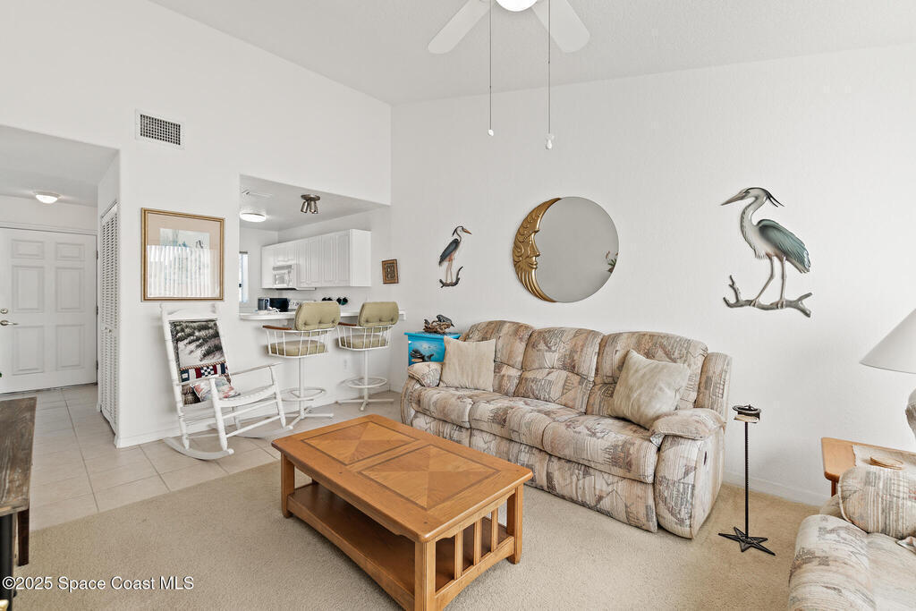 Step into relaxed beachside living at the Villages of Seaport. This fully furnished, move-in ready 2-bedroom, 2-bath second-floor condo offers an inviting retreat just steps from the ocean. The vaulted ceilings create an open, airy feel, and the screened balcony becomes your personal spot for morning coffee or winding down after a day in the sun. From the front of the condo, you'll have a perfect vantage point for rocket launches, adding a unique touch to your coastal lifestyle. Inside, the condo features a comfortable mix of tile and carpet, a bright kitchen with a decorative sunlit window, and a dining area featuring a beautiful bay window, ideal for casual meals or game nights. Living at Villages of Seaport means every day can feel like a vacation. Enjoy multiple pools, tennis and pickleball, racquetball, a fitness center, and private beach access, all within a secure, gated community.