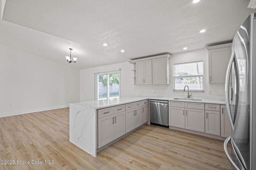 Bright, open, and beautifully updated 3 bed, 2 bath split-floor-plan home in Port St. John! This move-in-ready home features fresh interior updates throughout, including new flooring, trim, paint, lighting, fans, blinds, and interior/exterior doors. The airy living area flows into a fully renovated modern kitchen with solid wood soft-close cabinetry, quartz countertops with a waterfall edge, new LG stainless appliances, and updated kitchen fixtures. Both bathrooms have been tastefully refreshed with new vanities, sinks, toilets, lighting, updated fixtures, and a brand-new master shower. All closets and the laundry room feature new shelving with new washer/dryer hookups. Outside, enjoy a spacious backyard with a new 20' x 10' concrete pad perfect for entertaining, relaxing, or outdoor dining. Additional updates include a new AC in 2024, roof only 5 years old, and an updated electrical panel in 2019, giving peace of mind and modern comfort. Stylish, bright, and completely move-in ready.