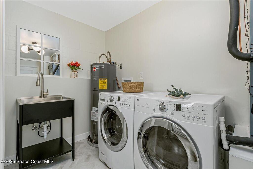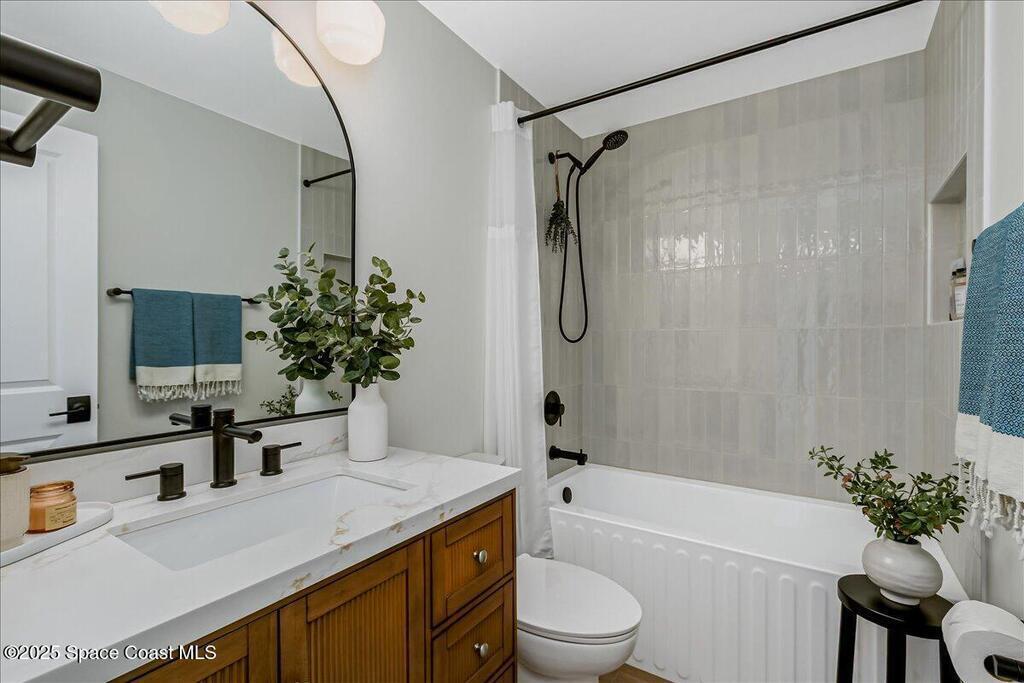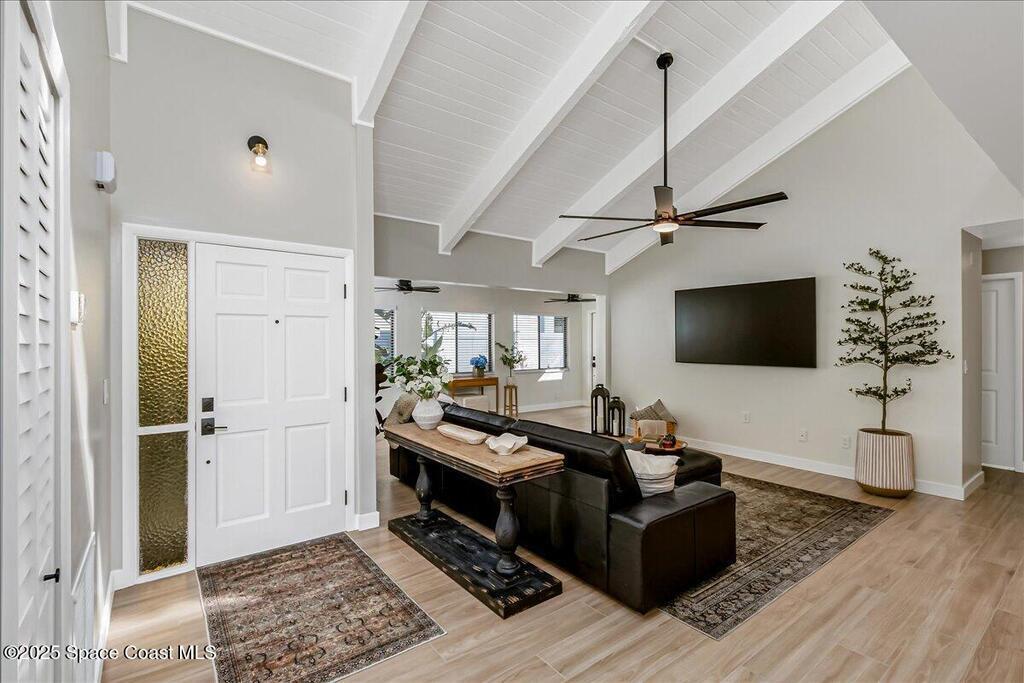 Located in the Heart of Suntree, discover modern elegance in this rare, completely renovated 3 bed / 2 bath home, where sophisticated design meets unparalleled comfort. The bright and open split floor plan with beautiful cathedral ceilings is perfect for entertaining family and friends. The kitchen, dining, and living room transition effortlessly to the sunroom out to the outdoor patio; Perfect for big gatherings! Every detail has been considered in this exquisite renovation, from the elegant porcelain tile flowing seamlessly throughout the entire home, to the array of high-end finishes making the kitchen a chef's oasis. Relax in the deep soaking tub, or on the oversized outdoor patio. This stunning home offers a lifestyle of luxury and convenience. New roof and hurricane-rated insulated garage door in 2023, HVAC 2024, water heater 2025. New kitchen 2025 with soft close cabinets, custom Venetian plaster vent hood, European fireclay farmhouse sink, stainless steel appliances,