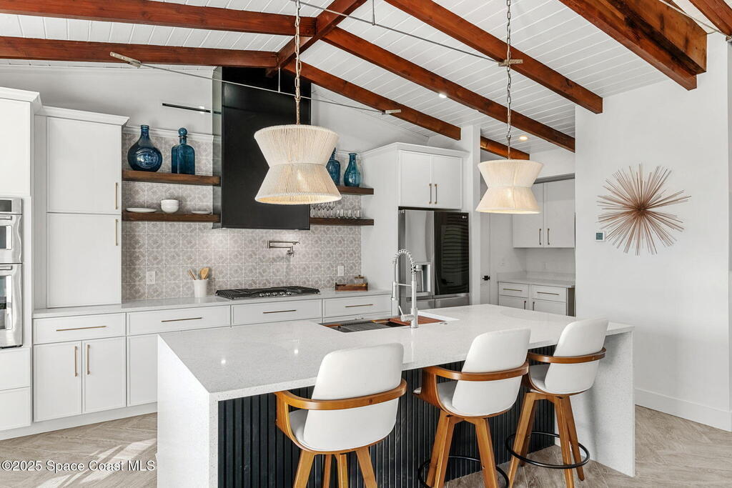 Better than NEW CONSTRUCTION-walking distance to the beach! Beachside's finest renovation featuring a covered entry with its warm open beam ceilings, rich woodwork, authentic Florida Keys coral rock accents and rain glass adorned French door. Craftsmanship and finishes complement the completely redesigned floor plan. Vaulted ceilings, exposed beams, chef's kitchen featuring a gas 36''cooktop, huge island, waterfall quartz counter tops, breakfast nook. Brightly lit living room by oversized windows. The dining area has a view thru the French doors of the outdoor entertainment area. Elaborate master suite includes a seating area, volume ceilings, built ins, and LED lighting. Luxurious master bathroom w/ a large rain shower and soaking tub under the featured ''cruise ship'' window. The outdoor entertainment area is surrounded by tropical landscaping. Plus all new plumbing, electric, salt resistant metal roof, impact windows/doors, d-wall, irrigation system, extensive landscaping and more