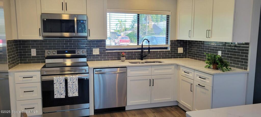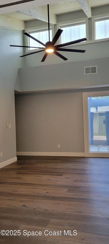 Adorable NEWLY REMODELED, contemporary single family home in super convenient Suntree location close to everything! 2 spacious bedrooms with 2 renovated full baths and large closets too! Gorgeous new sunny kitchen (with 2 windows for natural light), new white cabinetry, detached kitchen island, and new stainless appliances and new quartz counter tops and new back splash. Vaulted Great Room to make this lovely home feel even more spacious! Light and airy, neutral coastal paint color throughout! New easy maintenance, luxury vinyl flooring throughout - no carpet! Very large back patio too! This is a must see, move-in ready home!