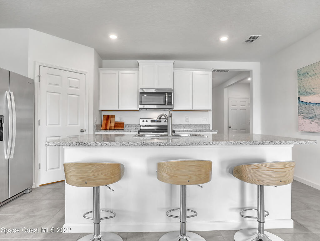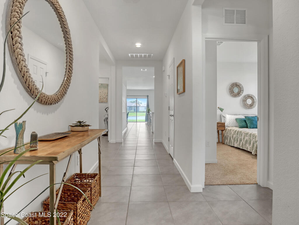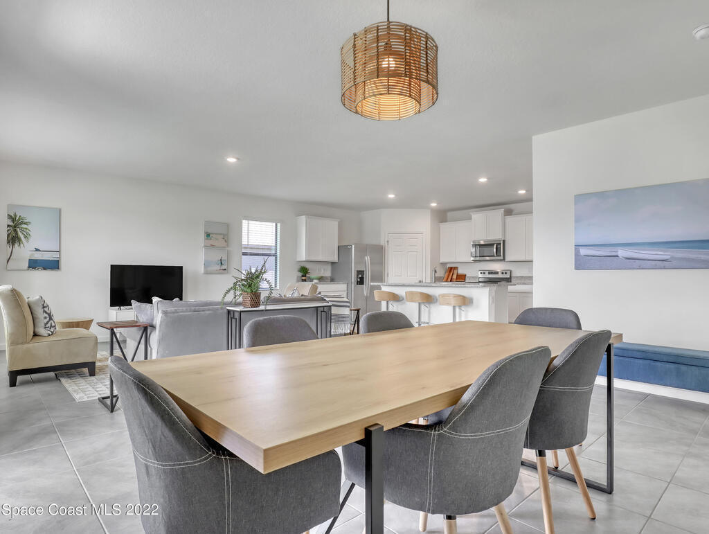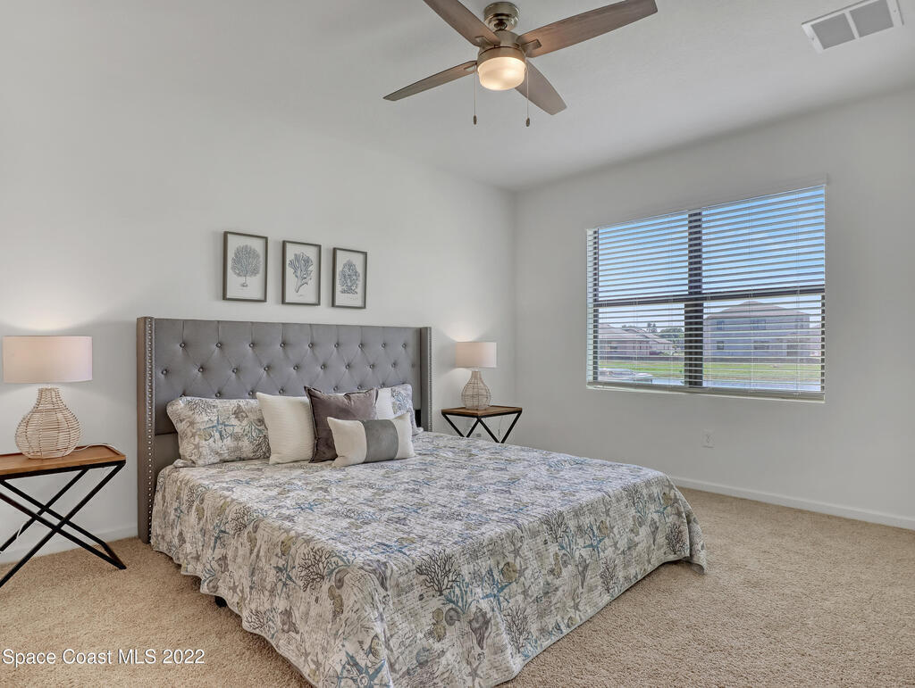 Fully furnished! This newer luxury home has 4 bedrooms and 2 full bathrooms. You can sit on the back patio and enjoy the water view or be first to use the brand-new luxurious amenities. Included is access to resort style pool, gym, volleyball, pickleball and gorgeous clubhouse with gaming tables and kitchen. Perfect place to host a party. The home comes fully furnished and ready for you to enjoy with a cozy beachy vibe. Perfect 2000 sq feet one level layout with huge open concept kitchen, granite countertops, stainless steel appliances, massive walk-in pantry, and large island with seating. Front bedroom currently used as office. The primary bedroom has a king bed, gorgeous ensuite with 2 huge closets. The other 2 bedrooms have a double bed and two twin beds. This newly constructed gated community is located close to L3Harris, excellent beaches, restaurants, public fishing, marina, surfing, and shopping. Outdoor pool and other community amenities. Rent includes landscaping.