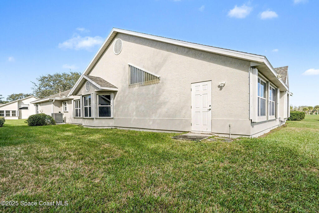 Peaceful yet conveniently located near all the amenities of the Suntree community, including its premier 18-hole golf course. This home features water frontage & numerous updates such as top-grade vinyl flooring, a beautifully designed tiled walk-in shower, enhanced laundry shelving, upgraded lighting, and fresh interior and exterior paint. The porch was enclosed with AC -Overlooking Golf Course. A Security System & new roof add to the home's value and peace of mind. Also private court yard. HOA Fee: Yard Maint. & House Insurance,Ext Maint.incl Roof, paint House, Pest.Lovely home--just move right in!