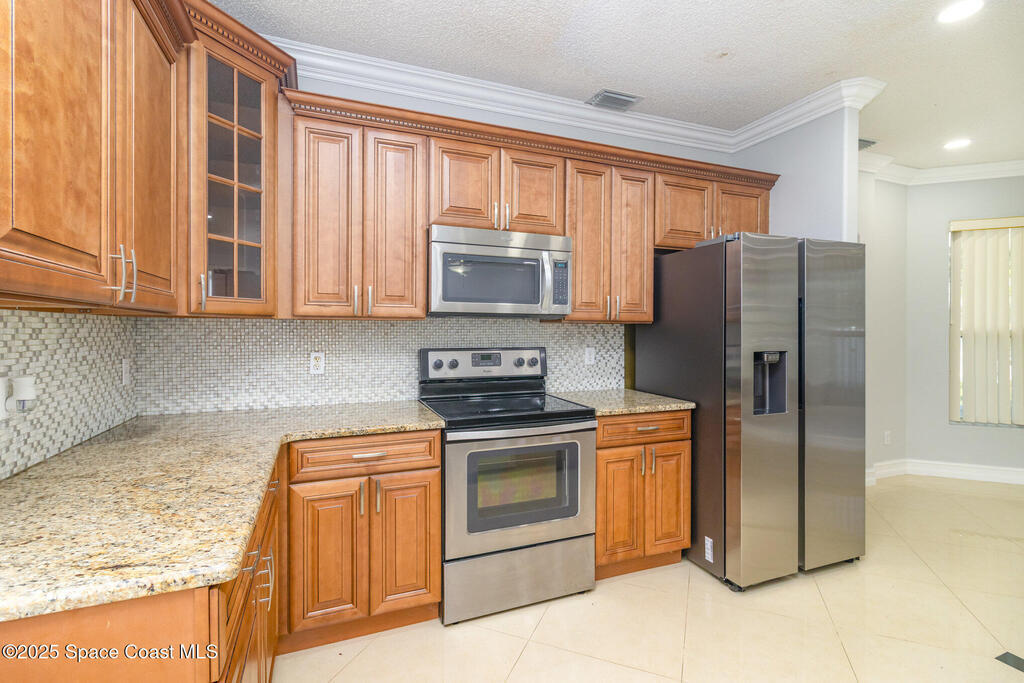 Beautifully upgraded 5-bedroom, 3-bath two-story home on a desirable corner lot in Hammock Lakes East, formerly the model home. Downstairs features a bright living room, spacious family room, upgraded kitchen, and a guest bedroom with full bath. Upstairs offers 4 bedrooms including a large master suite with walk-in closet, double vanity, garden tub, and separate shower, plus a roomy common area, perfect for study, media, music room, or a even a gym!Home boasts Italian porcelain tile, wood floors, custom solid-wood kitchen cabinets, granite countertops, and crown molding throughout--no carpet. Additional upgrades include electronic roll-up storm shutters, solar panels for near-zero electric bills, and a 2018 roof. Large screened back porch, and a fully fenced-in backyard, which is lined with tropical fruit trees such as sugar apple, banana, and mango. A move-in-ready home with exceptional detail and craftsmanship.