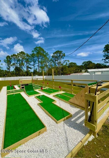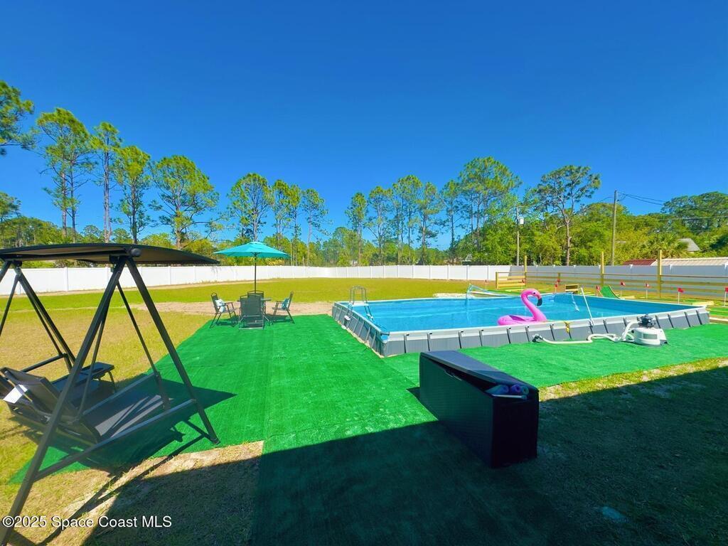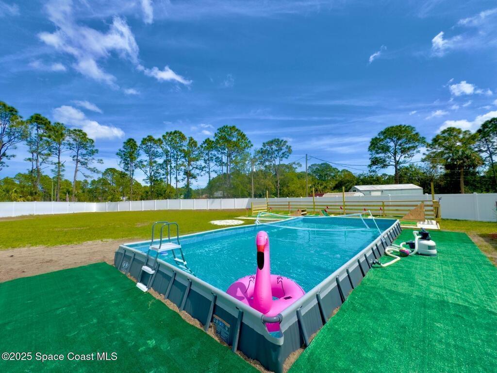 Stunning 2024 new-construction block home with 1,828 sq ft, 4 bedrooms and 2 bathrooms, plus an extra lot included in the sale. .92 Acres of land with main house and lot. Home features an open floor plan, large kitchen island, 36'' white cabinets, quartz countertops, walk-in pantry, stainless appliances, and reverse osmosis at the kitchen sink. Tile in main areas, carpet in bedrooms, and a split-bedroom layout. Primary suite offers an oversized walk-in closet and large linen closet. Garage is converted to an A/C game room with insulated door. Huge fenced backyard with second driveway ideal for RV parking, submerged above-ground pool, and a custom 9-hole mini golf course. Exterior includes vinyl fencing and a trussed covered lanai. Currently used as a successful short-term rental/Airbnb. A rare opportunity with modern 2024 construction and exceptional outdoor amenities.