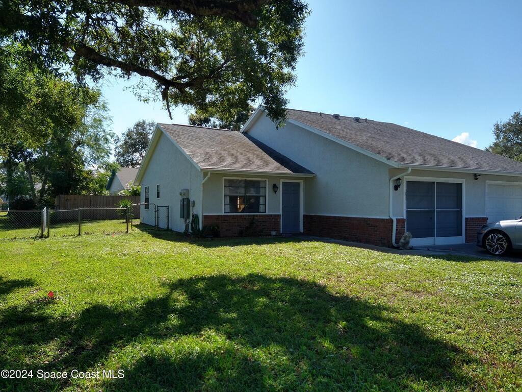 Very clean half duplex at the end of a nicely kept street on a large corner lot. 2 good size bedrooms eat in kitchen, 1 car garage with screen slider to enjoy cool breezes. Fenced yard and lawn care is included. Close to everything, beaches, shopping, I95, Wickham Park, Patrick Space Force base.