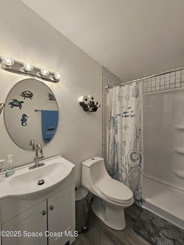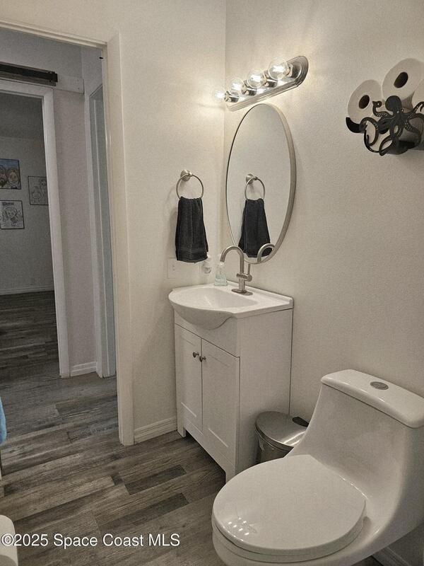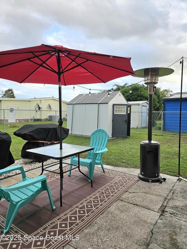Beautifully updated home in 55+ community where you own your land- no outdated paneling or wallpaper here! Enjoy new drywall, upgraded electrical, modern light fixtures, ceiling fans, barn doors, and fresh paint throughout. The wood-plank flooring adds warmth and character to every room. The kitchen with stainless-steel appliances, tile back-splash and a breakfast bar that opens seamlessly to the dining area and living room. The guest bath has been completely refreshed with a new vanity, toilet, and shower. The spacious lanai offers screened windows, a second refrigerator, and a deep freezer, giving you extra room to relax or entertain. A dedicated workshop with utility sink provides additional storage and direct access to both the backyard and lanai. There is a breezeway that connects the lanai to the fenced backyard, complete with an 8x10 shed for even more storage. Roof 2023, hot water heater 2020, HVAC 2025.