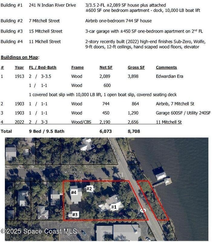 Rare opportunity to own a unique, income-producing waterfront property in Cocoa Village. There are 4 buildings, two main homes with a total of 9 bedrooms and 9.5 bathrooms. Custom 2022 home with 2 levels, 3 bedrooms, 3 baths with an elevator and soaring 12' ceilings and 9' doors. This stunning home features a gourmet kitchen with Wolf gas range, Sub-Zero fridge, Miele coffee maker, wine bar, brick accents, hand-scraped hardwood floors, and gorgeous views. There are three other buildings, an Edwardian era main house (former B&B) with 3 bedrooms, 3.5 bathrooms, gourmet kitchen with an attached one-bedroom apartment with separate entrance. Also, a thriving Airbnb cottage that all sit on 133' of Indian River frontage with dock and 10,000 lb. boat lift. Property also includes a 3-car garage, with a one-bedroom apartment above with patio and garden planters. Turnkey, and leases convey. Rocket launch site, and so much outdoor living! Walking distance to all that Cocoa Village has to offer!