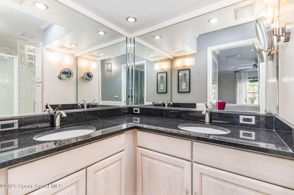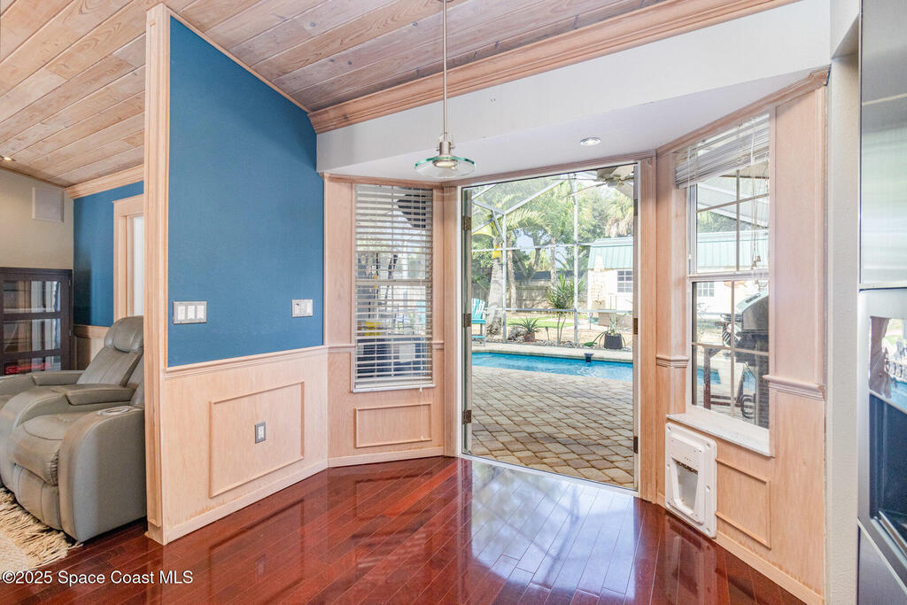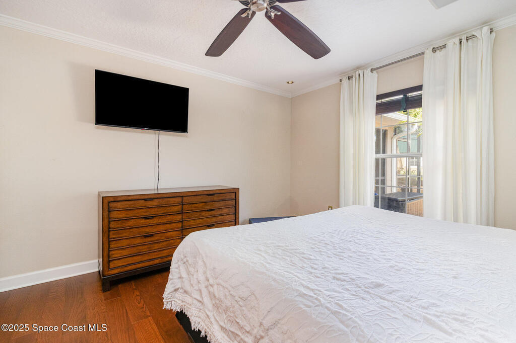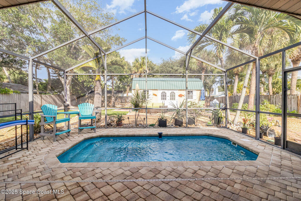 Welcome to this beautifully maintained beachside home, perfectly positioned just moments from the ocean. This light-filled 3-bed, 2-bath residence features vaulted wood ceilings inside and out, wood and tile flooring, a gas fireplace, and a living area designed for easy coastal living. The kitchen includes granite counters, solid wood cabinets, stainless appliances, and a view of the screened lanai and backyard.Step outside to a low maintenance private tropical retreat. The backyard is fully fenced with two gates and designed for Boat/RV parking and Golf Cart Parking with stone pavers, landscape lighting, garden hoses with underground compartments. There are two sheds, one is 10x24 with electric!Some improvements include new primary bedroom flooring (2025), A/C (2018), and a 2019 roof. The home offers thoughtful upgrades: heated towel rack; Toto bidet toilet seat, and Insteon smart-home phone app controls.