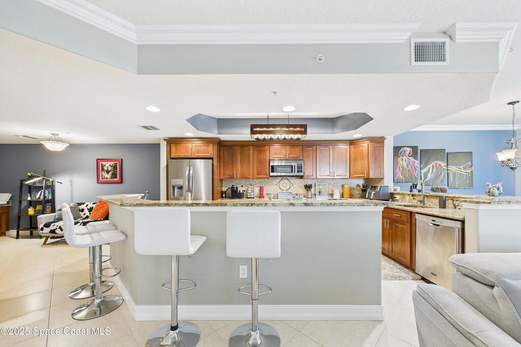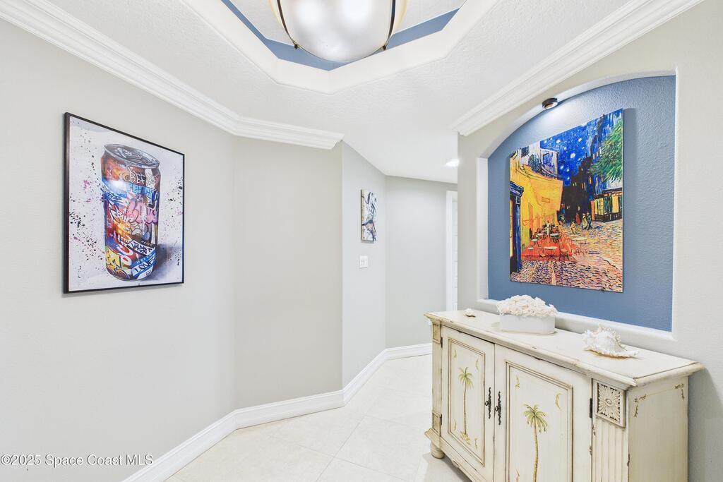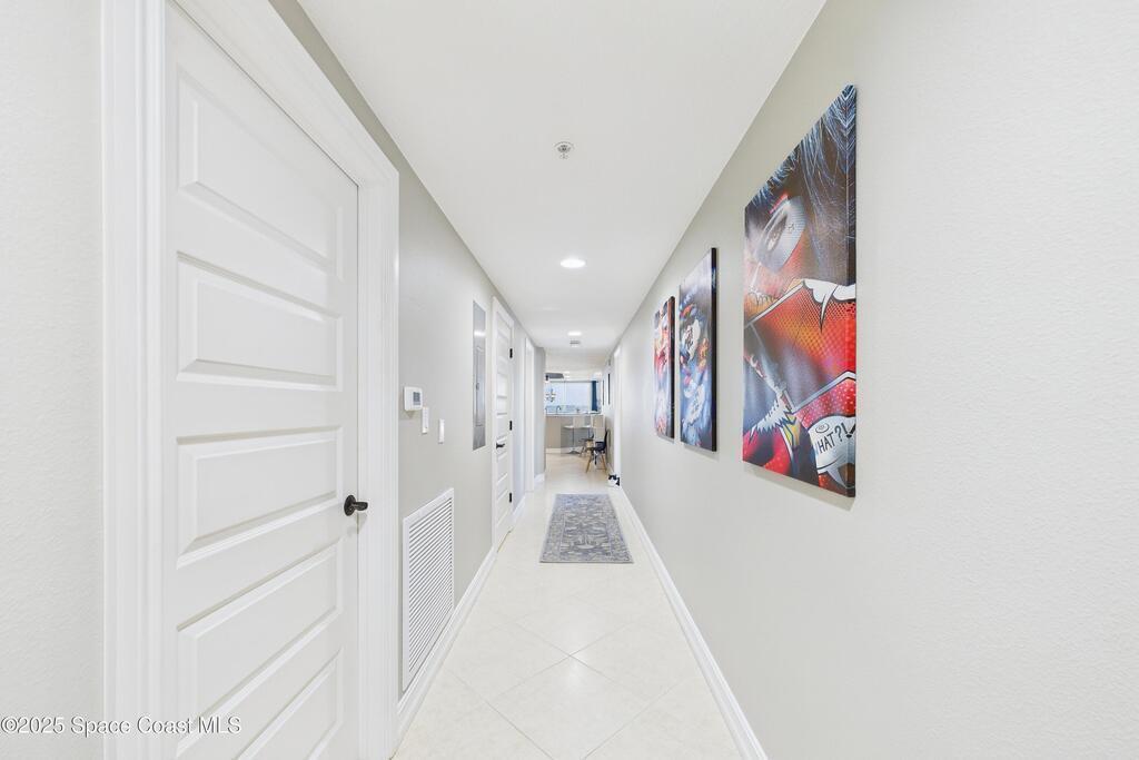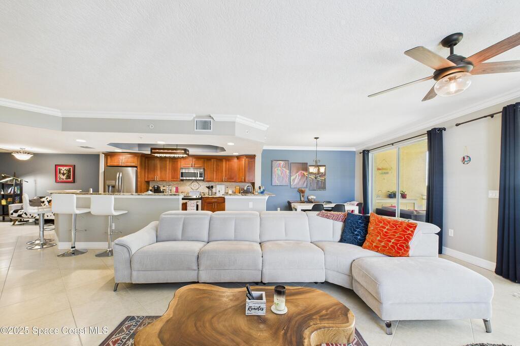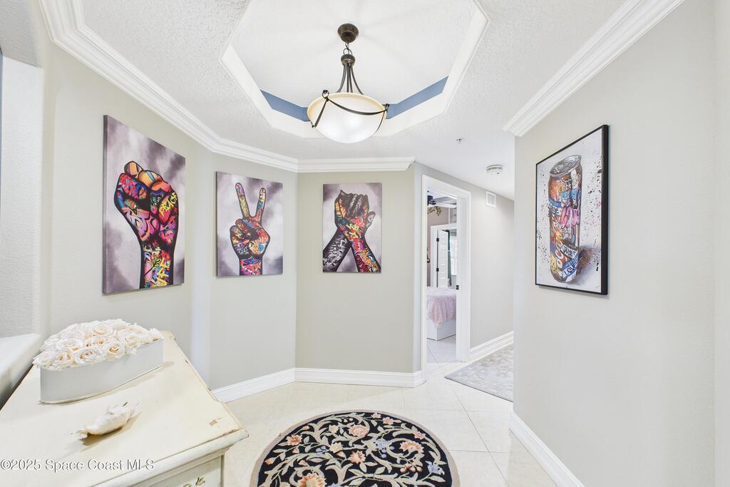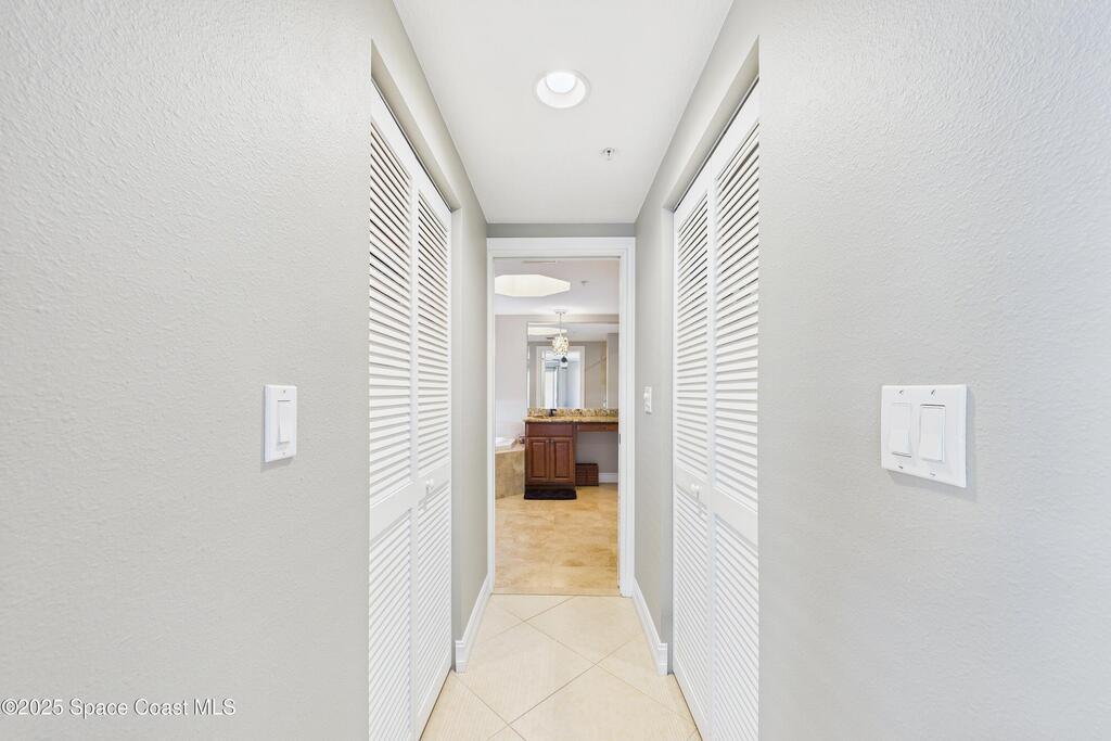 Spectacular DIRECT BANANA RIVERFRONT CORNER UNIT offering breathtaking views and a peaceful waterfront lifestyle in the boutique 11-unit community of Garden Bay. Rare opportunity to own an end unit in this highly desirable Cocoa Beach complex--just a short stroll to the ocean, restaurants, and shopping. Nearly 2,600 sq ft of luxury living with 4 bedrooms, 3.5 baths, and a private 2-car garage. High 8.5' ceilings, crown molding, travertine and wood flooring (no carpet), and impact windows with plantation shutters throughout. The gourmet kitchen boasts granite countertops, custom cabinetry, tile backsplash, and newer stainless appliances overlooking the water. Spacious owner's suite features double walk-in closets, private balcony, and spa-inspired bath with jetted tub and marble shower. Each guest bedroom has its own ensuite bath for privacy and comfort.