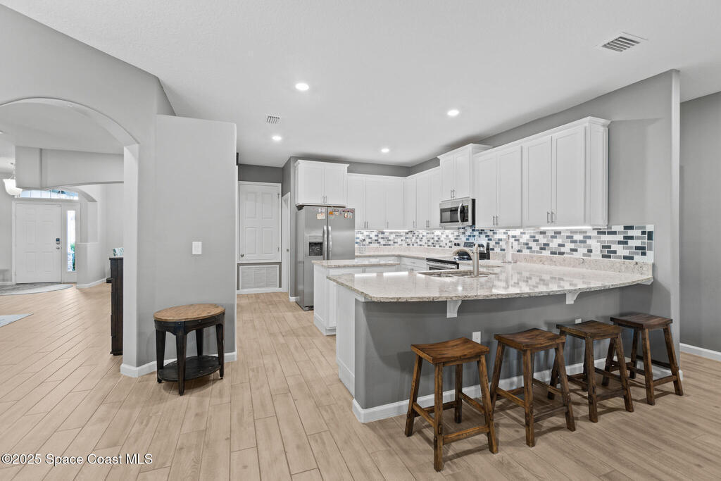 This beautiful 5BR/4BA home in the gated Sanctuary at SAWGRASS LAKES backs up to a protected nature preserve with an active eagle's nest. Inside, you'll find over $36K in builder upgrades. Built in 2018 and lovingly maintained by the original owners, this spacious 3,357 SQFT Elm Royale floor plan includes a 3-car garage, upgraded wood-look tile, Level 2 white shaker cabinets, quartz countertops, under-cabinet lighting, French doors, and a screened porch overlooking the preserve. 1st floor has spacious kitchen with large center island and bar-height slab, guest suite plus large upstairs loft, large bedroom (or office) full bathroom, office nook & Bonus Room. Enjoy resort-style amenities--huge beach entry resort community pool, waterslide, clubhouse, fitness center, and playgrounds and community events--all just a short walk or bike ride away. Located near top-rated schools, shopping and dining, this home blends luxury, space, and Florida nature living at its best.