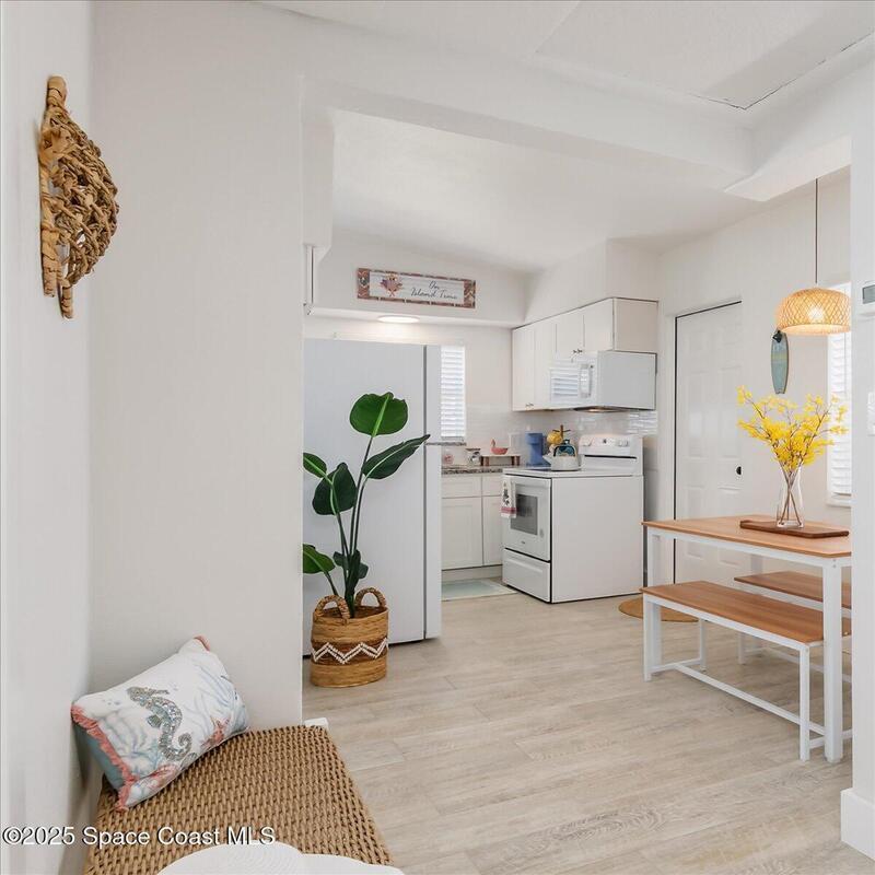 FULLY FURNISHED UNIT IN AMAZING WATERFRONT COMMUNITY WITH LARGE NEW DOCK OVERLOOKING BANANA RIVER AND ONLY 3 MINUTE WALK TO BEACH! This completely redone professionally decorated unit has so much to offer including: NEW beige-washed tile floors, base boards, trim work, interior doors, knobs, textured walls, ceiling fans, recess lights, electrical, tankless water heater, 2023 A/C, windows, metal roof, window treatments, and more! Kitchen has white shaker cabinets, white subway tile backsplash, granite countertops, and all new appliances. Rinse off the sand after a fun day at the beach with your outdoor shower off back paver deck. Come and enjoy the BEAUTIFUL sunsets on the community Dock! Only 2.5 miles from world famous Downtown Cocoa Beach. Internet, streaming cable and water included. 6 MOINTH LEASE ONLY AT THIS PRICE! SHORTER TERM $3,500 A MONTH.