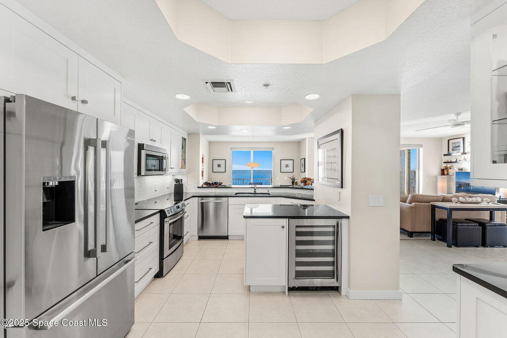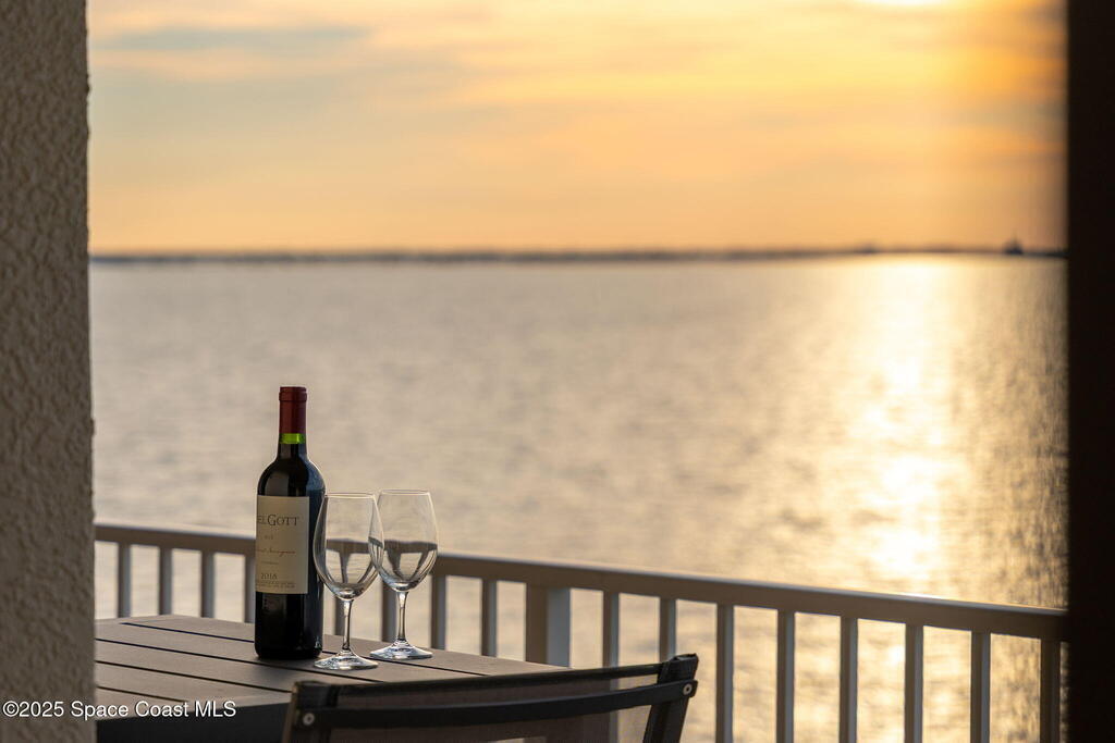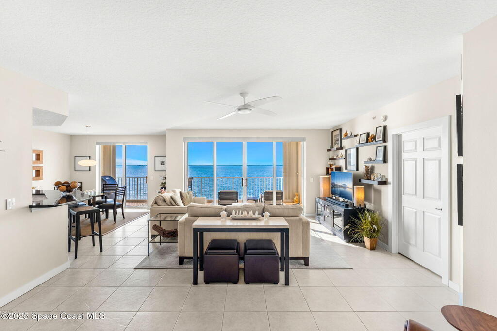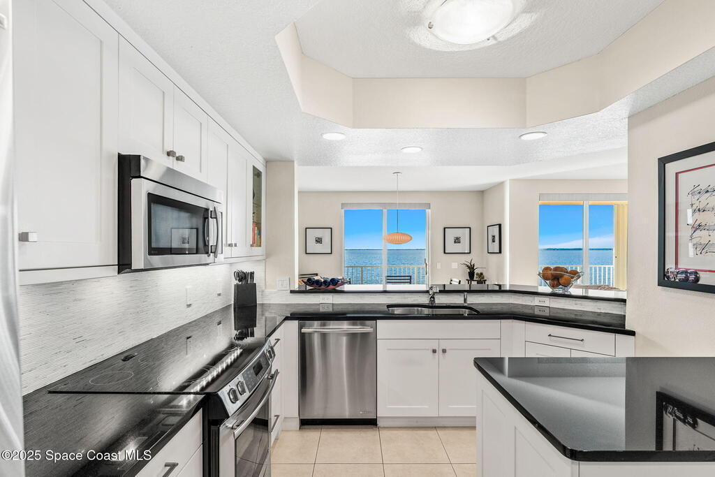 WIDE, OPEN living spaces and unforgettable sunset views define this TOP-FLOOR residence at Solana on the River. This RARE extra-wide three-bedroom, three-bath floor plan delivers an expansive, airy feel the moment you enter, with 9-foot ceilings, 8-foot sliders, and walls of riverfront glass drawing your eye straight to the water.Thoughtful upgrades continue throughout the home, including contemporary ceiling fans and remote-controlled shades on the living and dining room sliders -- offering comfort, convenience, and effortless control of light and privacy.The beautifully updated kitchen features polished black quartz countertops, JennAir and Bosch stainless appliances, a built-in wine cooler, updated shaker-style cabinetry, and excellent flow into the dining and living areas. Plush carpeting runs throughout (except for tiled spaces), bringing warmth and comfort to the residence.