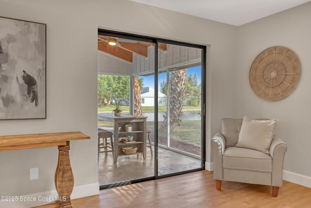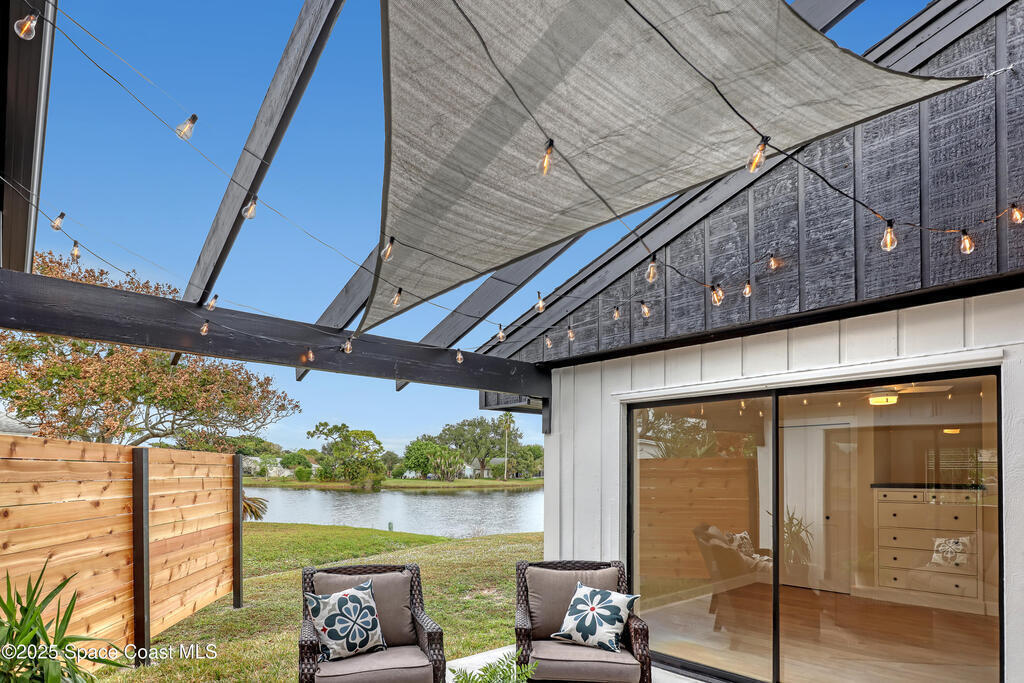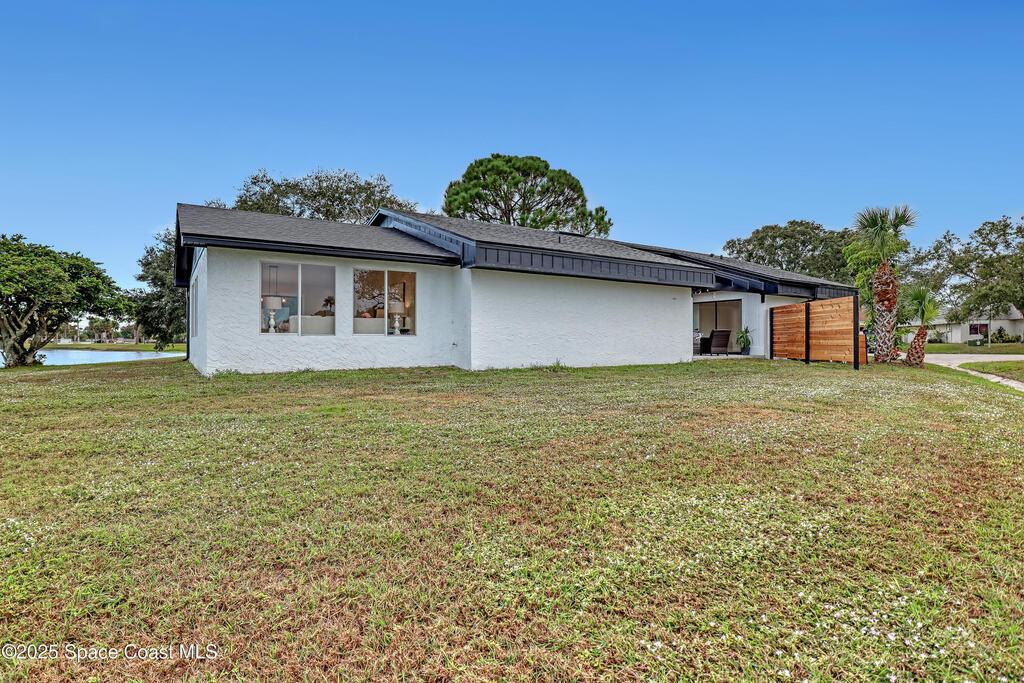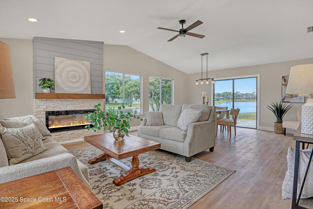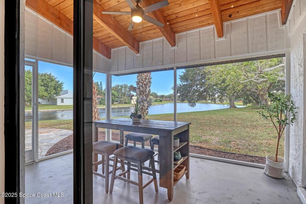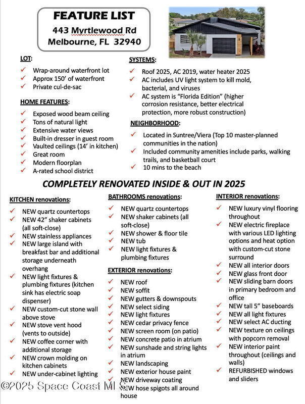 Tired of cookie-cutter Viera/Suntree homes?...well this is your house! Filled with unique features. Everything is new, so it's like getting a brand new house in the heart of Suntree. Large cul-de-sac lot with wrap-around waterfront. Features a dedicated office or flex room. New luxury vinyl flooring & lighting throughout. Brand new kitchen with soaring 14' tall ceiling with exposed wood beams and T&G planks. Large quartz island with overhang, 42'' soft-close shaker cabinets, under-cabinet lighting, SS appliances, range hood, coffee corner, & tons of storage. Great room with 180 degree water views & new stone fireplace. Each guest room has their own slider door access to the private atrium that features a new concrete patio, sunshade, & overhead lighting. Both bathrooms are all brand new with pebble tile showers, tile floors, & quartz countertop vanities. Indoor laundry room. All new int/ext doors. Roof (2025), HWH (2025), AC (2019), & select AC ducting (2025). A-rated school district