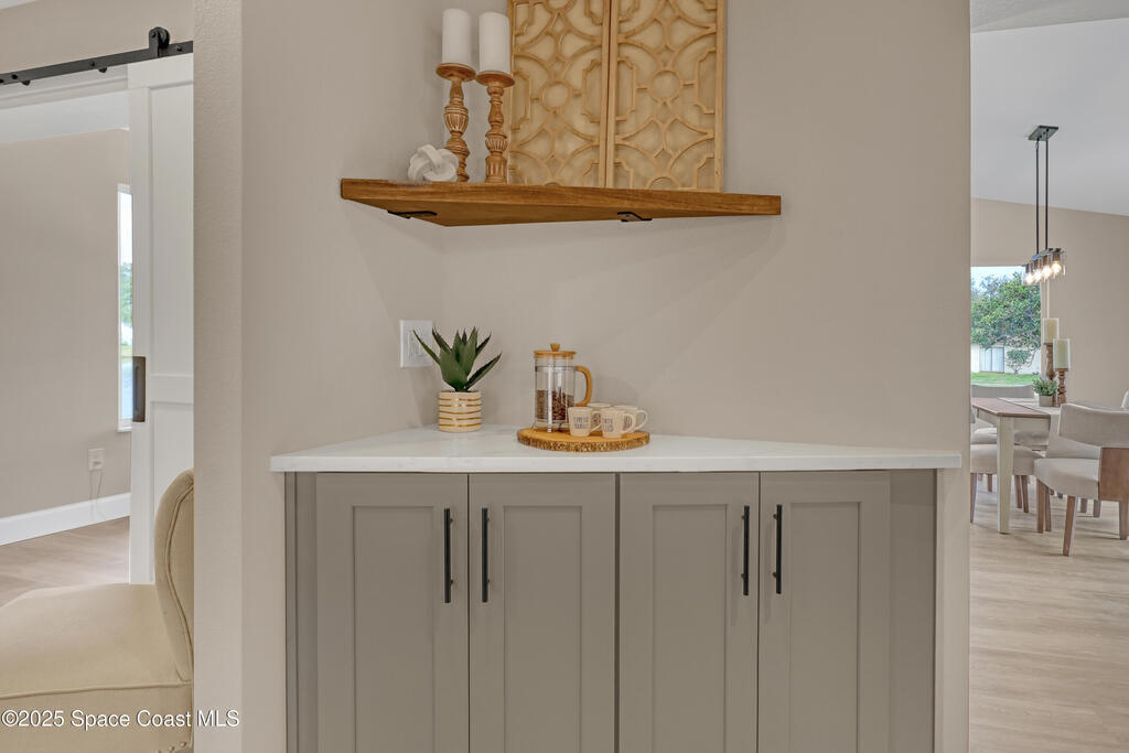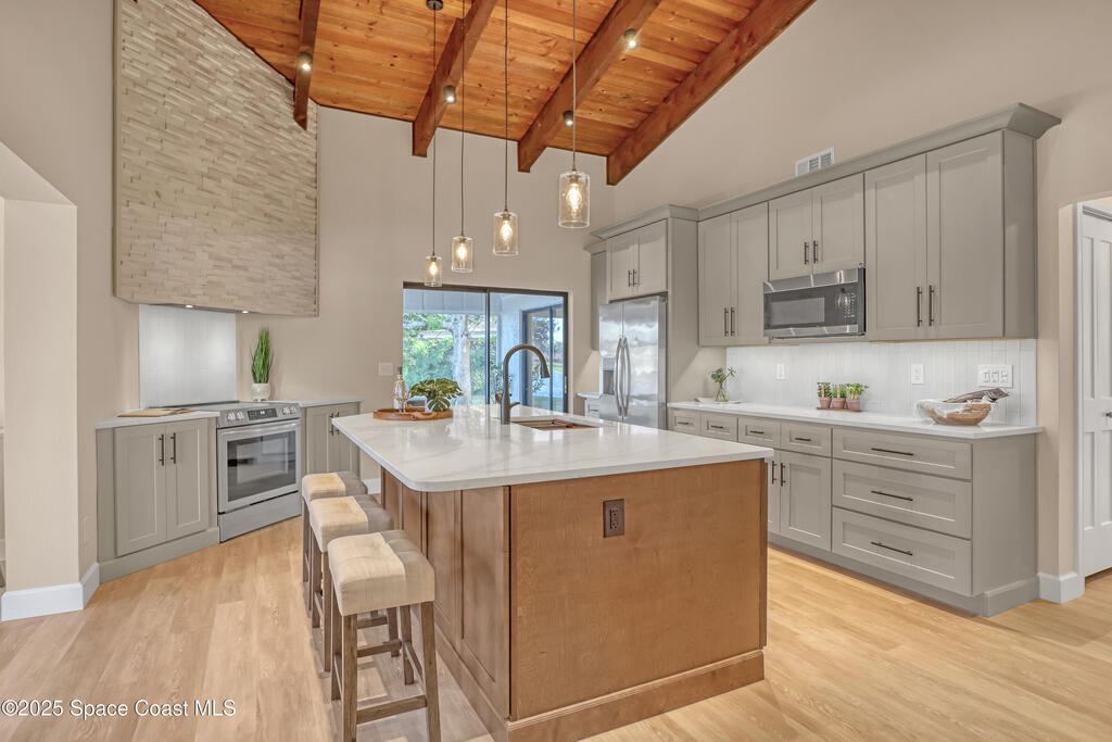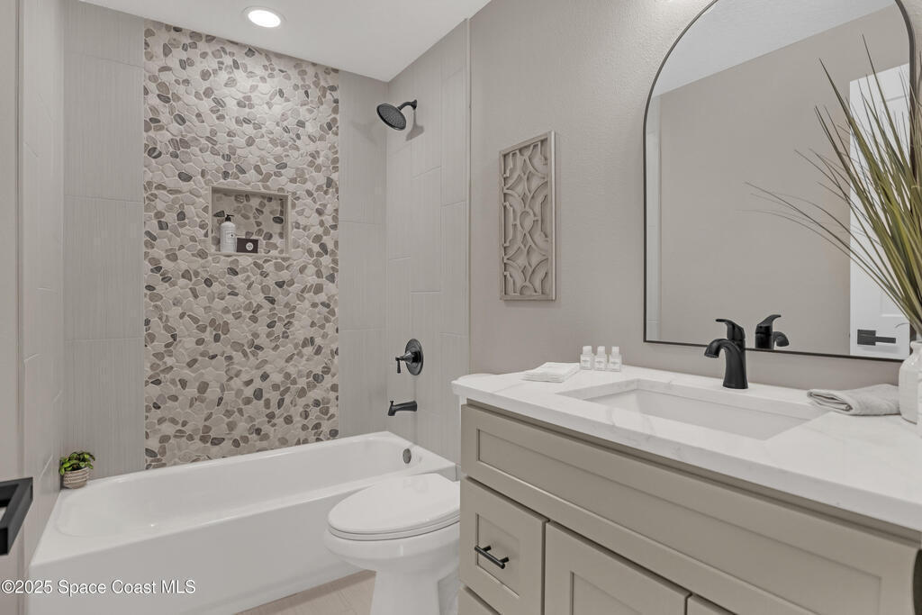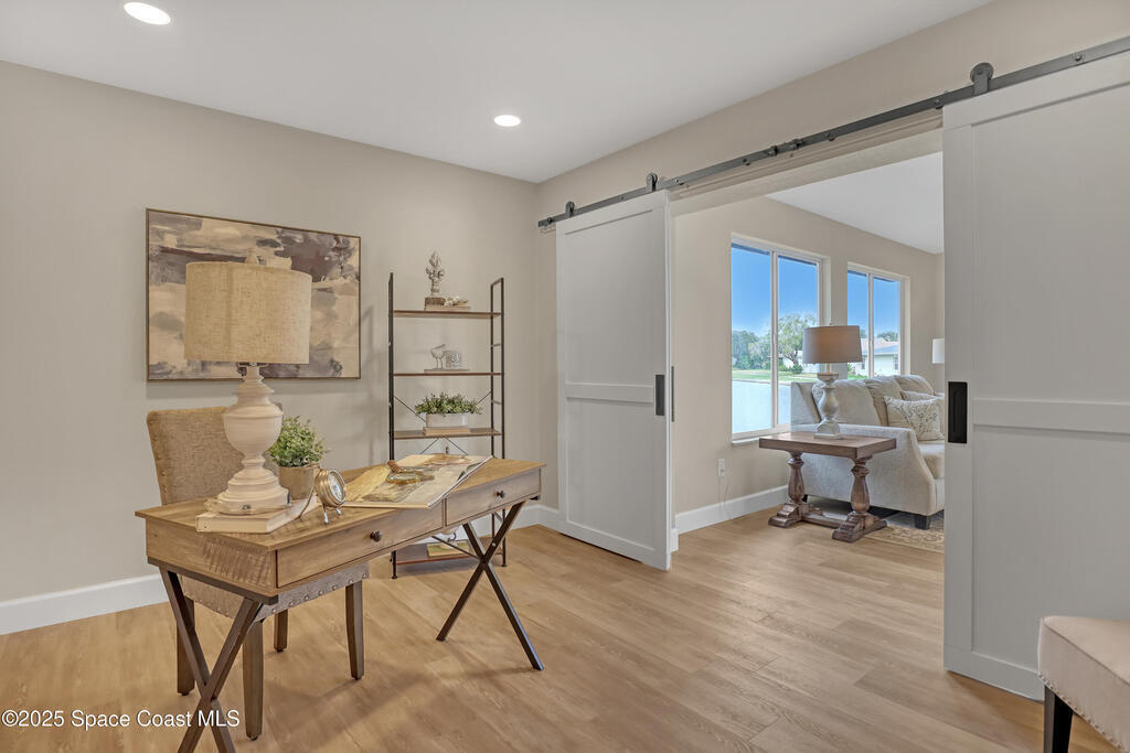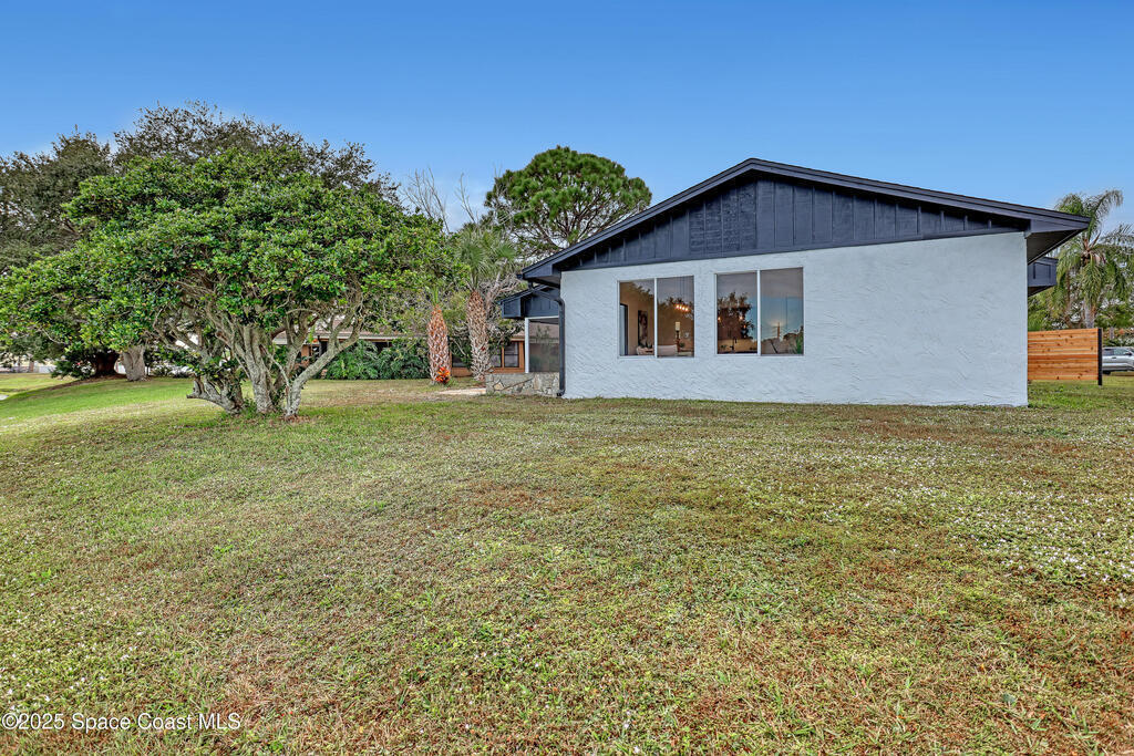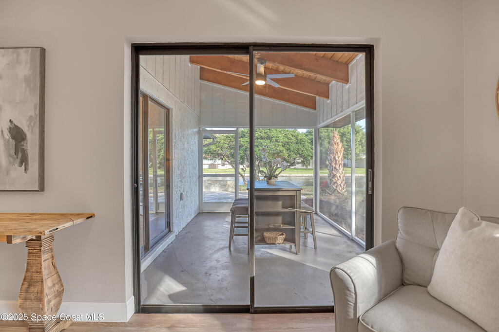 Tired of cookie-cutter Viera/Suntree homes?...well this is your house! Filled with unique features. Everything is new, so it's like getting a brand new house in the heart of Suntree. Large cul-de-sac lot with wrap-around waterfront. Features a dedicated office or flex room. New luxury vinyl flooring & lighting throughout. Brand new kitchen with soaring 14' tall ceiling with exposed wood beams and T&G planks. Large quartz island with overhang, 42'' soft-close shaker cabinets, under-cabinet lighting, SS appliances, range hood, coffee corner, & tons of storage. Great room with 180 degree water views & new stone fireplace. Each guest room has their own slider door access to the private atrium that features a new concrete patio, sunshade, & overhead lighting. Both bathrooms are all brand new with pebble tile showers, tile floors, & quartz countertop vanities. Indoor laundry room. All new int/ext doors. Roof (2025), HWH (2025), AC (2019), & select AC ducting (2025). A-rated school district