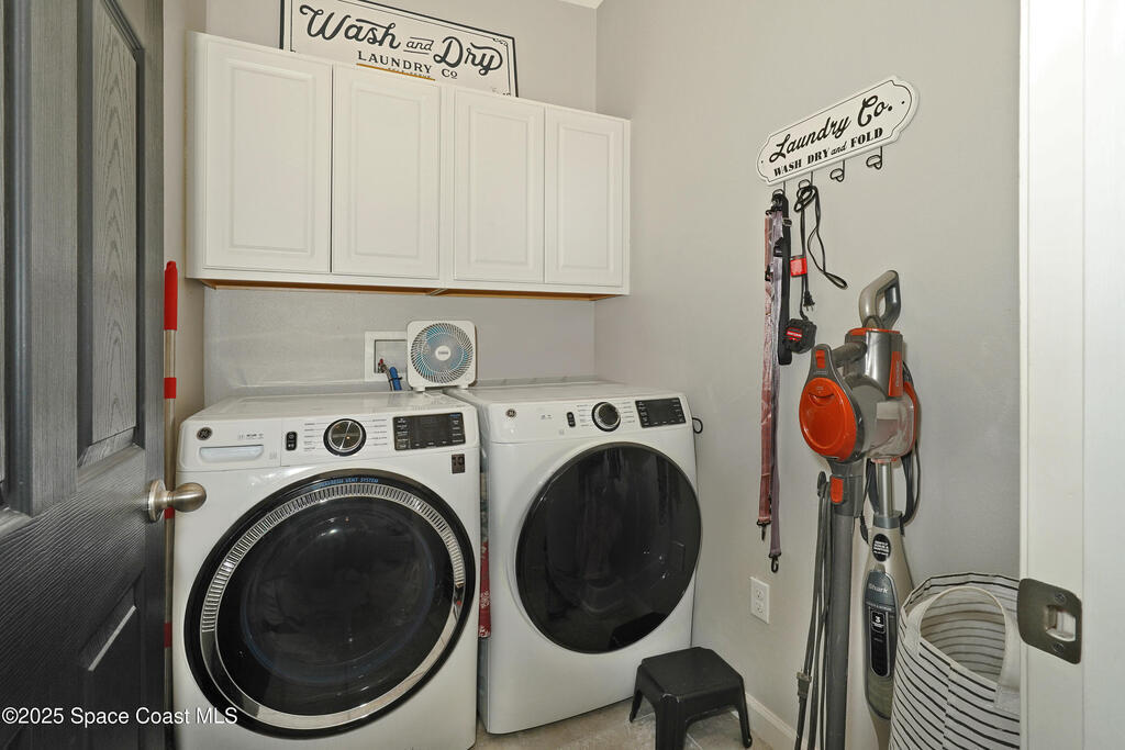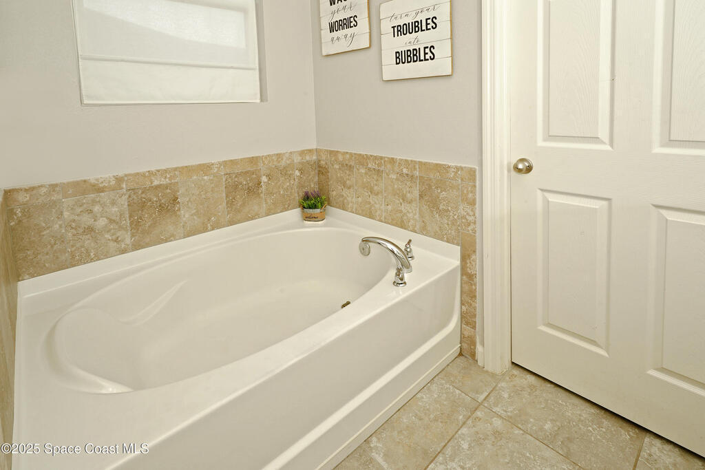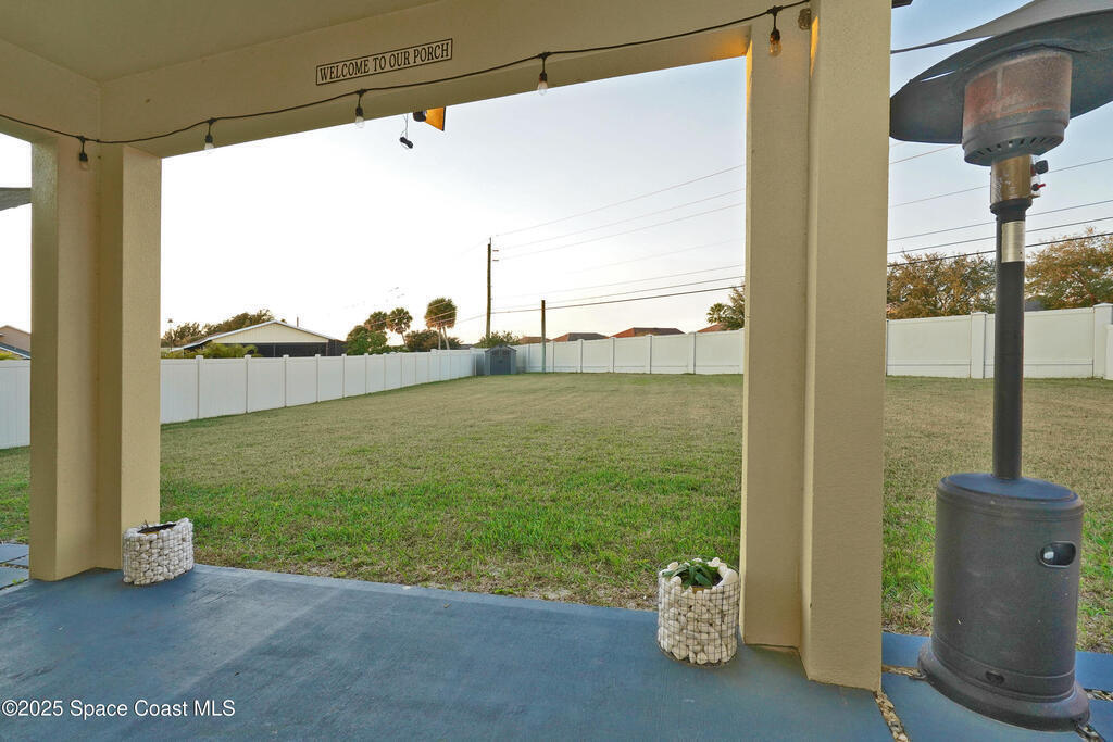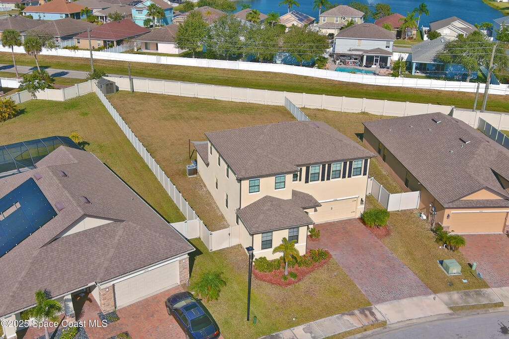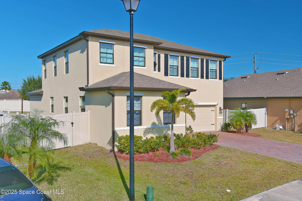This 2,827 sq. ft. home has 4 bedrooms, 2.5 baths, a bonus room / office area next to the master, an open kitchen, dining room, living room tile floors downstairs and carpet upstairs. There are ceiling fans in most rooms and the kitchen has stainless appliances including an electric stove and lots of cabinet space, wide granite counters, an island and a separate laundry room. The master bedroom has a large bonus room/office area attached, a large walk-in closet in the bathroom with 2 sinks, separate glass shower and a large soaking tub. Relax on the open patio with a view of the huge vinyl-fenced back yard with a storage shed. Features include glass front door. Low-E double-pane windows, storm shutters and brick paver driveway This friendly neighborhood that is very close to shopping, churches, schools and restaurants, and conveniently located just 19 minutes to the beach and 40 minutes to Orlando.