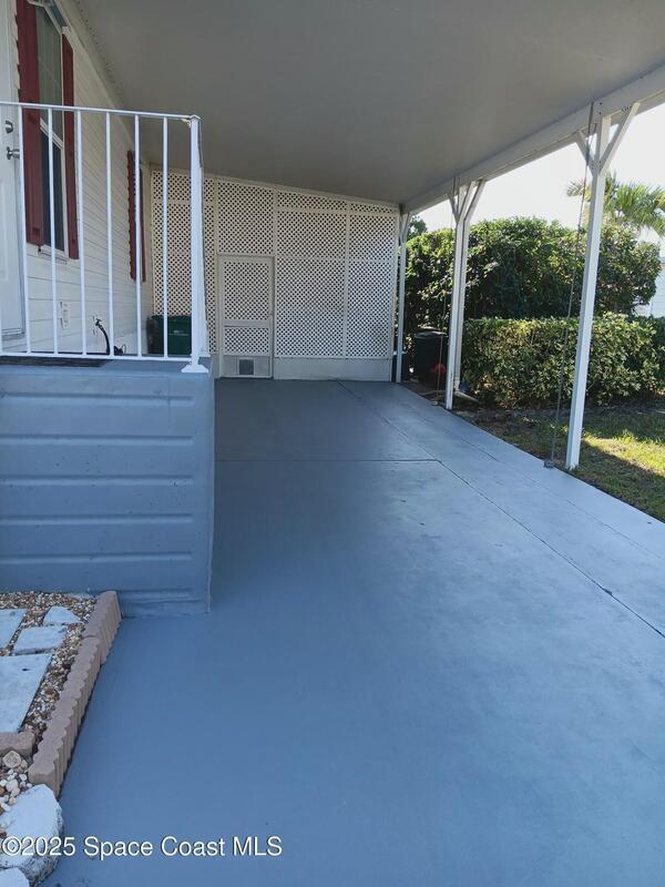 This spacious home has 3 bedrooms and all enclosed front room with French doors leading to the rest of the home. Large kitchen with pantry and plenty of cabinets. Open dining room and living room Separate master bedroom suite with bath plus 2 more bedrooms and full bath. All interior doors are 36'' wide. Home has many updates including, Roof 2023, Hot water heater 2023, AC 2018 just refurbished, water filter, refrigerator and washing machine brand new, Large lot with mature trees for shade, Barefoot Bay offers many amenities for all to enjoy including Private dock and beach. You own the land!