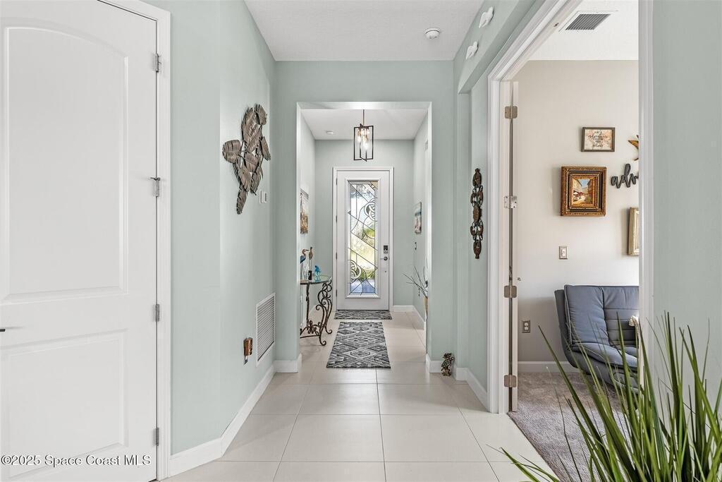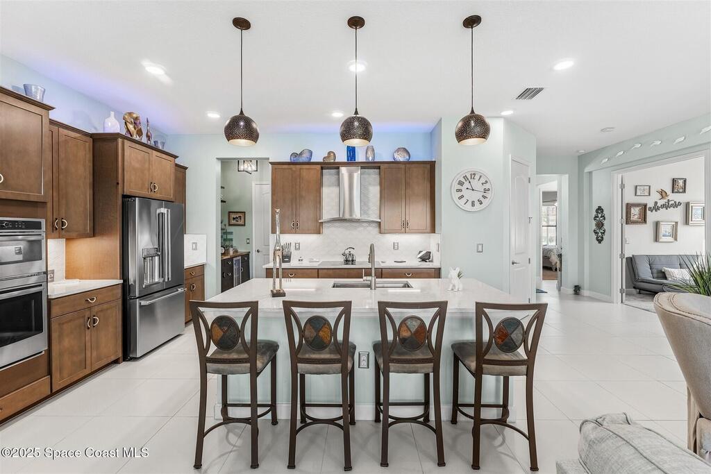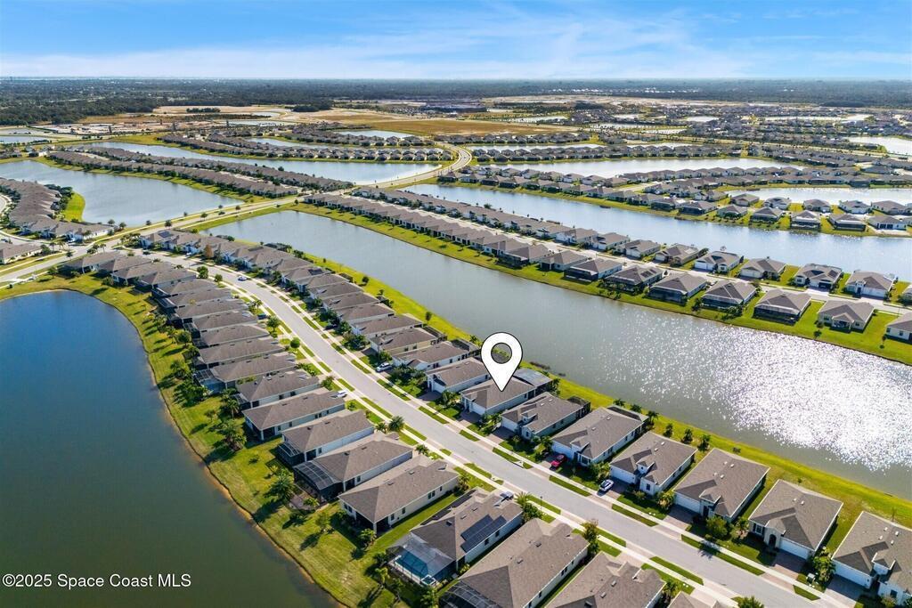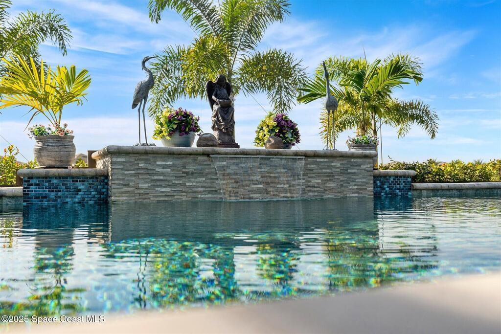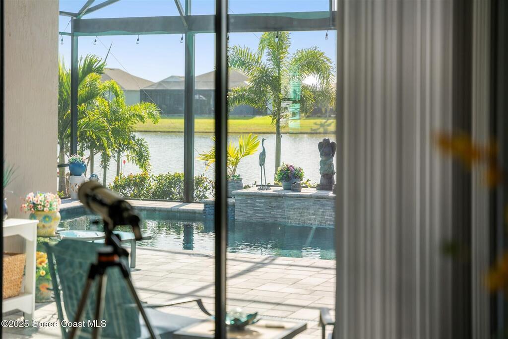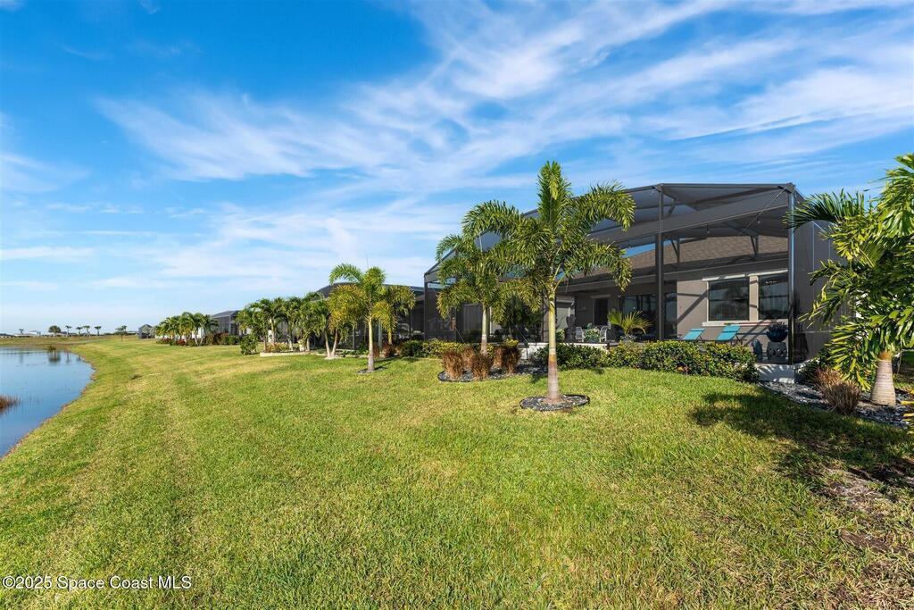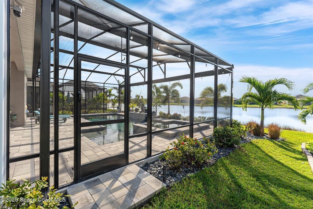 Out of the pages of a decorator magazine, this stunning pool home in Bridgewater, Viera's resort like 55+ community, has added features that will amaze you. Bask in the luxurious screened-in heated saltwater pool and spa (2024) overlooking the lake. Entertain in the elegant kitchen w/ upgraded cabinets w/soft close door/drawers, microwave/convection wall ovens and cooktop, designer backsplash and wine/coffee bar. Upgraded lighting featuring pendant lights, above and below cabinet lighting and custom light fixtures. Luxuriate in the stunning primary bath w/new barn door entry and remodeled tile shower! Primary walk-in complete w/built-ins and heated towel bar! Added professional landscaping and palm trees, lighting, stone beds, and exterior and interior were painted in 2024. Features include 8' doors, marble window-sills, LED lighting, garage with epoxy floor. Bridgewater's private clubhouse includes a heated pool, tennis & pickleball courts, a movie theater, fitness room, billiards!