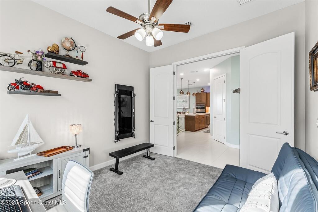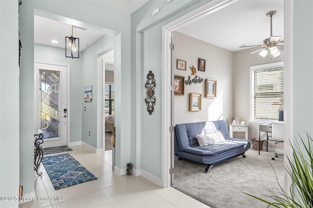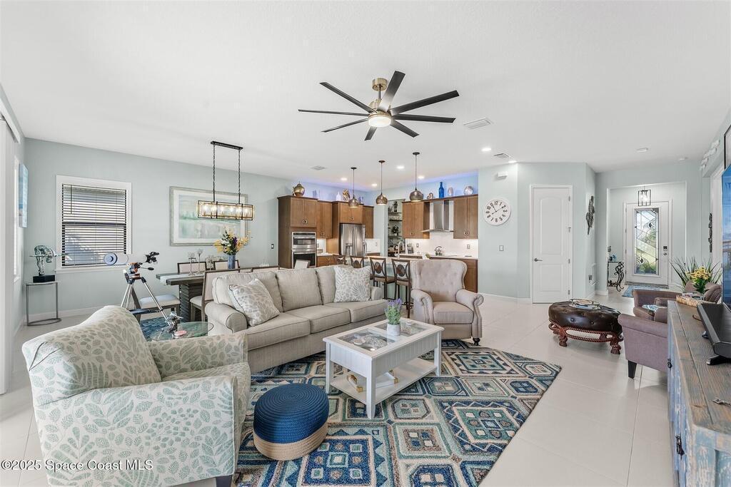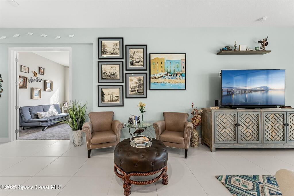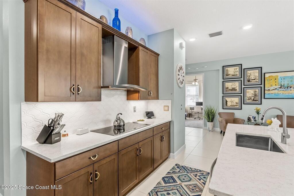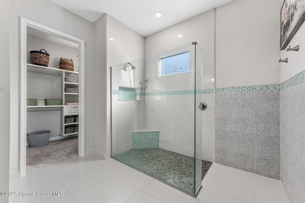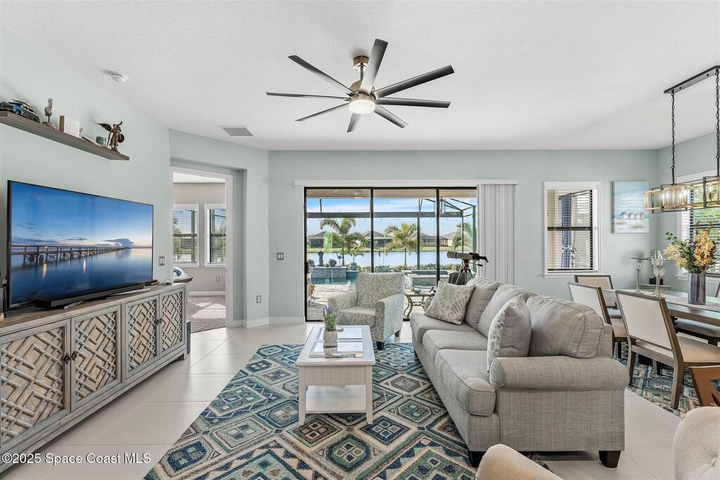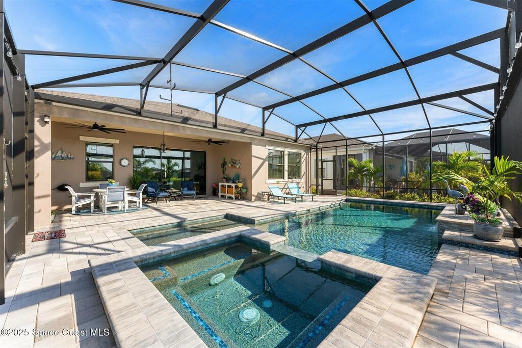 Out of the pages of a decorator magazine, this stunning pool home in Bridgewater, Viera's resort like 55+ community, has added features that will amaze you. Bask in the luxurious screened-in heated saltwater pool and spa (2024) overlooking the lake. Entertain in the elegant kitchen w/ upgraded cabinets w/soft close door/drawers, microwave/convection wall ovens and cooktop, designer backsplash and wine/coffee bar. Upgraded lighting featuring pendant lights, above and below cabinet lighting and custom light fixtures. Luxuriate in the stunning primary bath w/new barn door entry and remodeled tile shower! Primary walk-in complete w/built-ins and heated towel bar! Added professional landscaping and palm trees, lighting, stone beds, and exterior and interior were painted in 2024. Features include 8' doors, marble window-sills, LED lighting, garage with epoxy floor. Bridgewater's private clubhouse includes a heated pool, tennis & pickleball courts, a movie theater, fitness room, billiards!