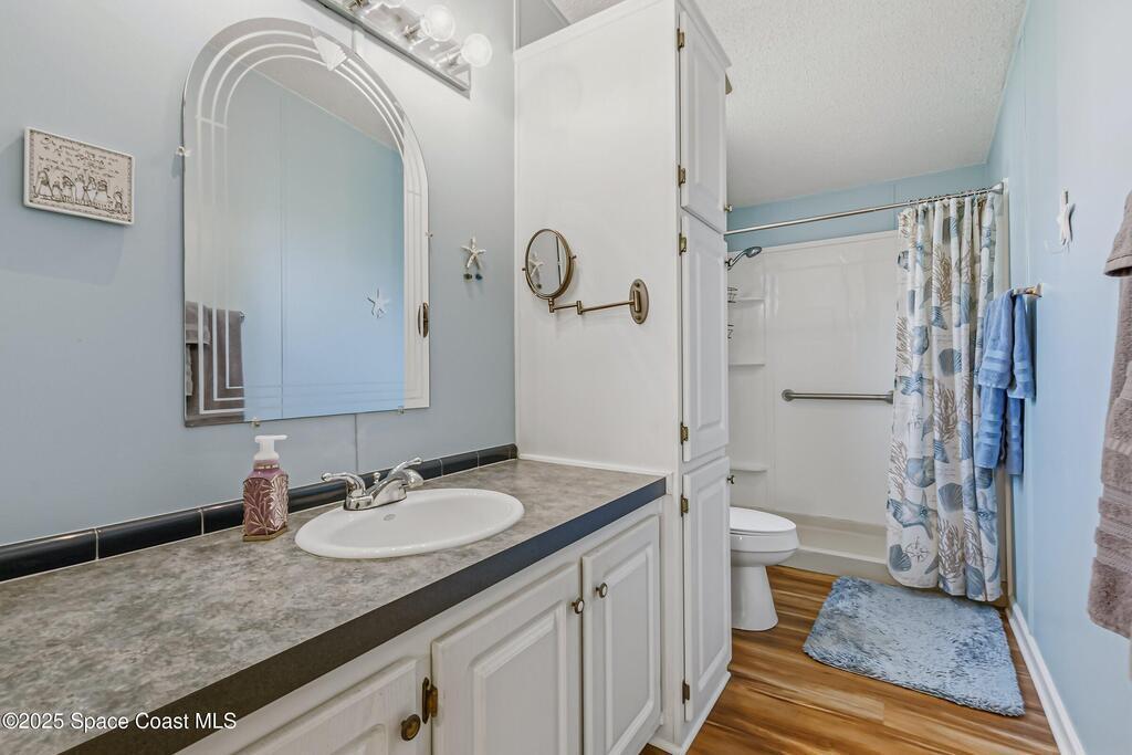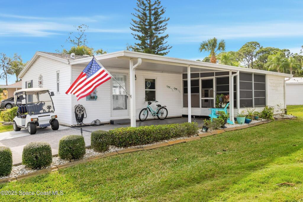 Not Far, close to Nasa,shopping,beaches,major travel arteries,not far from security gate and not far from the clubhouse!This home is perfectly located in the gated community of Lost Lakes!You own your land and your low HOA fee covers cable,internet,lawncare & security.this well maintained home with 2 bedrooms and two baths has waterproof laminate flooring throughout,a light and bright kitchen with island and chairs ,new windows and all the charm of Florida living .Your golf-cart is at your front door.This vibrant active community offers so much to enjoy from pickle ball,water arobics,holiday parties,and poker parties too!