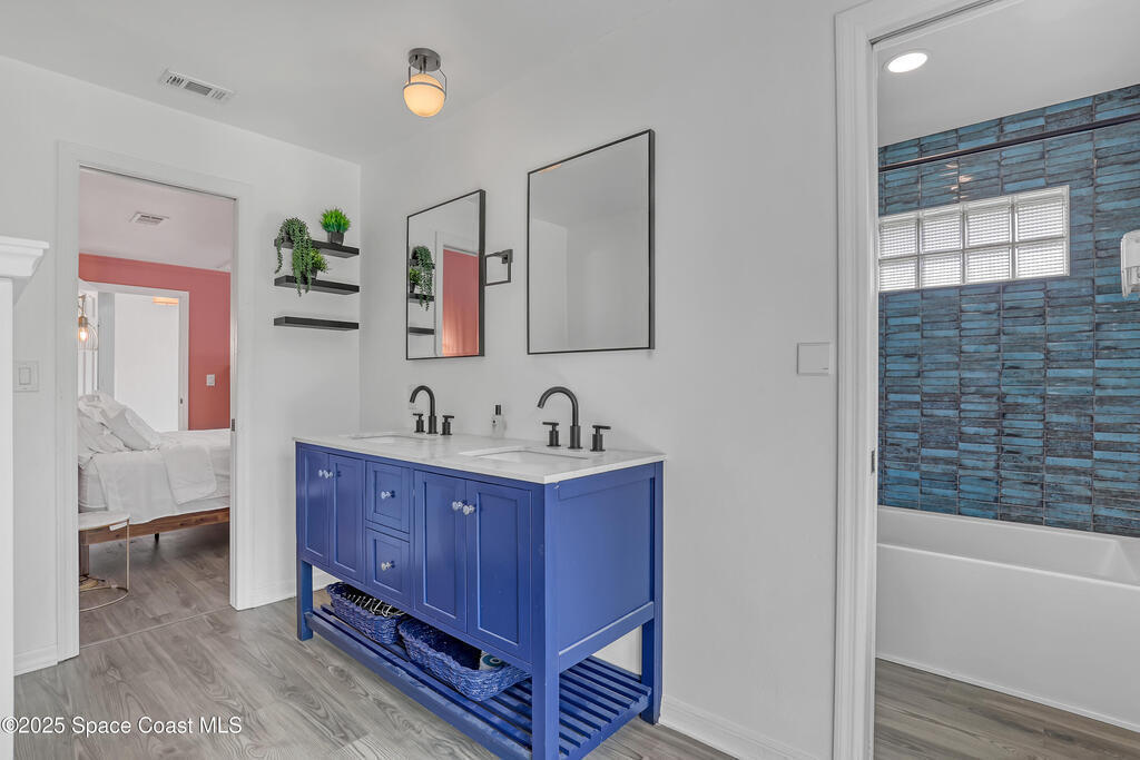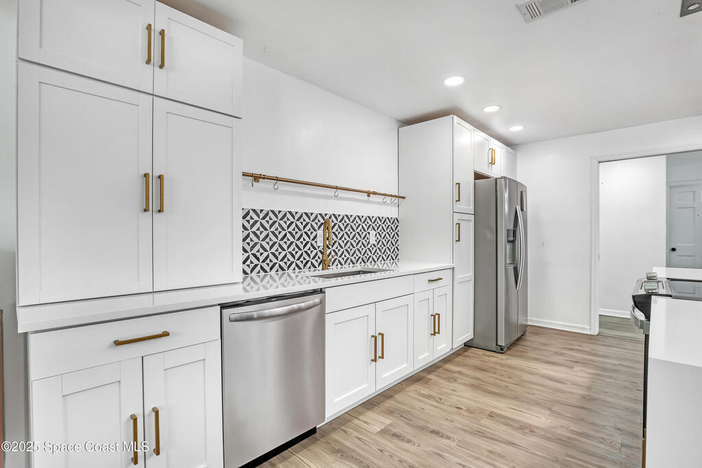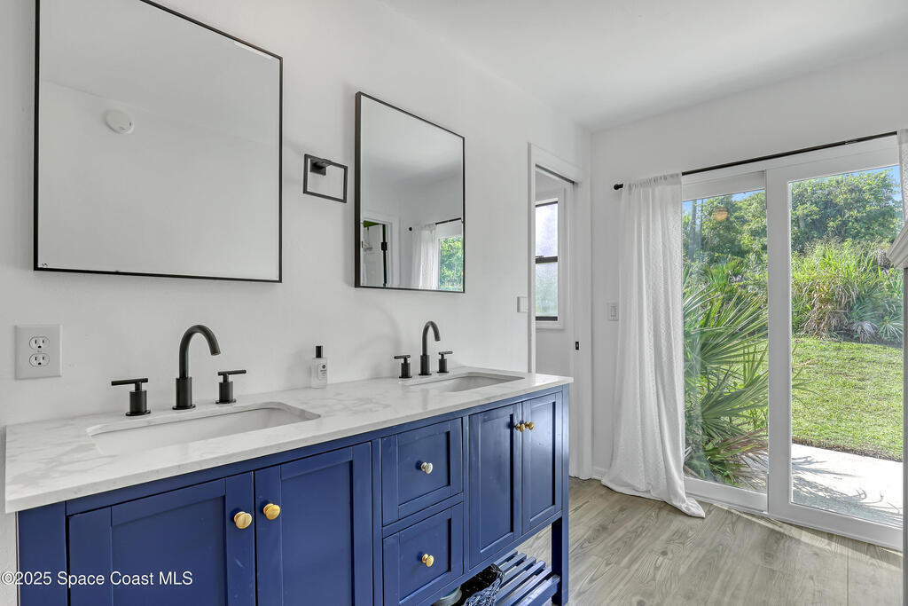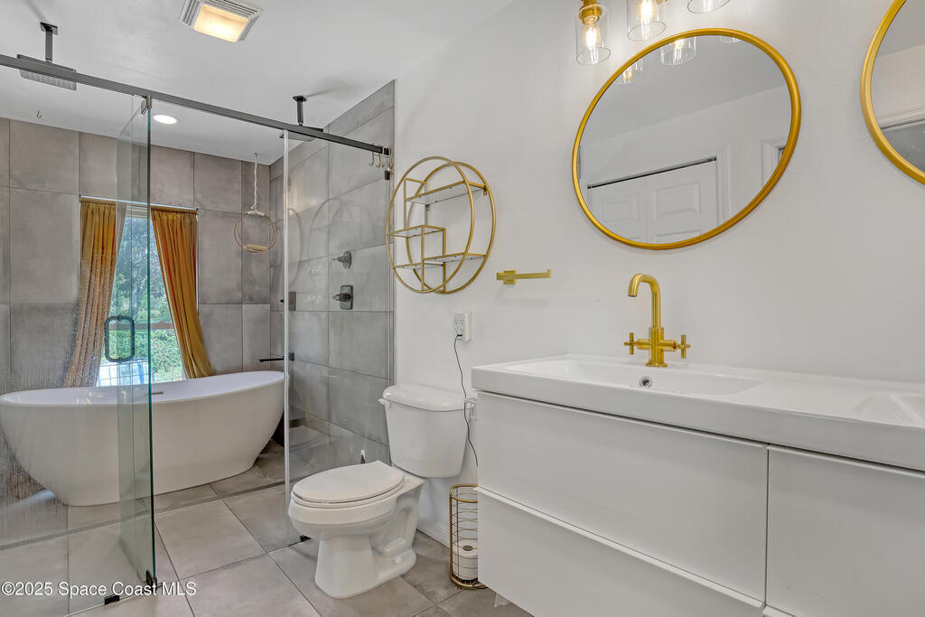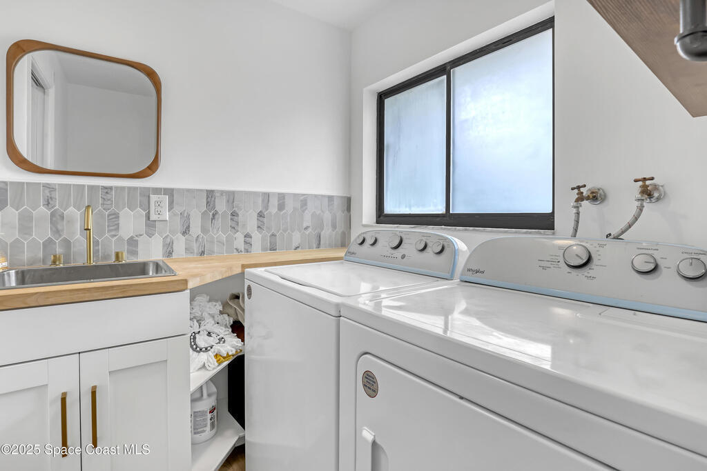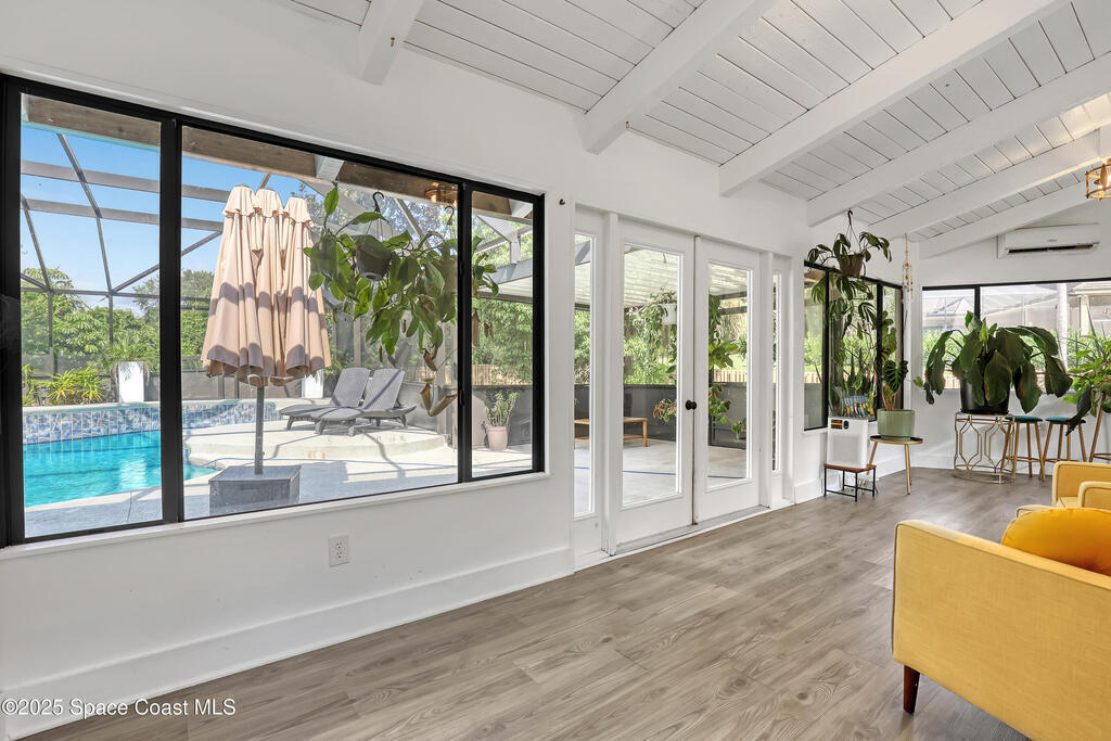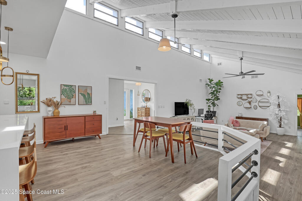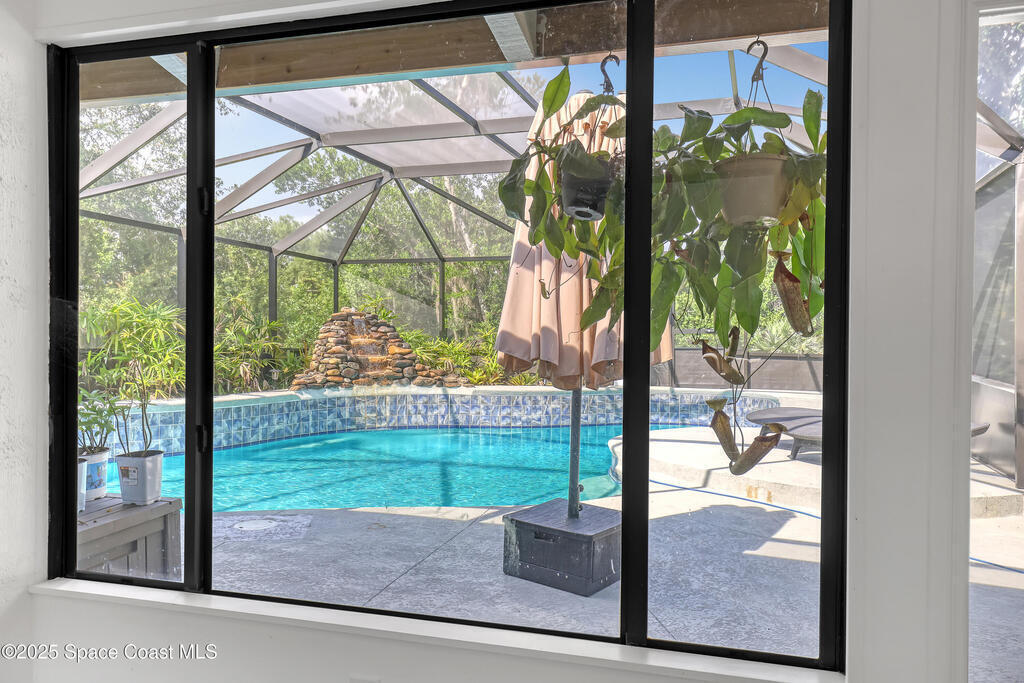 Watch live rocket launches from NASA Kennedy Space Center, relax on the beautiful beaches nearby, and explore historic Titusville! Welcome to this gorgeous, fully renovated Mid-century Modern home featuring a newer roof (2022) and soaring vaulted ceilings, exposed wooden beams, and walls of windows that flood the space with natural light. The open floor plan offers 3 bedrooms, bonus office, two dining areas and a chef's kitchen with a large island, quartz waterfall countertops, modern marble backsplash, and elegant gold accents. Step outside to your private oasis: a completely refinished Saltwater pool with a tranquil waterfall feature, surrounded by a covered sitting area--perfect for entertaining or relaxing. 3-car garage with high ceilings and a spacious concrete patio--ideal for working on vehicles or extra parking 3 driveways for easy access and ample guest parking