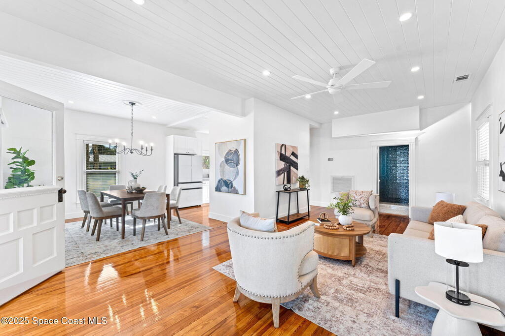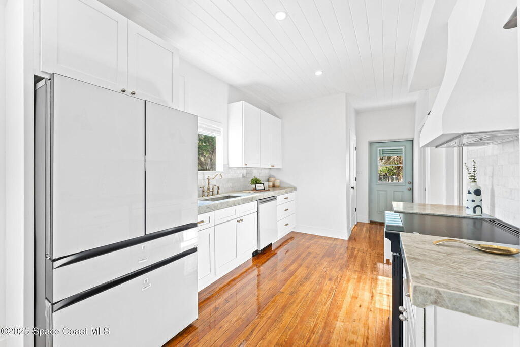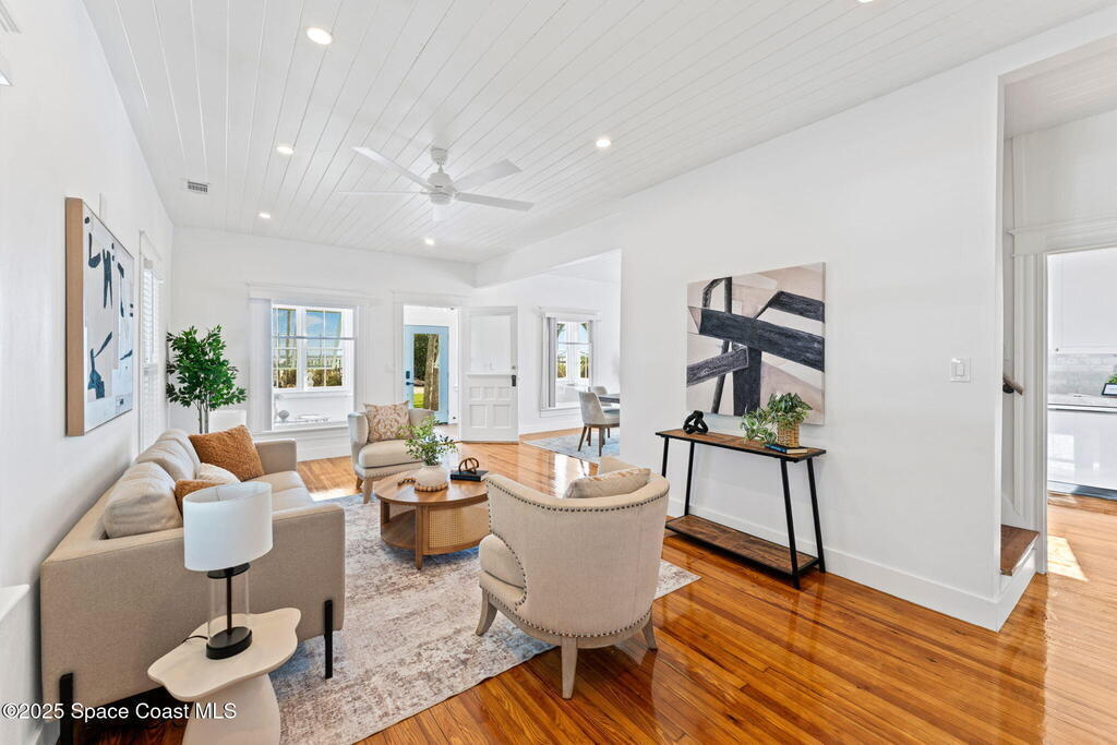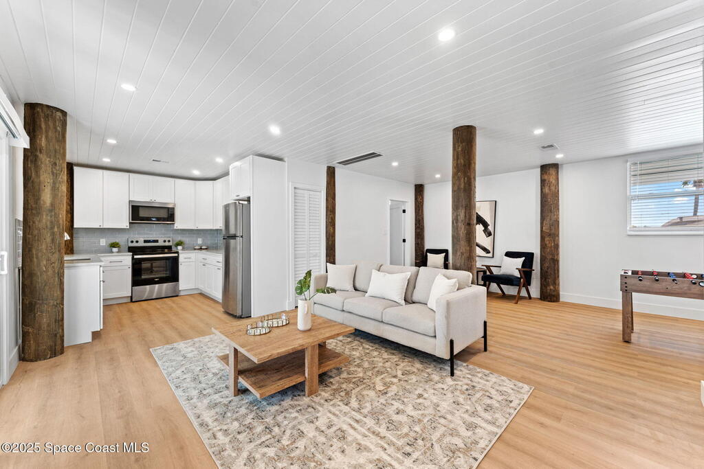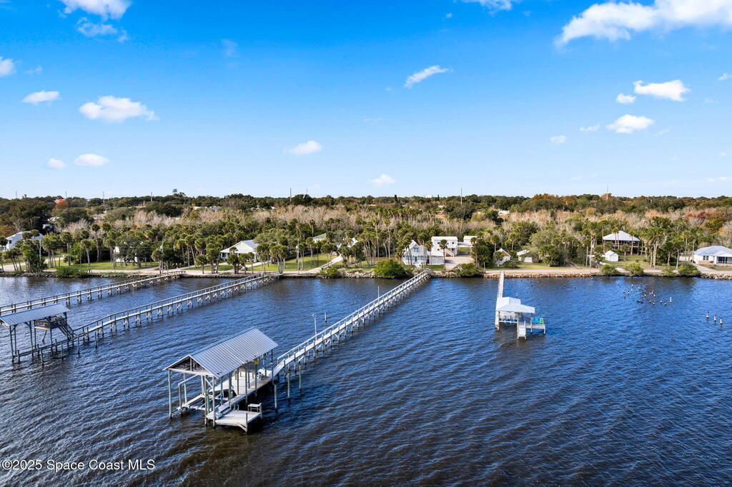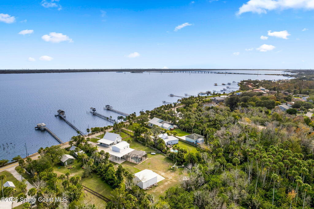 One of the most unique Waterfront compounds on 1.21 Acres on the Indian River! This property features a 1914 Key West style home and a 2009 Barn both completely renovated and a large metal garage. Perfect for an owner's home and rental or any configuration you desire! The main house has been completely restored with a complete re-pipe (PVC), metal roof, 2020 AC, 29k crawlspace SmartJack system for foundation, sump pump, restored windows and refinished original floors. Brand new kitchen and bathrooms in both properties includes Taj Mahal Quartz, high end cabinetry and brushed gold hardware. Two septics replaced in 2021. Barn has upstairs apartment and clubhouse downstairs for the pool. 2021 HEATED designer Pool/spa/grotto w/waterfall and fountains and 51k screen enclosure. Metal garage w/power/water in back of property along w/small fishing pond. Covered RV pad w/hookups. 350ft Dock w/power+water with two levels for NASA views and rocket launches. Newer 10k lb boat lift in 20x40 slip.