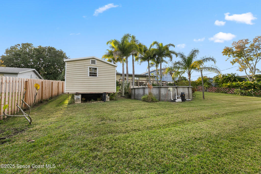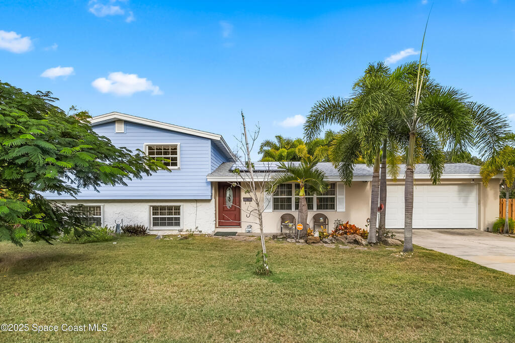 Split-level home with scenic backdrop overlooking Elbow Creek. Entry level features a living/dining room combo and updated kitchen with sliding doors to a large patio overlooking a lush backyard with palm trees, shrubs, and a mango tree. Upper level offers 3 bedrooms with wood floors and 2 baths. Lower level includes a spacious living room, bedroom, bath, and laundry room--ideal for an in-law suite or rental opportunity. Updates include new sewer lines throughout, roof (2022), water heater (2020), AC (2021), accordion shutters, brand new impact front door, new wood fence, and high-end kitchen appliances. The staircase has wood floor under the carpet. Above-ground pool (4 yrs) with excellent pump system. Extra concrete slab on SW side accommodates boat, trailer, or RV. Oversized shed frees garage for parking. New Hardie board siding on 2-story section. Centrally located minutes to Downtown Eau Gallie, shopping, dining, and the beach.