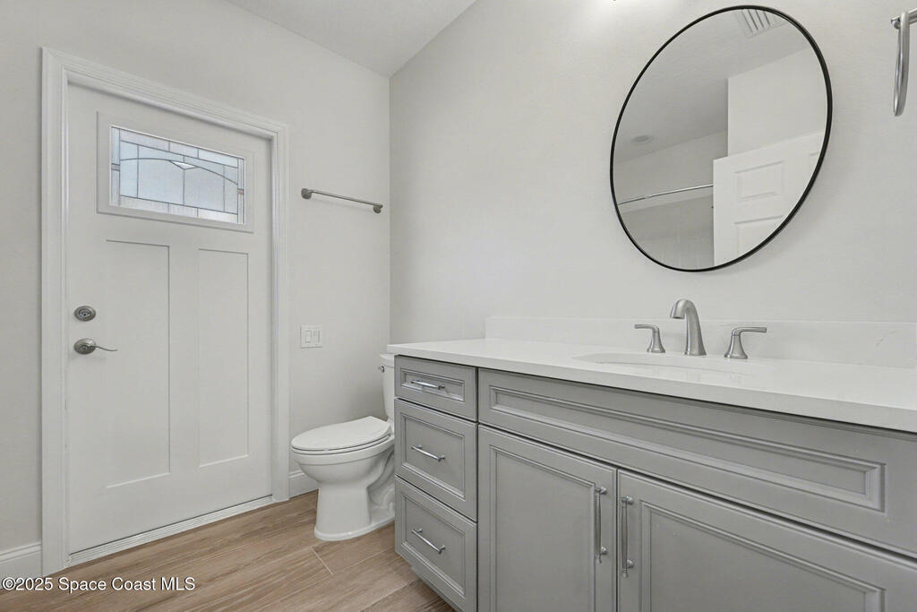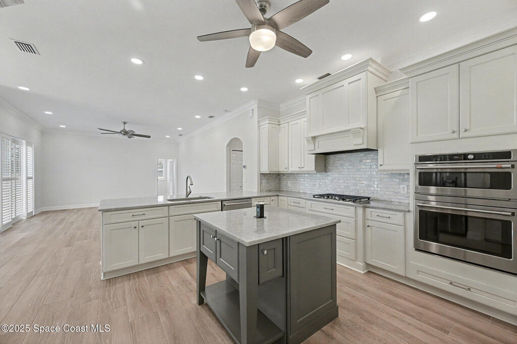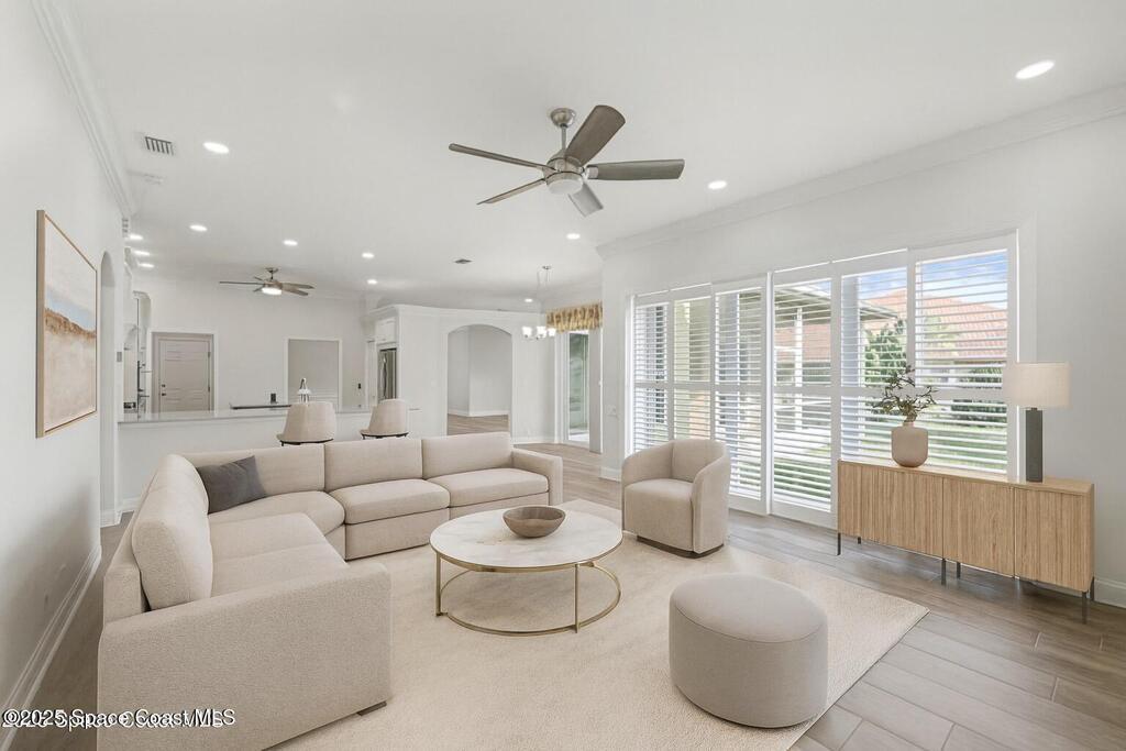 Located in the gated Baytree community of Suntree, this 4BR/3BA home features a private, enclosed in-law suite, 3-car garage, and golf course views overlooking the 4th hole of a Top 75 Florida course. Built by a respected luxury builder, the home offers an open floor plan, high ceilings, Porcelain plank flooring throughout, and abundant natural light.The chef's kitchen includes high-end appliances, gas cooktop, Convection oven, center island, granite countertops, and marble backsplash. Formal living and dining areas are ideal for entertaining. Plantation Shutters throughout and a Digital irrigation system. The spacious primary suite features a remodeled bath with porcelain tile, oversized roll-in shower, modern fixtures, and large walk-in closet. Impact windows, sliders, and garage doors (2023). Roof 2017, A/C 2023. Washer/dryer included.Baytree amenities include 24/7 gate guard entry, pool, tennis courts, and playground. Move-in ready luxury in a prime Suntree location.