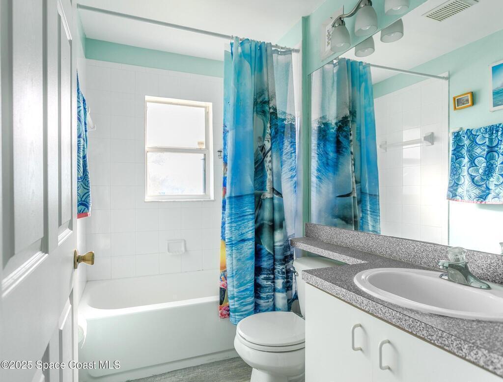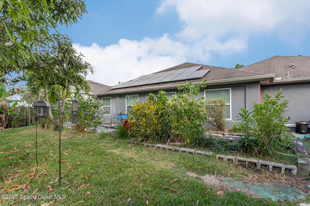 BIG Price Improvement!!! Quiet SE Palm Bay neighborhood just minutes from Bayside Lakes! This 4-bedroom, 3 bath home features a desirable split floor plan and luxury vinyl plank flooring throughout the living, kitchen, dining areas, and bathrooms. The kitchen was remodeled approximately five years ago and includes granite countertops and a stylish backsplash. Major updates include a central A/C system and a hot water heater, both approximately three years old. Enjoy year-round living in the spacious 20' x 40' enclosed and insulated patio with hurricane windows, new screens, and its own A/C and heat added three years ago. The primary and second bathrooms offer walk-in showers, while the third bath includes a shower/tub combo. Additional features include an insulated garage door, solar panels and a backyard with mature fruit trees, including four mango trees, one banana tree, and a cherry tree. A great combination of comfort, upgrades, and Florida outdoor living.