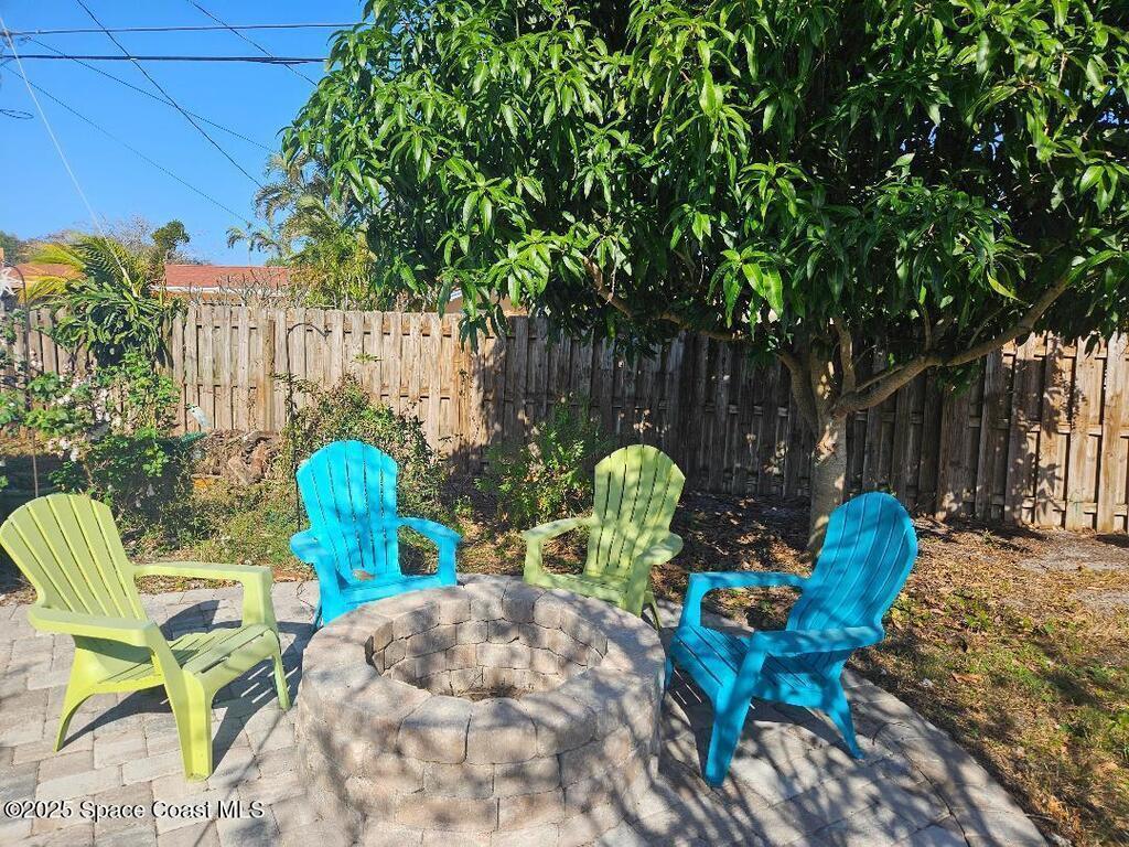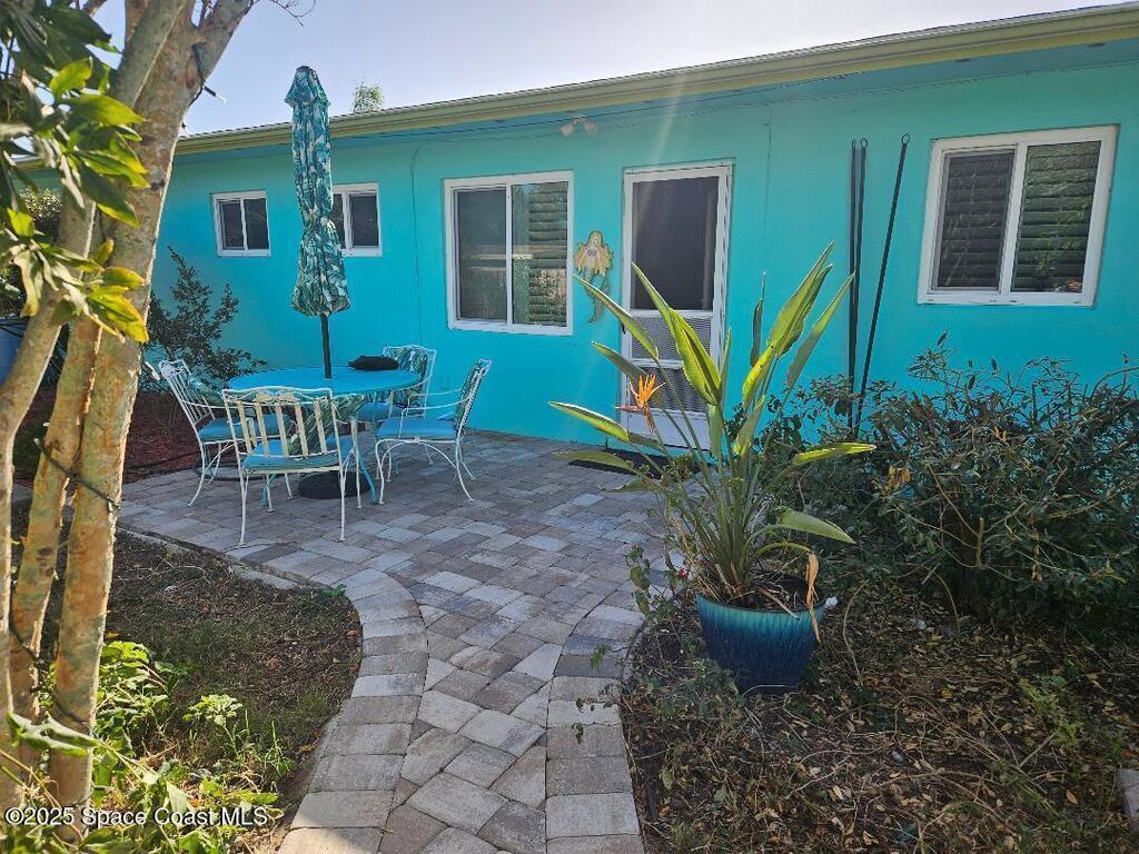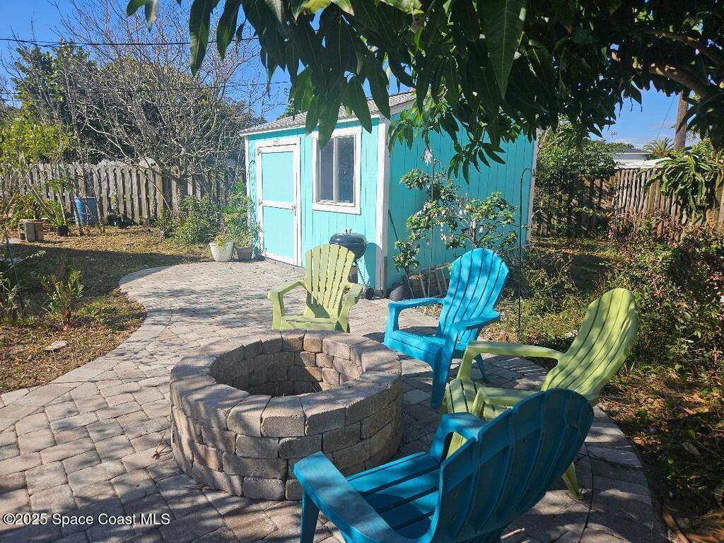 This vintage chic home with coastal charm could be your tropical retreat. Located on the Barrier Island with Surfing, Fishing, Sun Bathing or a Stroll on the Beach, within minutes away. This home is airy with light filled rooms that offers a timeless & functional design.Polished terrazzo floor throughout add to the charm. The endless list of updates includes, new hurricane windows & doors, supply & drain lines replumed, recessed lighting, kitchen cabinets, counters & backsplash. Primary bathroom refreshed with new tiles in shower, vanity & lighting. Plantation shutters throughout. Screen porch at the front of the house. Driveway, walkways and patio with brick pavers. Roof 2014.Inside laundry room with washer& dryer. Brick Firepit to enjoy the chilly nights.Fenced yard. 10X 12 storage shed.