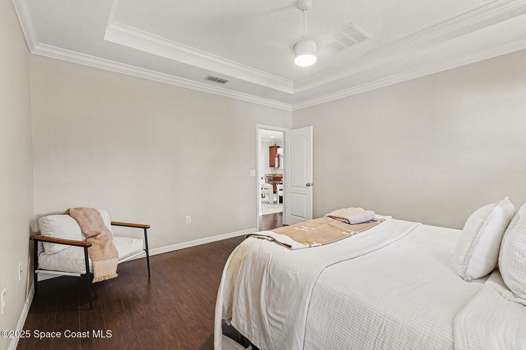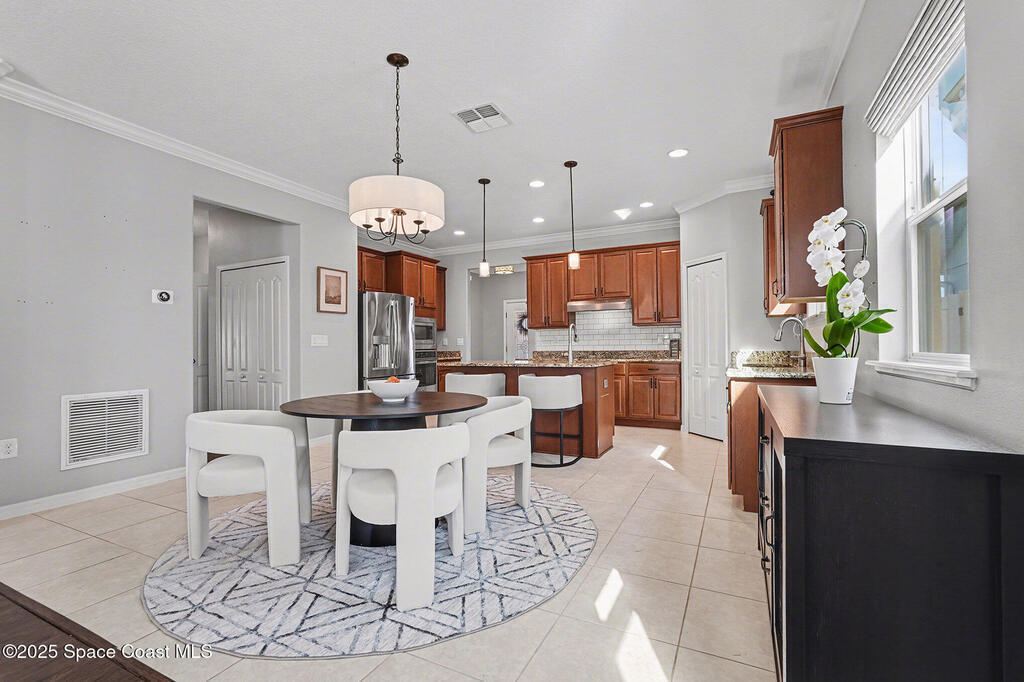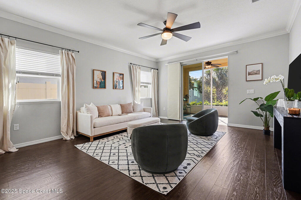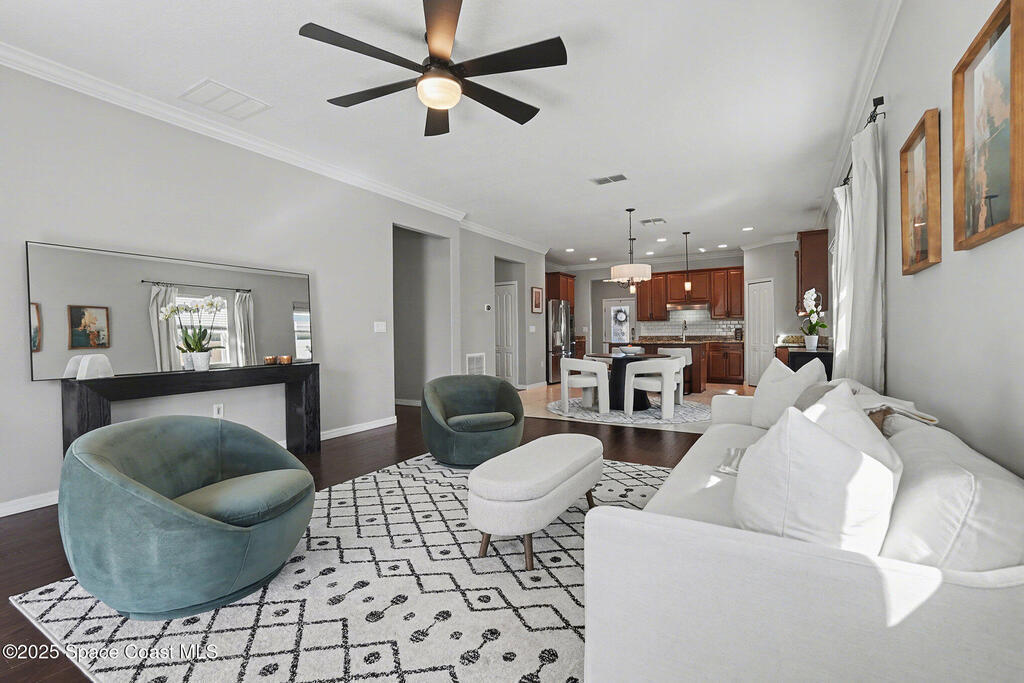 Welcome home to this beautifully upgraded 4-bedroom, 2-bath residence offering 1,713 sq. ft. of comfortable living space in desirable West Melbourne. This well-maintained home features 9+ ft ceilings, elegant crown molding, and stylish laminate flooring, creating a bright and inviting atmosphere. The spacious chef's kitchen is perfect for entertaining and everyday living, complete with granite countertops, bullnose corners, modern finishes, and a new dishwasher (2024). Major updates include a new roof and garage door (2023) for added peace of mind. Enjoy Florida living year-round on the expansive 1030 screened porch, overlooking a preservation area with no rear neighbors, offering exceptional privacy. Additional features include smart switches and an electric car charger. Conveniently located near shopping, dining, parks, major roadways, and A+ schools, this move-in-ready home offers comfort, privacy, and convenience.
