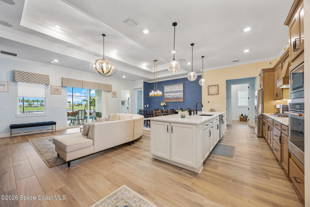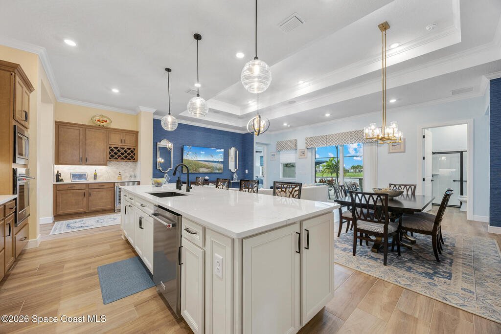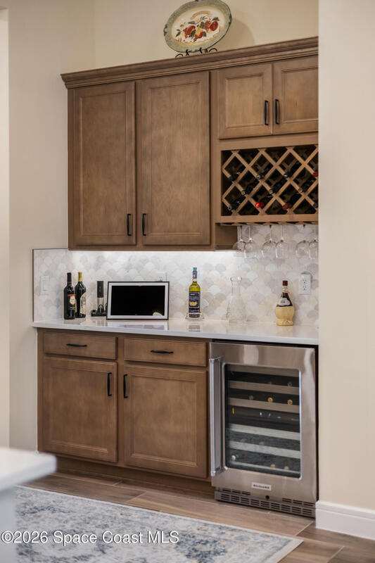 Located in 55+ Del Webb with resort-style amenities center, pool, tavern, and golf course membership included. This extremely upgraded home offers a level of finish, and peace of mind that's unmatched! Floor plan includes two full bedrooms suites, three full baths, and office/flex space. This plan provides an expanded primary suite with larger bath and closet. EVERY builder upgrade was include at purchase and then some! Wide plank tile flooring, tray ceilings, crown molding, custom closets, upgraded lighting, quartz counters, 12' island, beverage center, wine cooler, under cabinet lights, gas appliances, upgraded fixtures, RO water filter, central vacuum, hurricane windows, & insulated garage doors, attic flooring, climate controlled 3-car garage with epoxy floors & sink. Professionally designed interior furnishings are negotiable. Outdoor living features extended lanai, heated saltwater pool & spa, screen enclosure, landscape lighting, gas grill hookup, whole home Generac generator.