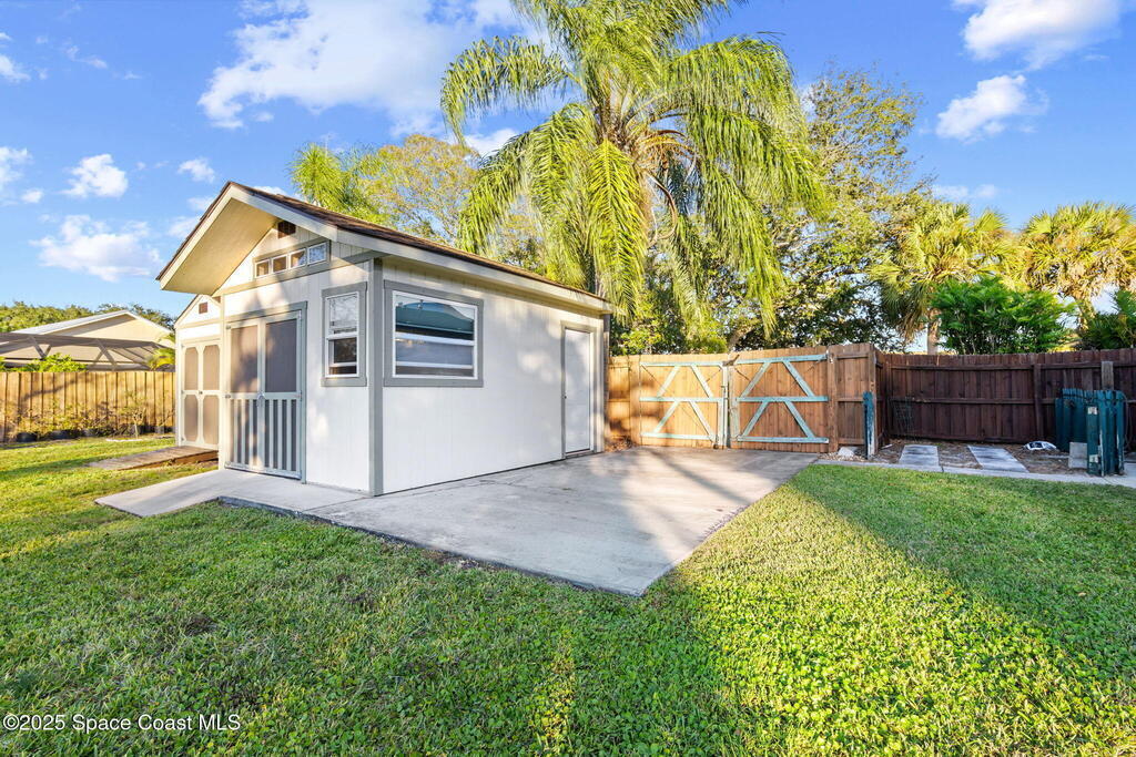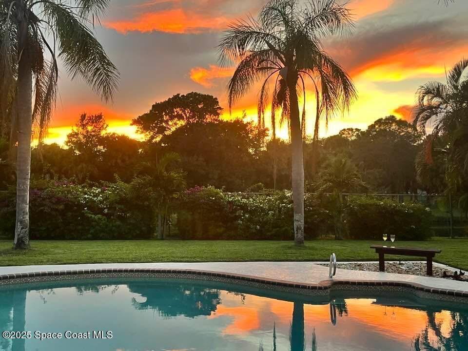 Set on a rare double lot, this pool home feels like a private tropical retreat. Evenings glow with sunset views over the canal, framed by palms, lush landscaping, and Florida wildlife. The backyard features mature tropical fruit trees and a lighted pergola for outdoor entertaining. A powered workshop adds creative flexibility, while double gate access provides room for recreational toys. A large screened in porch connects seamlessly to the outdoor living area. Inside, the primary features two walk in closets and ensuite bathroom. Notable updates include a premium kitchen remodel, 2022 roof, 2020 AC condenser, 2023 gas water heater, storm shutters, and a side load garage with heavy duty Husky(r) organization shelving. Ideally located near Publix, the Eau Gallie Arts District, and I-95.