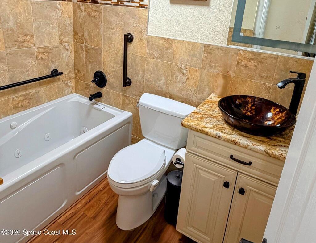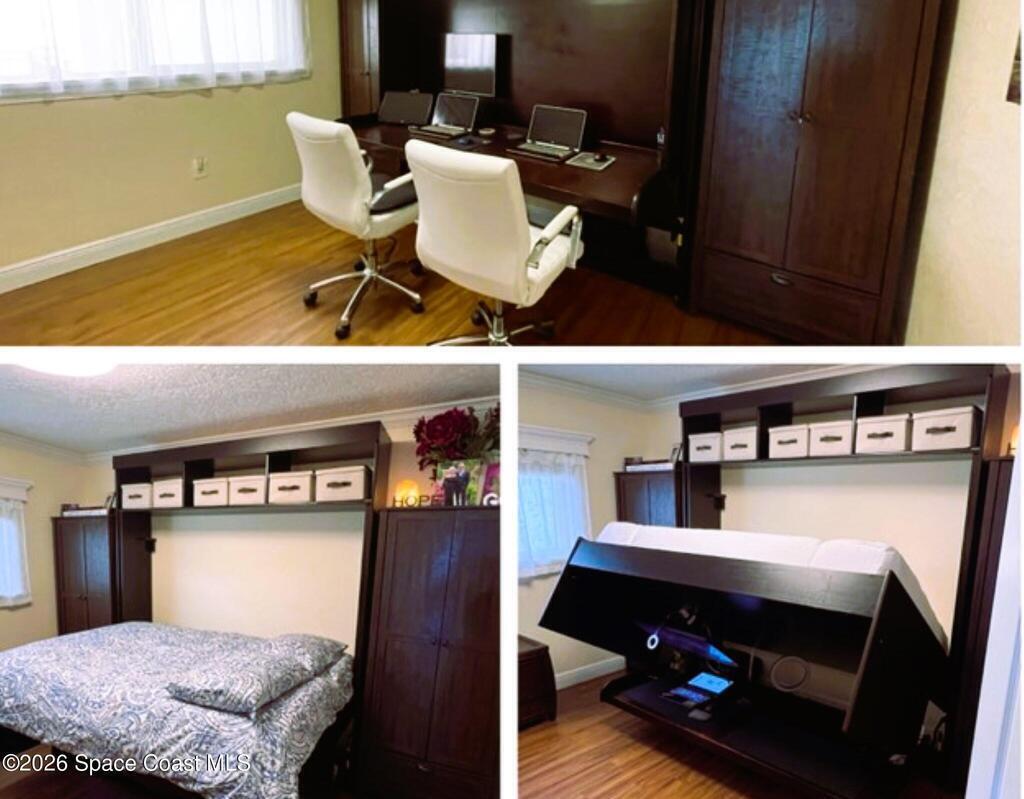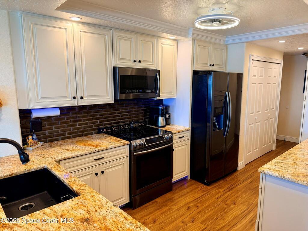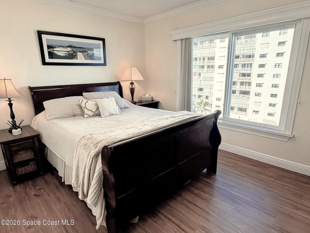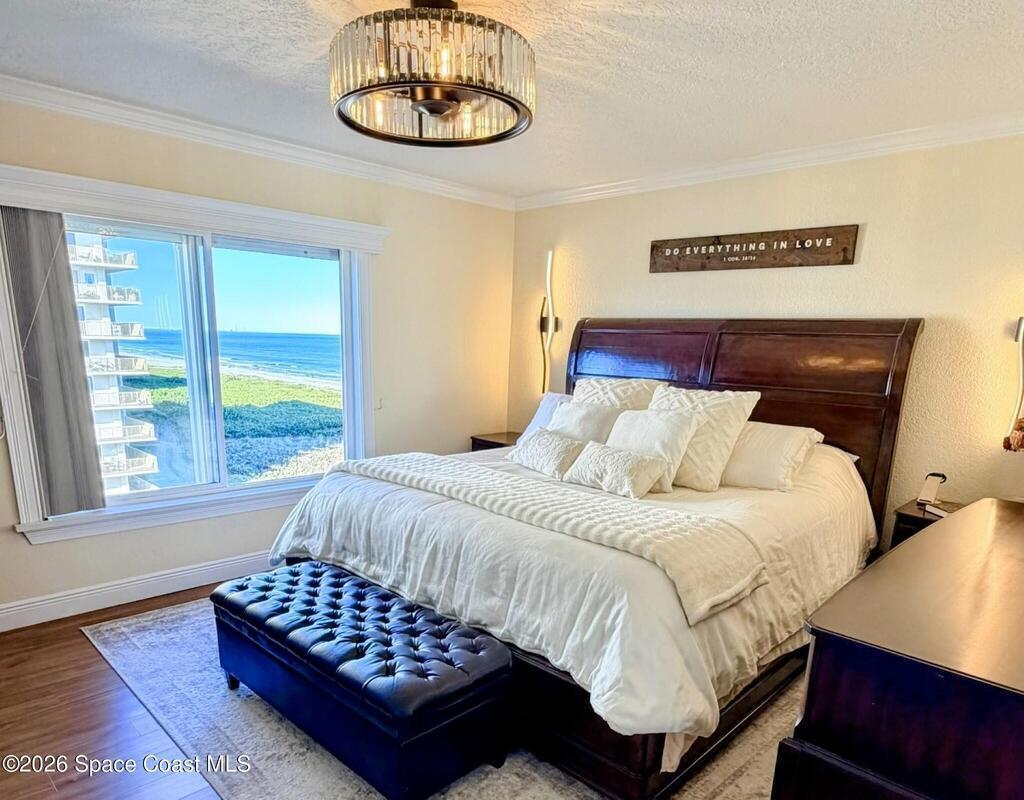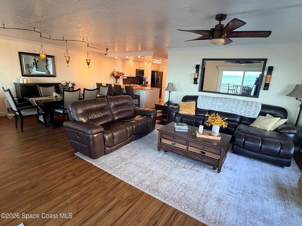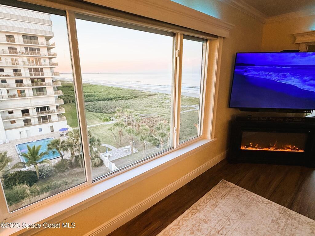 OCEANFRONT 3BR/2BA NE CORNER UNIT ON 7th FLOOR w RARE 2 CAR GARAGE. Panoramic Atlantic views from kitchen, living, dining, primary, and guest bedroom. Completely renovated with luxury vinyl plank flooring, high-end granite countertops, custom wood cabinetry, granite sink, custom lighting, and motorized voice-activated blinds. The primary bath has a walk-in shower, guest bath has a jet tub. 3rd bedroom is Full Murphy Bed/Office for remote work and guests. Hurricane-rated windows, slider, and shutters. Crown molding throughout, in-unit laundry, Coastal AC Unit, and 2025 tankless water heater. Direct beach access, heated oceanfront pool, fire pit, grill, and clubhouse with full kitchen/dining room. Enjoy sunrises, rocket launches, and ocean breezes from the private balcony. Walk to downtown Cocoa Beach. Fully funded reserves, SIRS compliant, concrete restoration TBC 2026. Furnishings negotiable. Move-in ready for living or investment. Direct sale opportunity w owner.