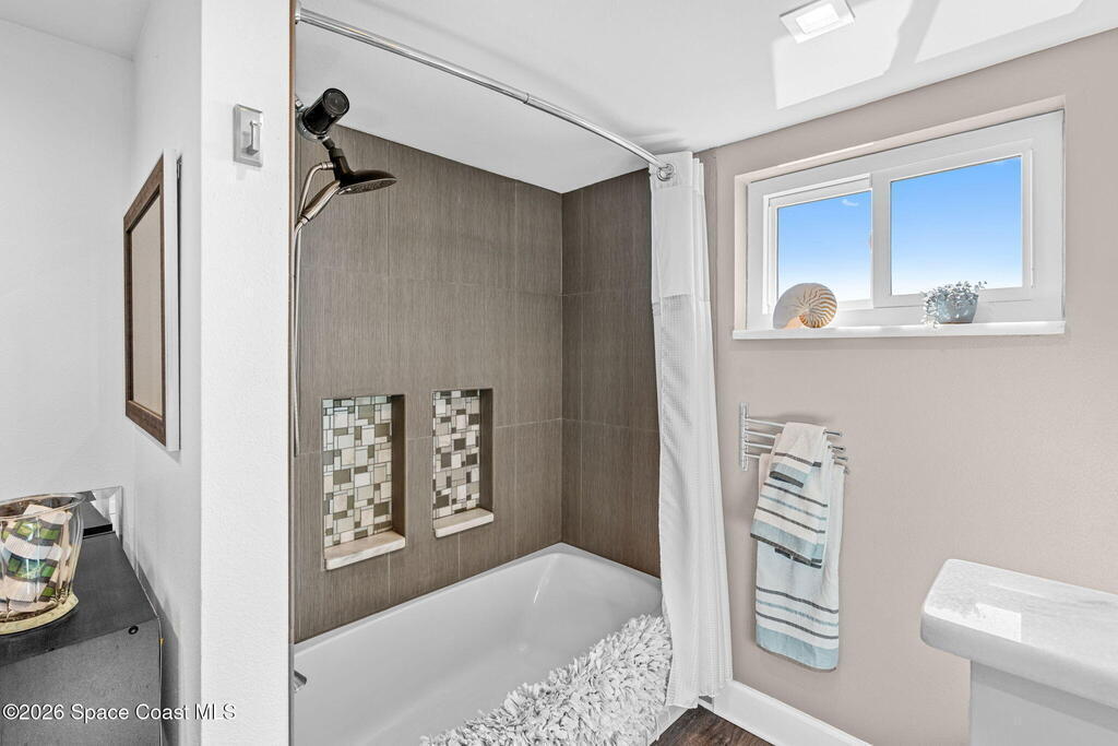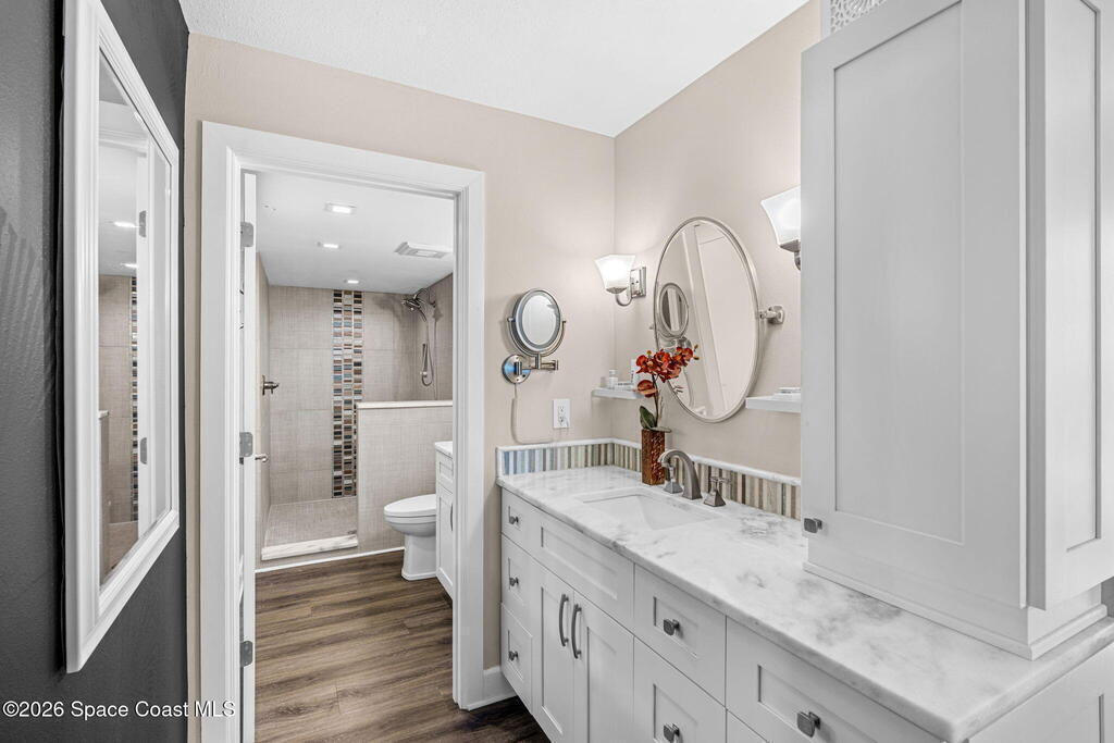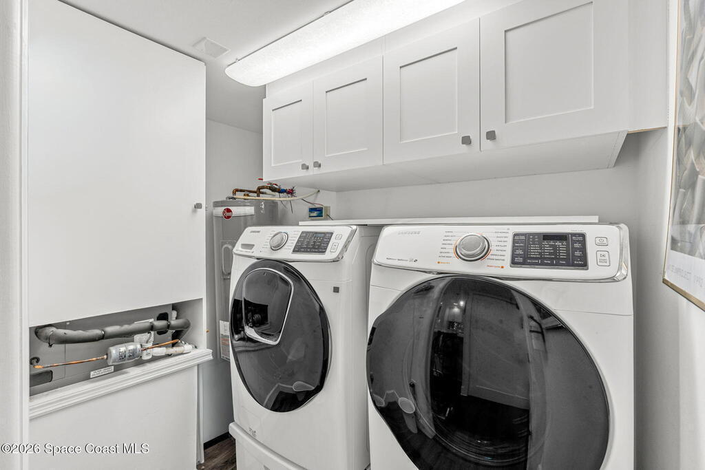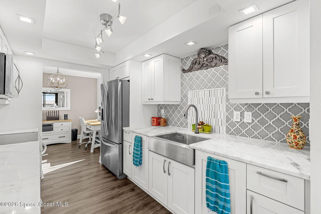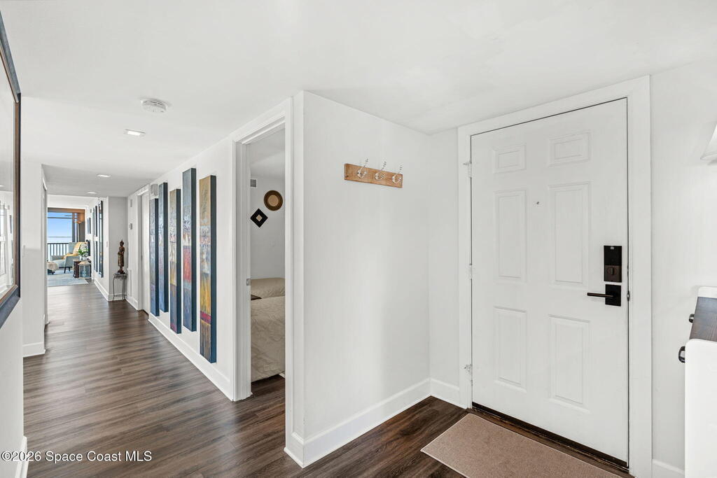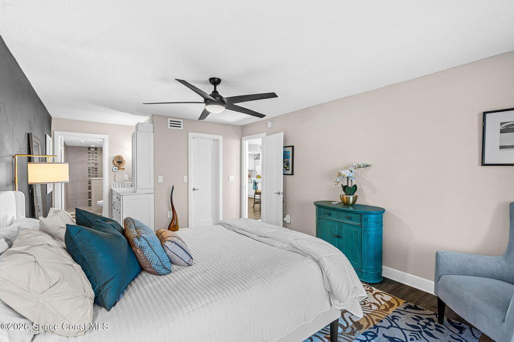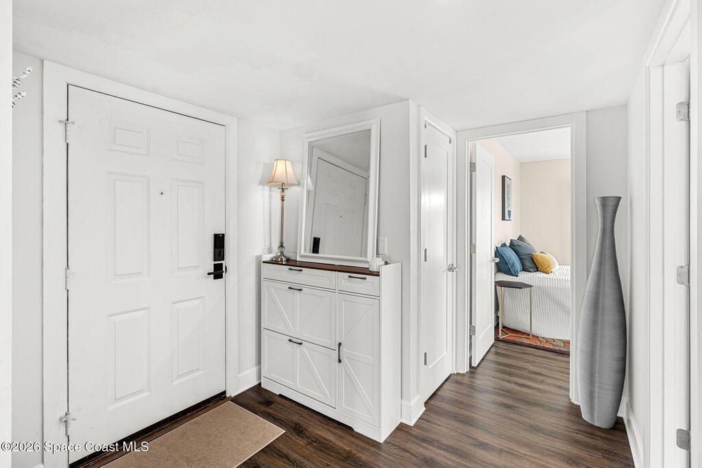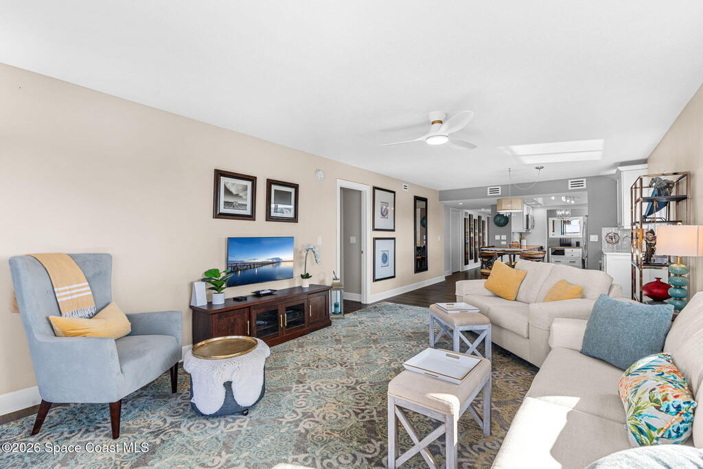 This move-in ready, fully renovated end-unit condo boasts breathtaking 180 degree water views, including direct views of the Banana River from the large screened balcony, making the property feel like a private retreat! Savor spectacular sunsets while watching dolphins and manatees glide through the adjoining canal to the community's private lagoon. Modern interiors feature a gourmet kitchen with quartzite countertops and stainless steel appliances, wine/coffee bar, luxurious updated bathrooms, large walk-in primary closet, and cohesive luxury vinyl flooring throughout. Enjoy hurricane impact windows, new sliding glass doors, and in-unit laundry for ultimate comfort and peace of mind. This prime location offers walking distance to pristine beaches, local restaurants, and shopping. Set sail from vibrant Port Canaveral, only a few minute drive away. The community offers two pools (one heated), tennis/pickleball courts, clubhouse, kayak storage, dock with river access, and much more!