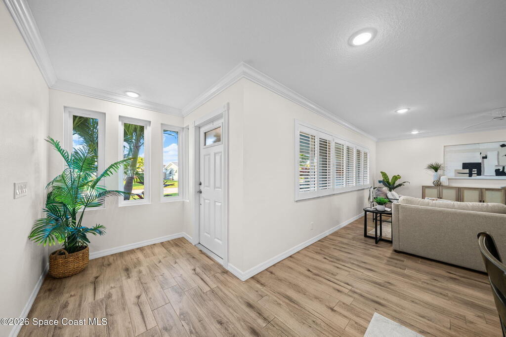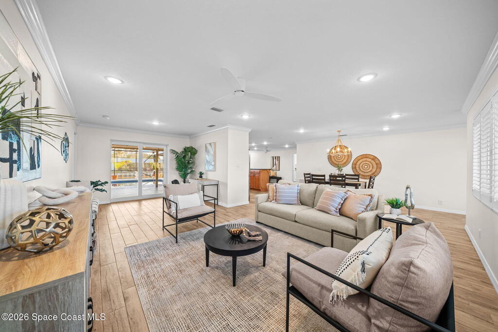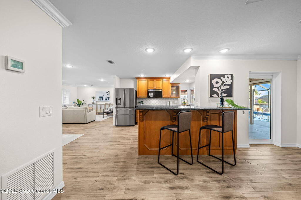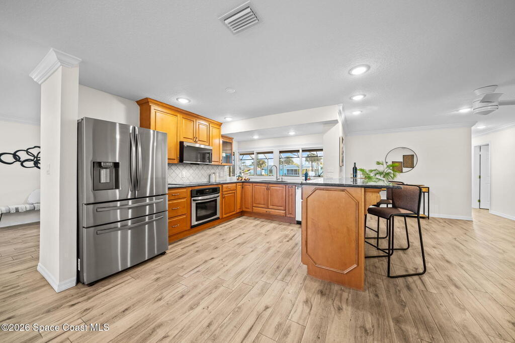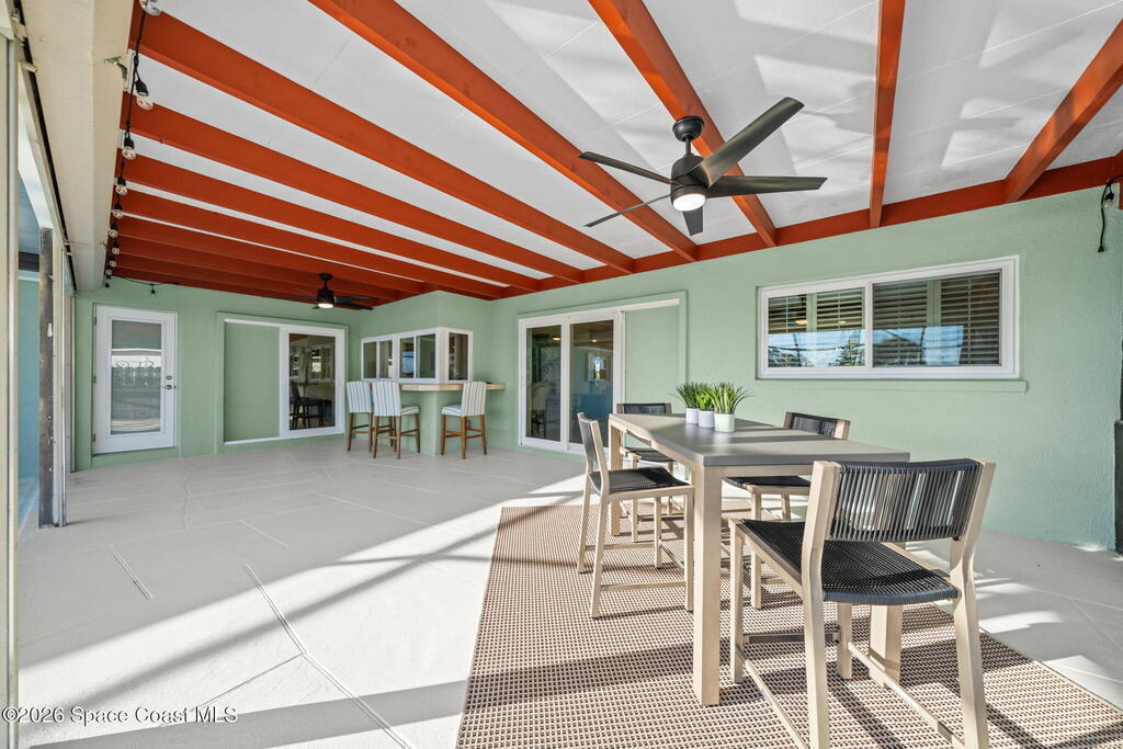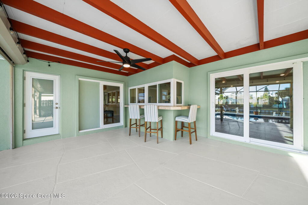 Exceptional canal front living in the heart of Cocoa Beach! This fully renovated waterfront home is bright, welcoming, and completely turnkey, boasting hundreds of thousands in recent improvements. Major upgrades include a 2022 Metal roof, 2022 HVAC system, 2022 tankless water heater, updated electrical, and replacement of all cast-iron plumbing under the home and to the street with PVC plumbing. Impact-rated windows, doors, and sliders throughout along with an impact-rated garage door.Designed for boaters and outdoor enthusiasts, the property features a brand new seawall, a newer dock with an new dock walkway, and a canal that is routinely dredged by the City. The outdoor space is designed for entertaining, featuring a re-surfaced pool and deck, a new screen enclosure, a covered back patio with a decorative wood ceiling and bar seating that opens seamlessly to the kitchen through pass-through windows.Additional upgrades include hurricane shutters, Kevlar hurricane screen