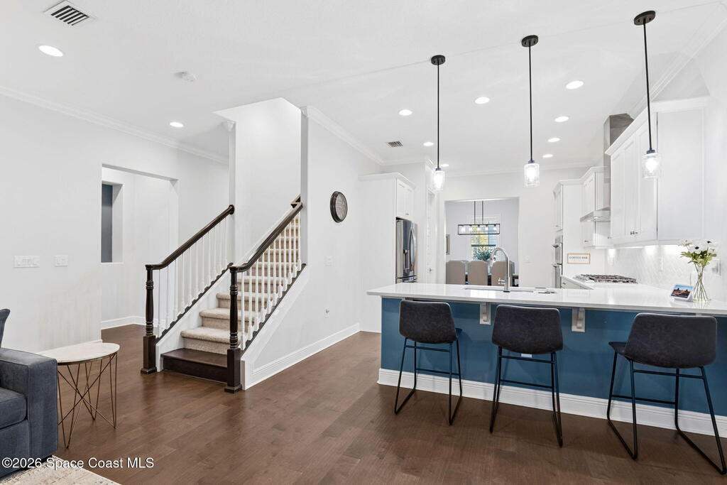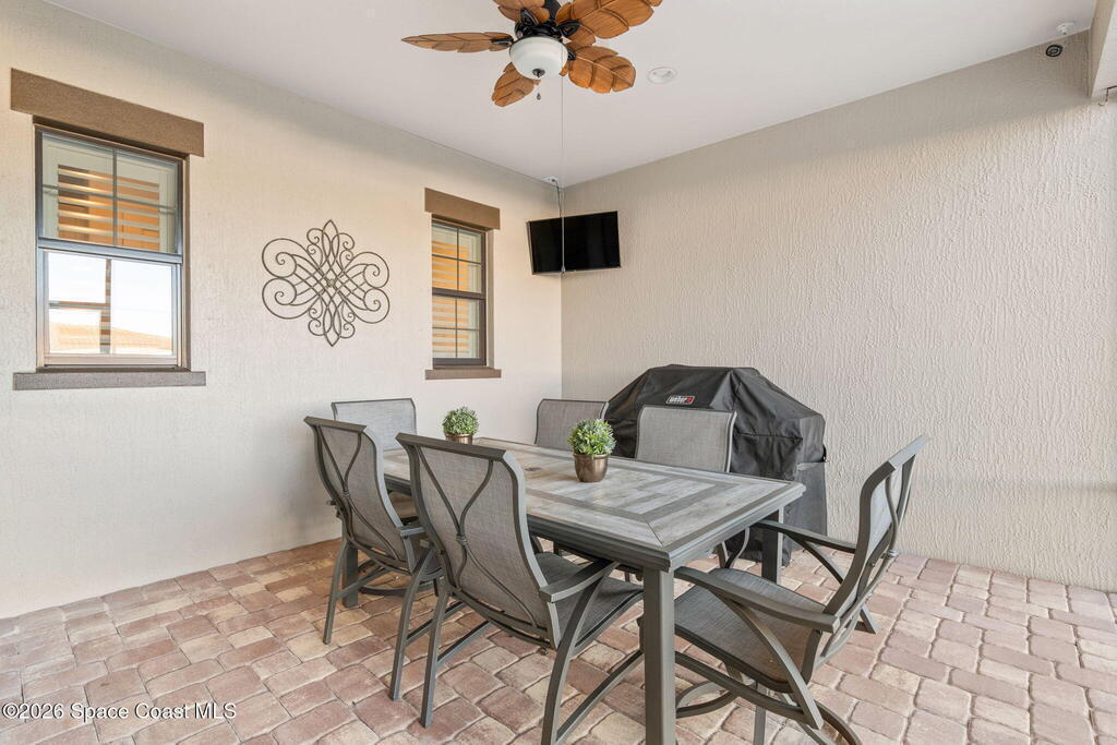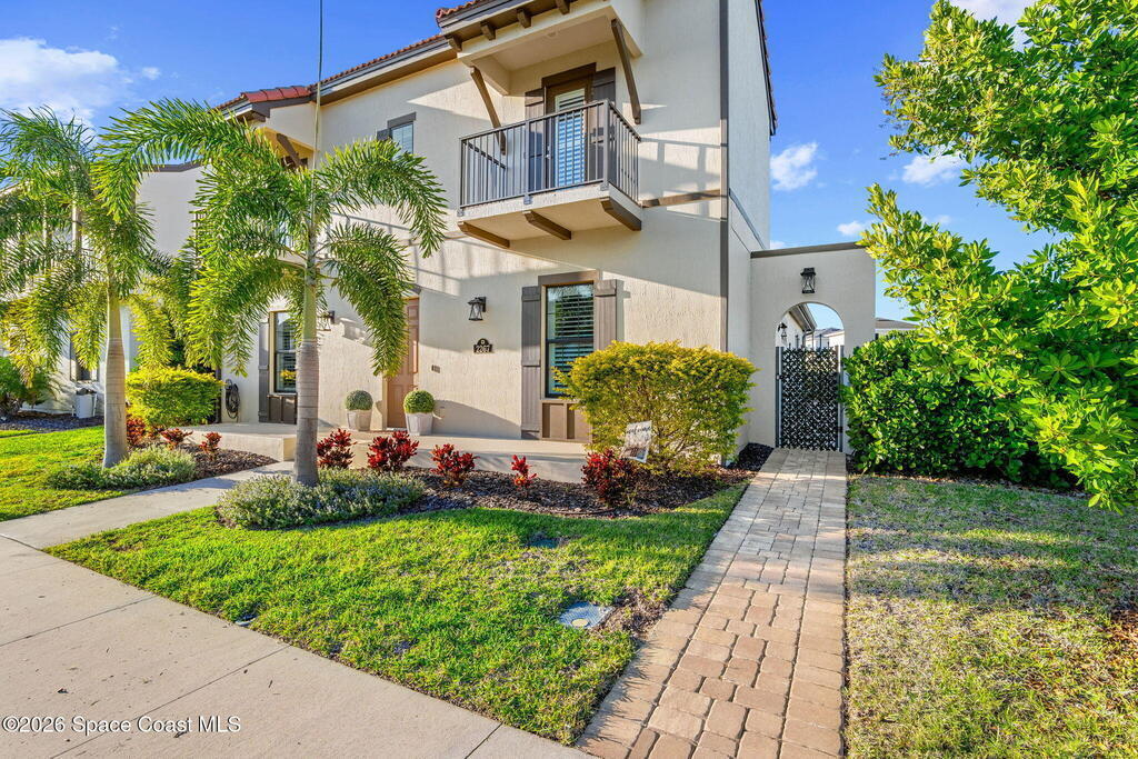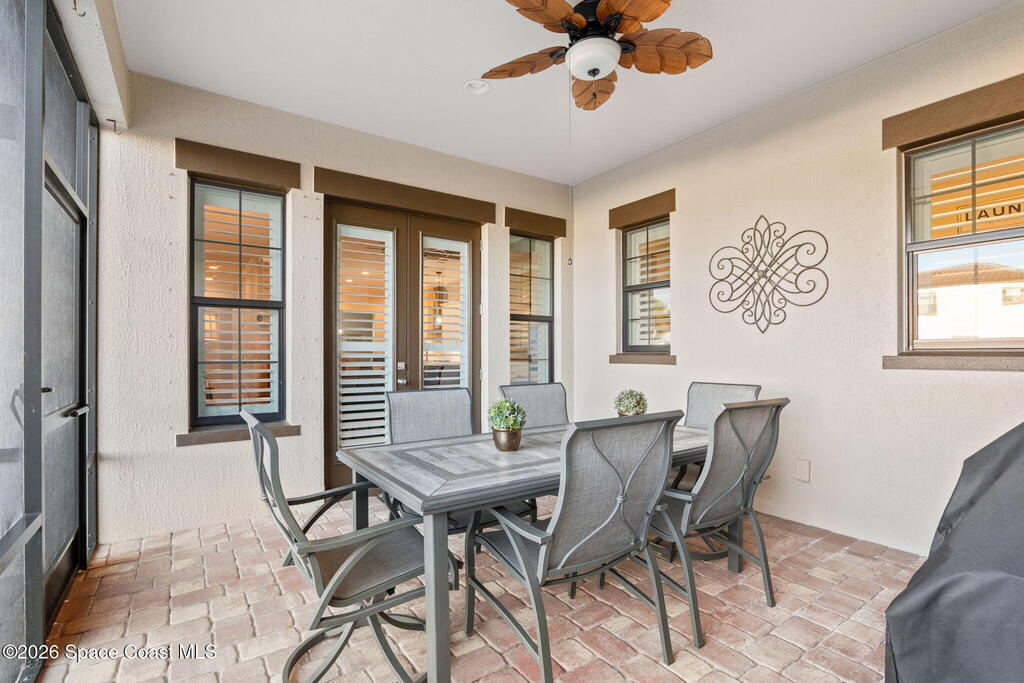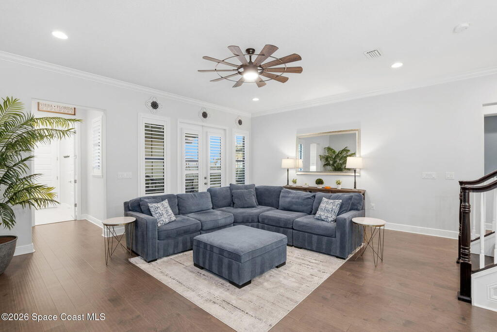 Welcome to maintenance free living in Viera. Impeccably maintained and thoughtfully upgraded, this stunning Almeria model offers 4 bedrooms, 3 full bathrooms, and approximately 2,601 square feet of well-designed living space on a premium corner lot. One of the home's most distinctive features is its private, fenced courtyard, complete with puppy picket fencing, mature clusia privacy hedges, and a generous dog run, creating an ideal setting for pet lovers while providing exceptional privacy for relaxing or entertaining. nside, pride of ownership is immediately evident. The entire first floor showcases upgraded engineered hardwood flooring, enhanced by 8-foot doors, 10-foot ceilings, crown molding, plantation shutters, recessed lighting, and quality ceiling fans throughout. The spacious family room flows seamlessly to the screened lanai, which is already equipped with a natural gas hookup for a future summer kitchen or grill, plus plumbing in place for a sink, making outdoor