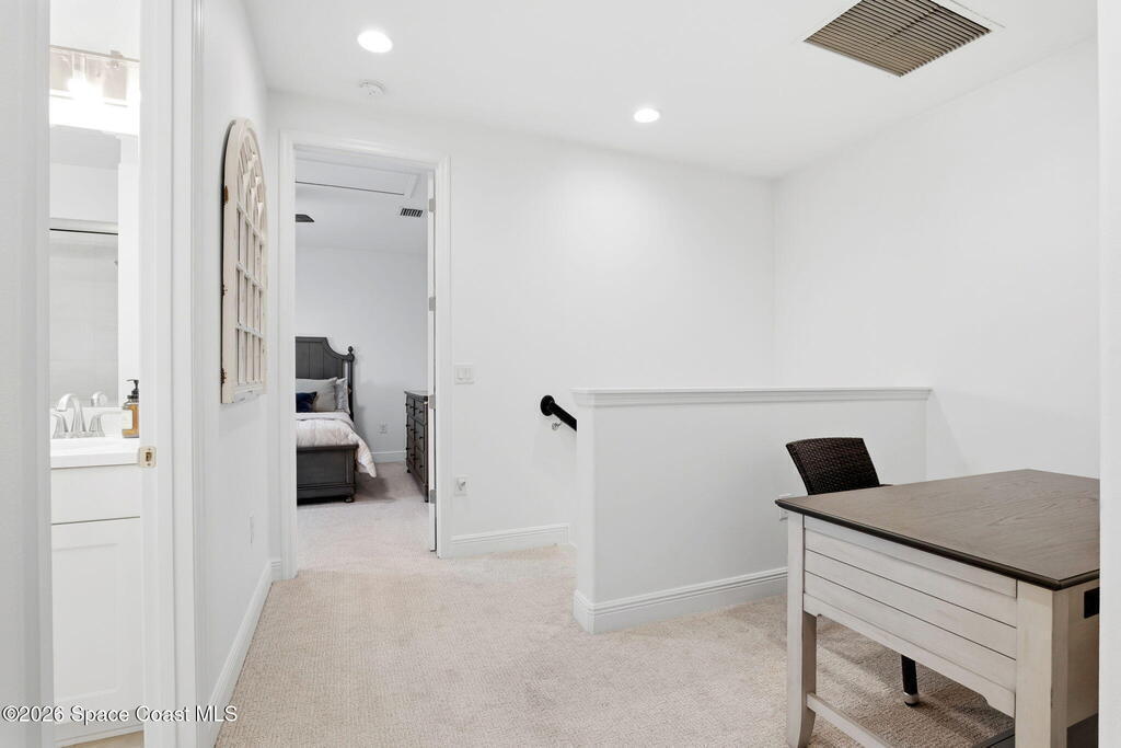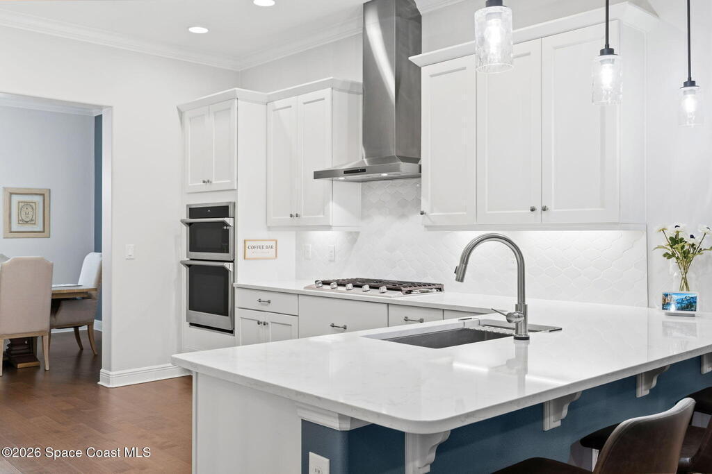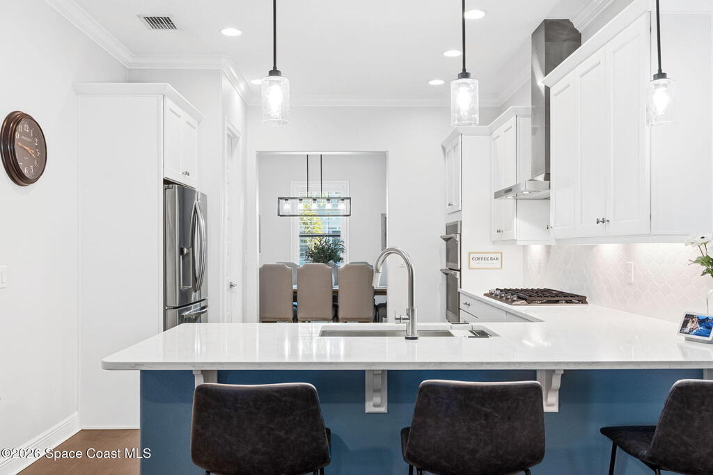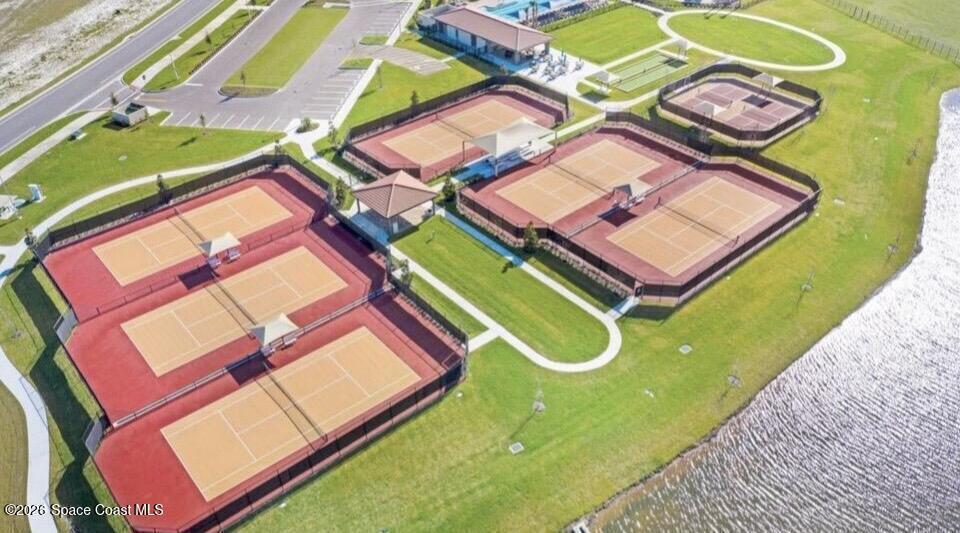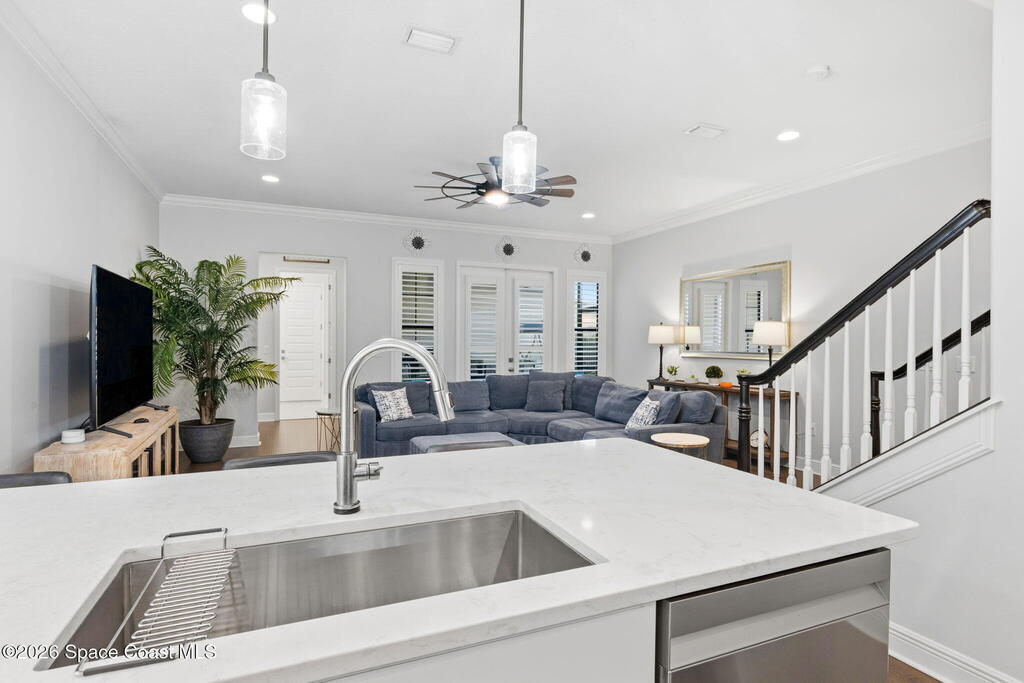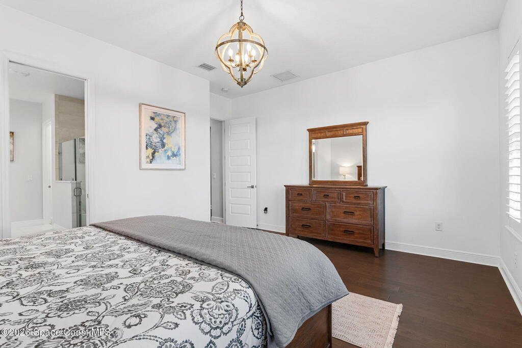 Welcome to maintenance free living in Viera. Impeccably maintained and thoughtfully upgraded, this stunning Almeria model offers 4 bedrooms, 3 full bathrooms, and approximately 2,601 square feet of well-designed living space on a premium corner lot. One of the home's most distinctive features is its private, fenced courtyard, complete with puppy picket fencing, mature clusia privacy hedges, and a generous dog run, creating an ideal setting for pet lovers while providing exceptional privacy for relaxing or entertaining. nside, pride of ownership is immediately evident. The entire first floor showcases upgraded engineered hardwood flooring, enhanced by 8-foot doors, 10-foot ceilings, crown molding, plantation shutters, recessed lighting, and quality ceiling fans throughout. The spacious family room flows seamlessly to the screened lanai, which is already equipped with a natural gas hookup for a future summer kitchen or grill, plus plumbing in place for a sink, making outdoor