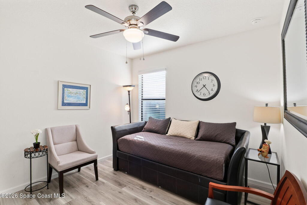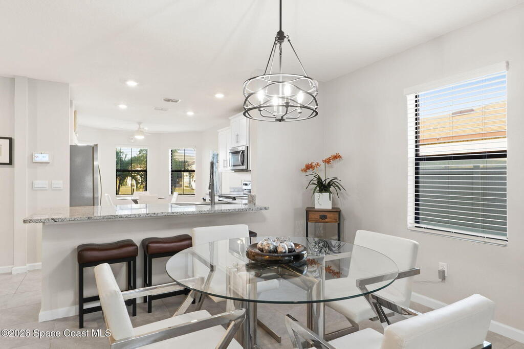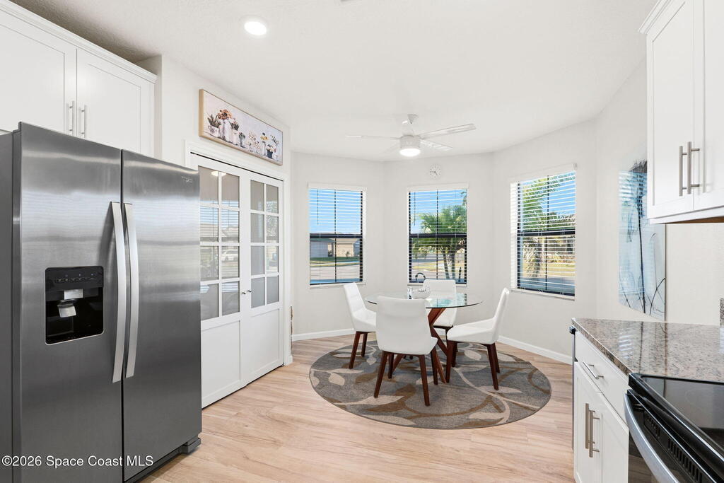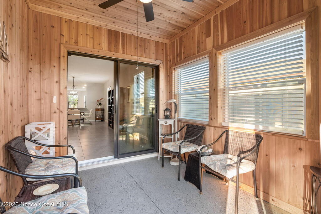 Better than new and lovingly maintained by the original owner! This beautifully customized home offers comfort, style, and thoughtful design. The kitchen features stainless steel appliances, a custom built-in pantry, upgraded sink, and an eat-in area with bay windows. Cosmetic updates include vinyl flooring in the bedrooms, modern ceiling fans, and stylish light fixtures. Accessibility-focused enhancements include widened (3 ft) access to the kitchen, primary bedroom, and primary bathroom with a large upgraded shower and grab bars in both the shower and toilet areas. The enclosed porch features impact windows and custom wood paneling for a spa-like feel. Located in the Crystal Bay community with clubhouse, pool, fitness center, pickleball and bocce courts, dog park, and proximity to the Indian River Lagoon.