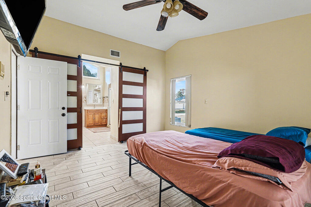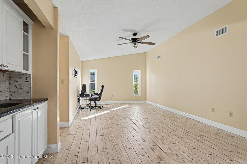 Solid block and stucco home offering 2,132 sq ft of living space with extensive upgrades completed in 2022, including a new roof, HVAC system, windows, and fresh interior and exterior paint. Electrical has been updated, ceiling fans replaced, and tile work completed in the bathrooms. The kitchen features custom cabinetry, adding both style and functionality. The Florida room has been fully enclosed and brought under air, creating additional usable living space. Sliding doors were replaced with modern glass doors, and the garage is finished with tile flooring. Conveniently located near shopping, dining, malls, parks, and local attractions, with easy access to major roadways. Enjoy a short drive to Florida's Space Coast beaches, offering the best of coastal living with everyday convenience.