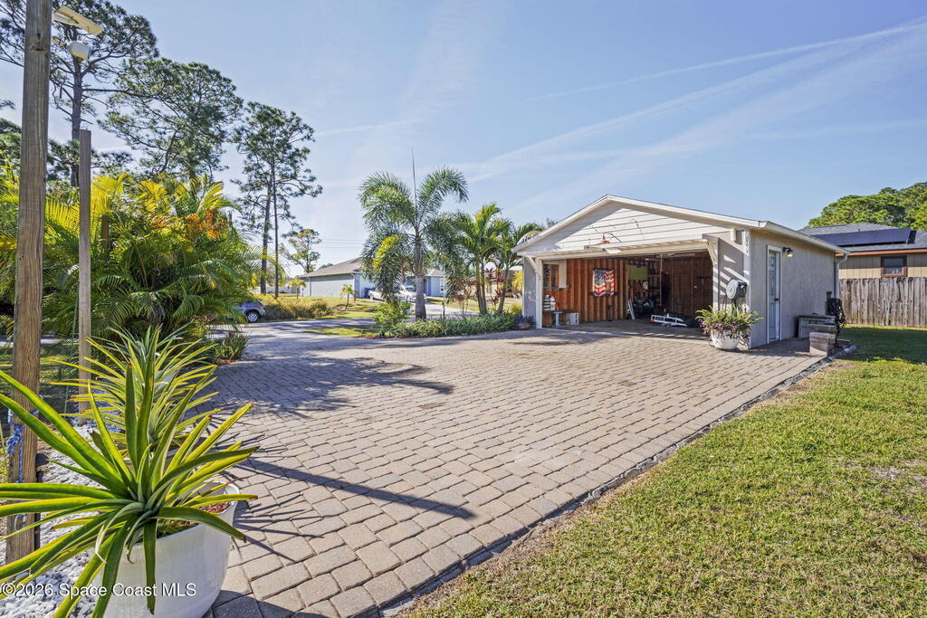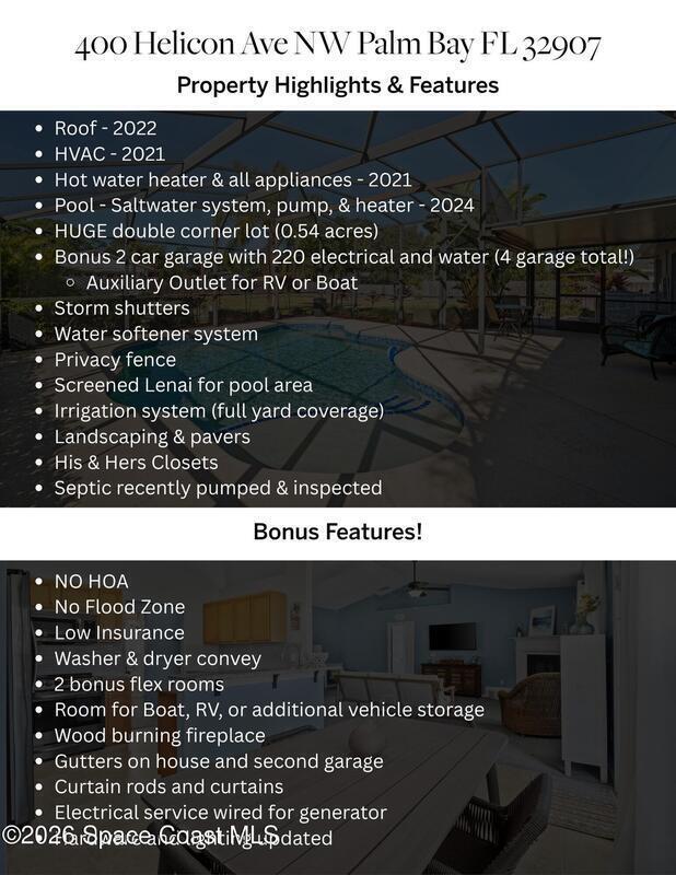 This is the one you've been waiting for... Set on a rare 0.54-acre double corner lot, 400 Helicon Ave delivers space you just don't find in this area--plus serious parking and storage. Enjoy a detached 2-car garage (bringing 4 total garage bays) with 220V electric & water, a second driveway, and an auxiliary outlet--perfect for a workshop, boat, truck, or RV. Unwind in the flawless screened, covered lanai overlooking a heated saltwater pool with a new pump/salt system (2024). The inside is meticulously maintained and features vaulted ceilings, a cozy wood-burning fireplace, 2 flex rooms, and his & hers closets. Big-ticket updates include HVAC (2021), roof (2022), water heater + appliances (2021), and recently pumped and inspected aerobic septic. Full-yard irrigation, privacy fencing, storm shutters, water softener system, NO HOA, no flood zone, and low insurance complete the package. At this price, there is literally nothing comparable on the market.