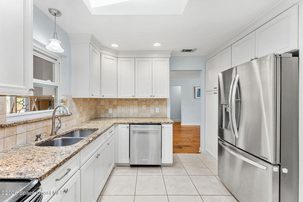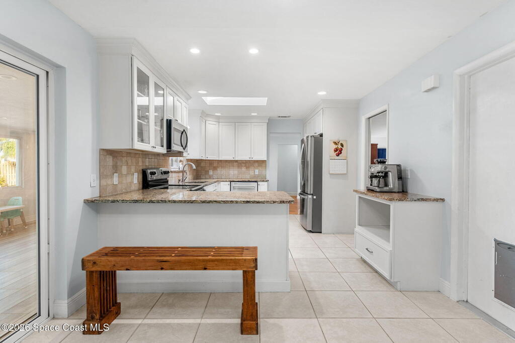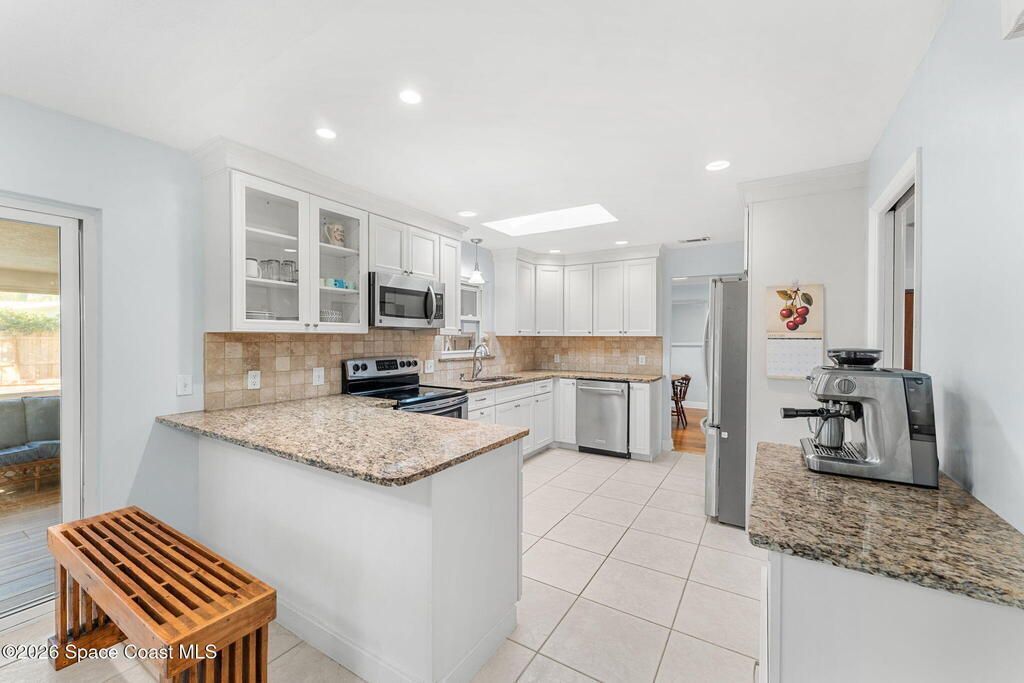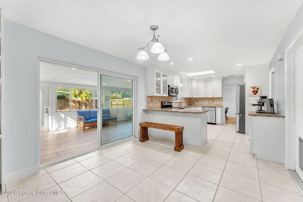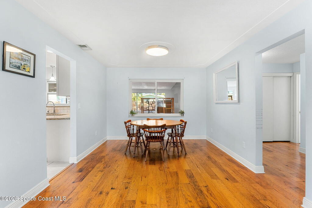 Just minutes from the beach & bursting w/Florida energy, this radiant, refreshed pool home hits differently from the second you step inside, with wood & tile floors running throughout, smart upgrades in every space & natural light spilling in like it was invited. The kitchen brings both polish & practicality w/ granite counters, a tile backsplash, SS appliances, white soft-close cabinetry, plus a sunny skylight that keeps everything glowing all day long. A cozy breakfast nook features built-in shelving for extra charm & function, while the Florida room adds that bonus hangout space everyone wants. The owner's suite feels private & pulled-together, offering direct access to the Florida room, a statement dimensional wood accent wall, a walk-in closet & an ensuite w/a tiled shower. One of the guest bdrms includes built-in shelving too, adding even more personality. Plus a full guest bath w/ tub/shower combo. Sellers currently paying a low $3,100 for homeowner's insurance!