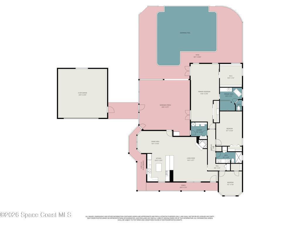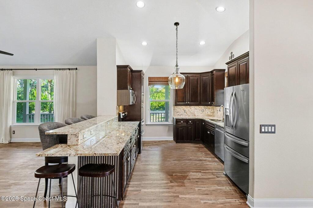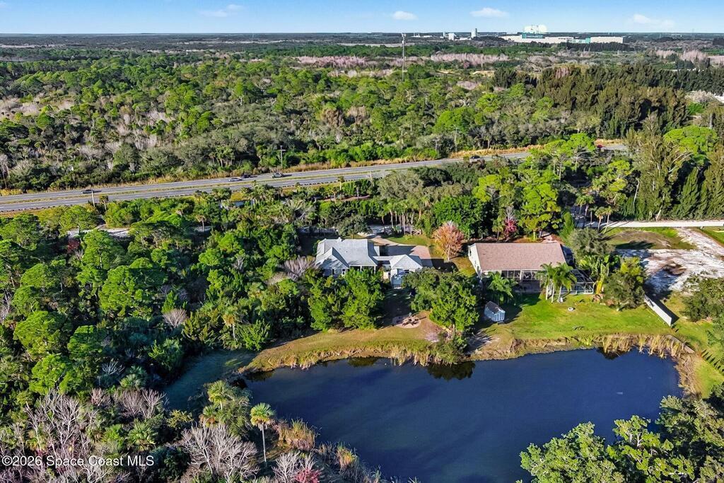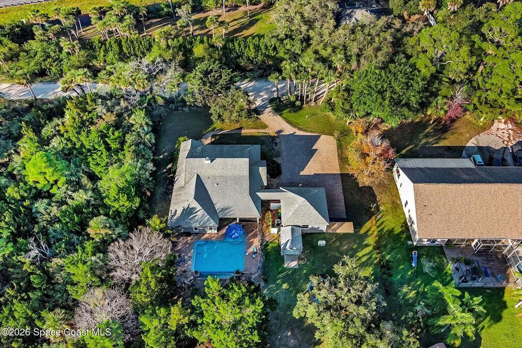 Nestled among established trees and classic Florida landscapes, you'll find this 3/2, 2,204 sqft concrete block home on over an acre. The oversized rear porch extends your living space for entertaining purposes or to create a peaceful retreat in your own backyard. Through the automated retractable screens, you'll find an electrically heated, salt cell infinity pool and a paved firepit area out by the pond. A new roof was put on the house and garage in 2022. Inside, you'll find hurricane windows and doors (2017), a newer kitchen with custom pullouts, updated bathrooms (2023), a wood burning fireplace, and LVP floors throughout. There is a whole house generator to help you feel confident when storms come through, plus the home is built on an elevated stem wall. The over 600 sqft garage provides an abundance of storage or work space, and is equipped with a 30AMP hookup ready for your RV. Located just over 5 minutes from Kennedy Space Center, SpaceX, etc. More info in documents section.