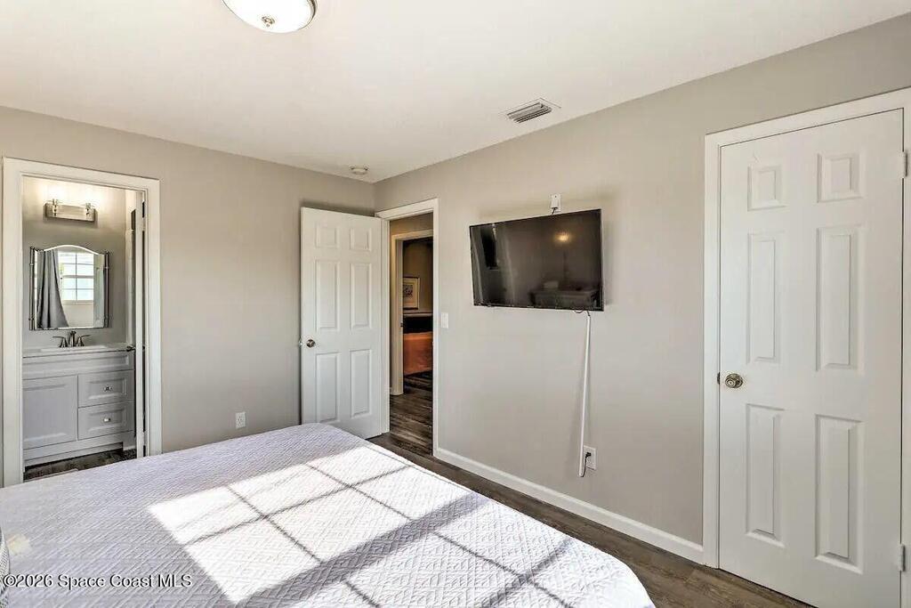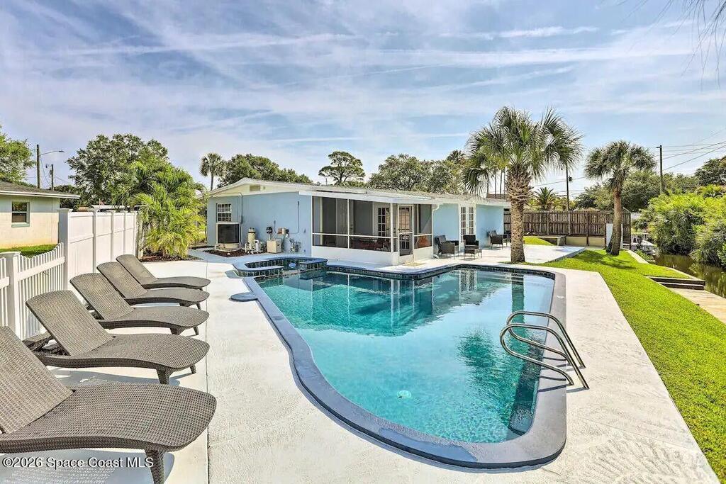 Beautiful canal-front home located in desirable Surfside Estates featuring open-concept living perfect for everyday comfort and entertaining. The kitchen offers granite countertops, a stylish backsplash, and a large island overlooking the main living space. Two bedrooms include private en suite bathrooms, ideal for guests or flexible living arrangements. Enjoy outdoor Florida living with a private dock for a small boat and a lower platform for easy kayak or paddleboard access. The backyard oasis includes a pool with heated spa and a spacious patio for relaxing or hosting. An oversized one-car garage provides ample storage. Additional highlights include a new roof in 2020 and a convenient location near Blue Origin, NASA, and other space industry employers, with easy access to Orlando and its world-class attractions. This canal-front retreat is a rare opportunity not to be missed!