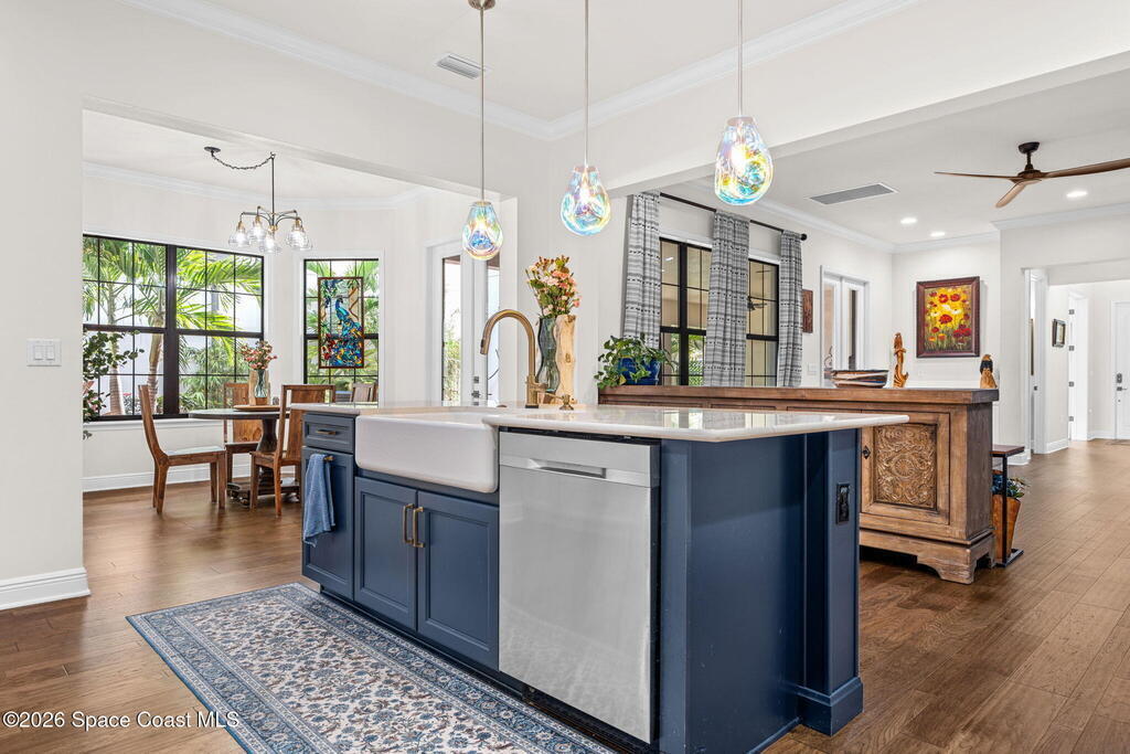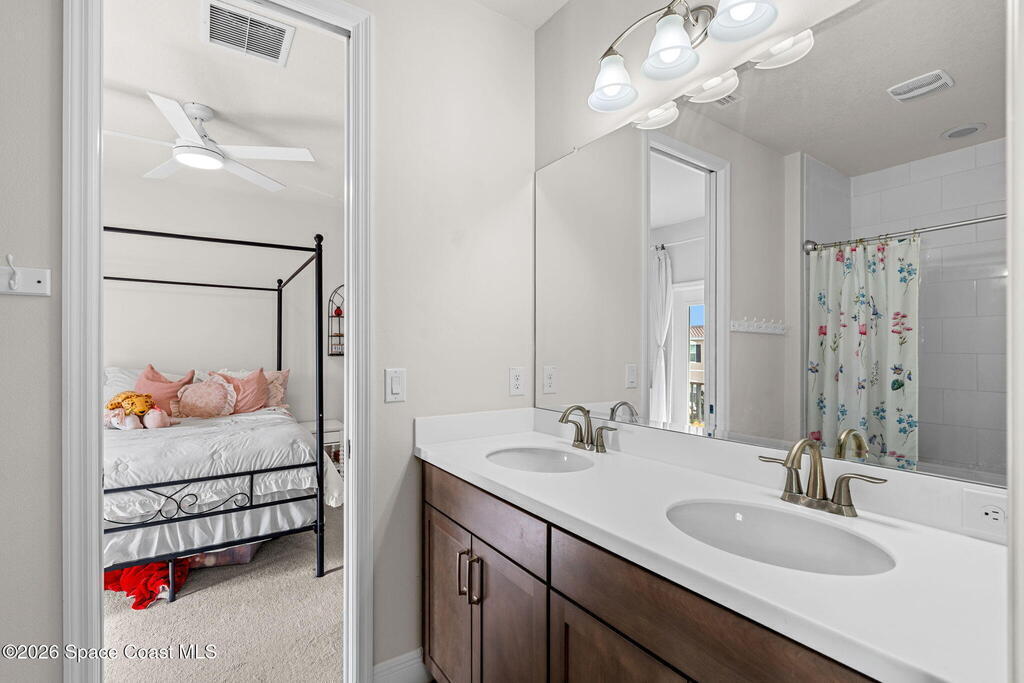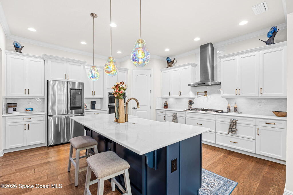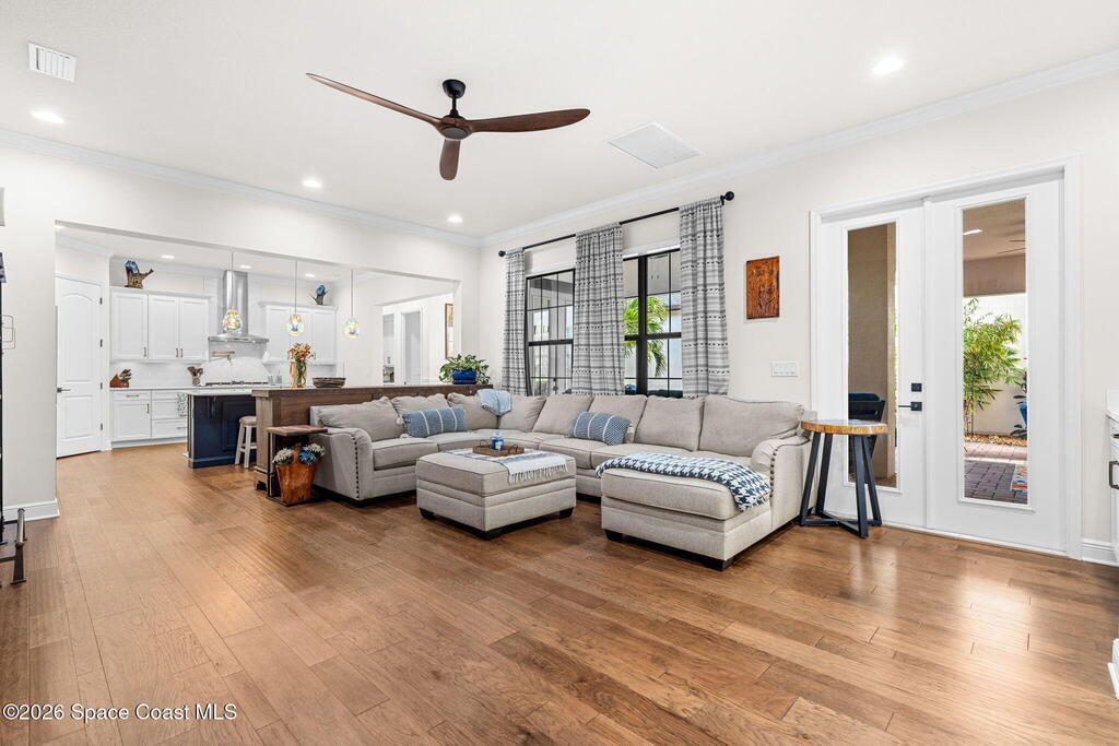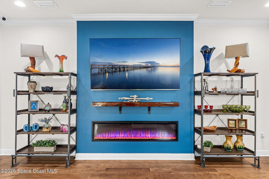 Motivated seller! Built in 2023 this Brevard County home has thousands in upgrades. This Mecina II (Castillo Series) stunner offers 4BR/4BA and 2,950 SF of bold design, smart tech & low-maintenance living in Reeling Park. 8-ft interior doors w/ black hardware, crown molding & wood-look tile elevate the main level, anchored by a dramatic 6-ft linear electric fireplace w/ walnut/iron mantel. The gourmet kitchen steals the show w/ quartz counters, designer backsplash, custom island w/ hand-blown Hawaiian lava pendants, built-in refrigerator, wall oven/micro combo, 36'' natural gas cooktop w/ pot filler & Samsung Bespoke smart appliances. Primary suite is downstairs w/ his-&-hers showers & vanities + huge walk-in closet. Main level also features a private office + custom laundry w/ sink/storage. Courtyard, impact windows & storm shutters complete the hurricane-ready package. Amenity-rich community includes pool, pickleball, tennis, fitness center, clubhouse, jogging path, playground & more