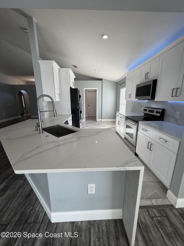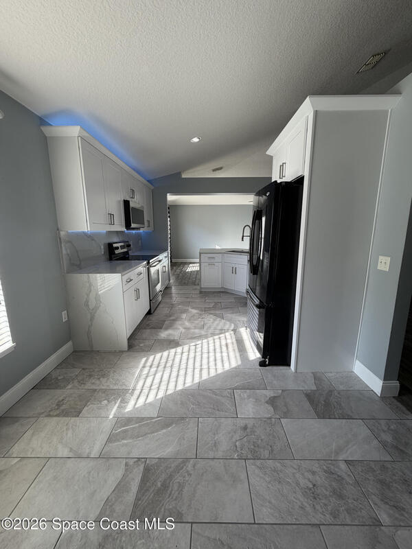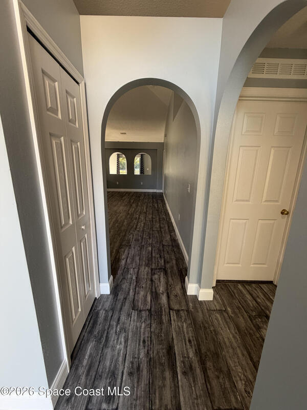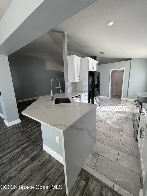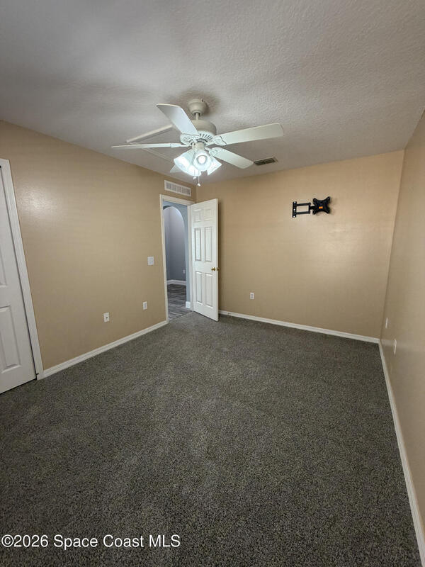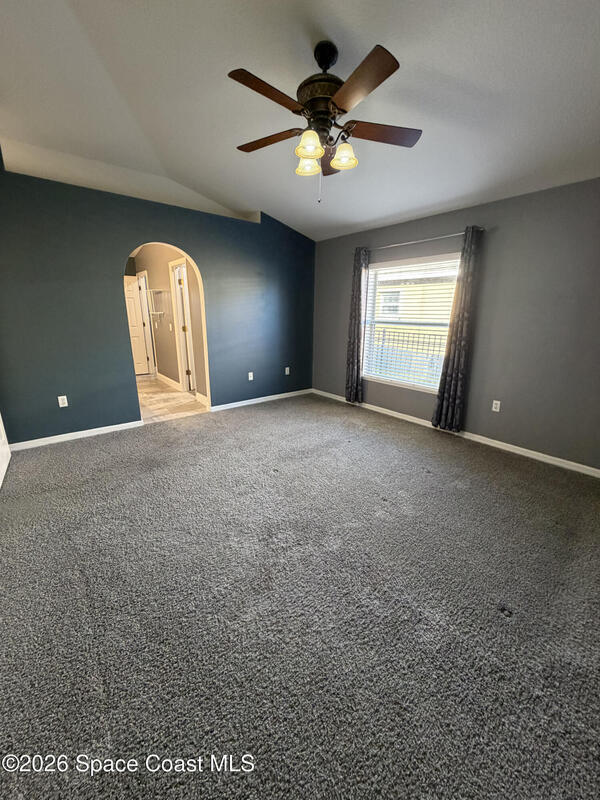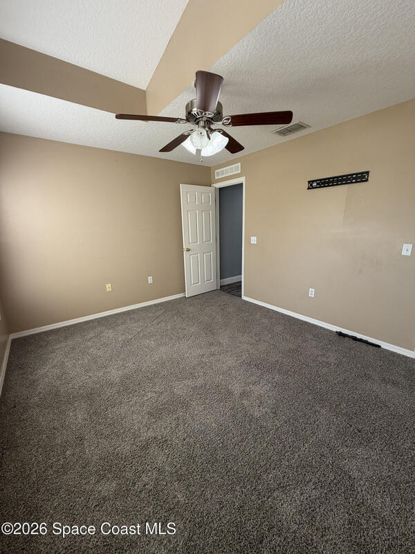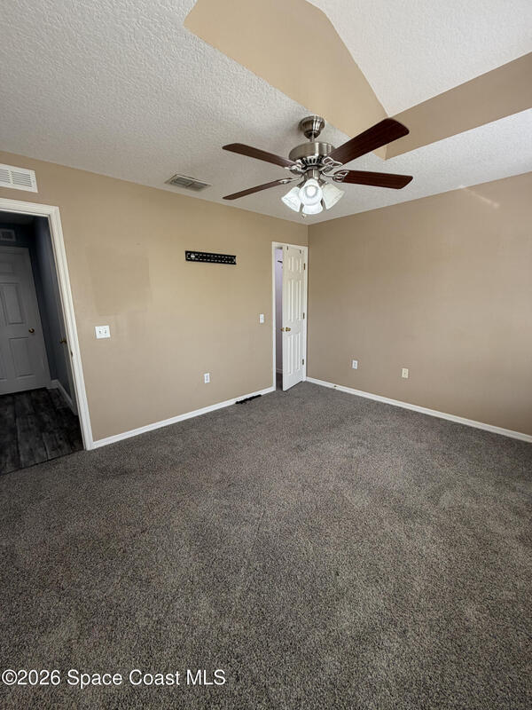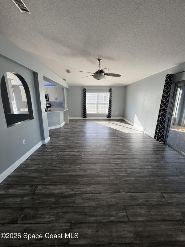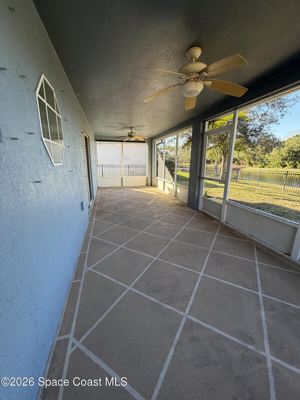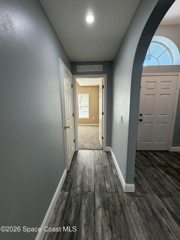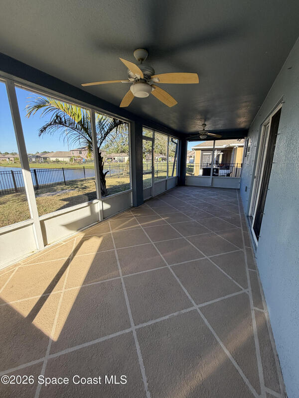 Updated home in the highly sought after community of Adamson Creek near Canaveral Groves in Cocoa. 3-bedroom, 2-bathroom, waterfront with fountain, no backyard neighbors, and multiple living areas and updates throughout. White shaker cabinetry with soft-close, quartz countertops, LED cabinet lighting, and tiled floors throughout the kitchen and bathrooms. Grey, engineered wood, flooring throughout the living areas and newer carpet in all bedrooms. Master en-suite offers vaulted ceilings, walk-in closet, garden tub, and custom tiled shower with seamless glass doors. Fully trussed, 10'x20', screened in back porch overlooking the wrought iron fenced in backyard overlooking the lake with fountain, walking trail, and fishing pier. HOA amenities include community pool, walking trails, playground, and more. 2025 AC, hurricane shutters, MyQ garage door opener, and a well maintained home. Owner will include basic lawn care and HOA fees included in the rental price.